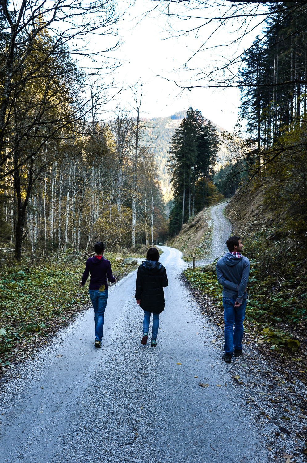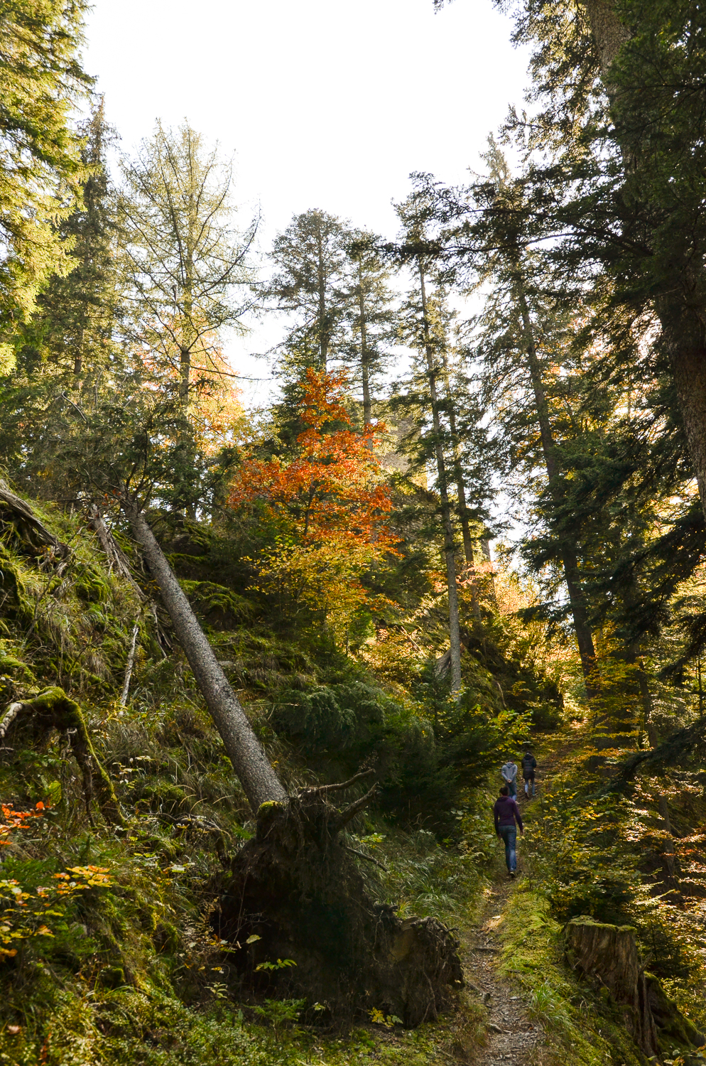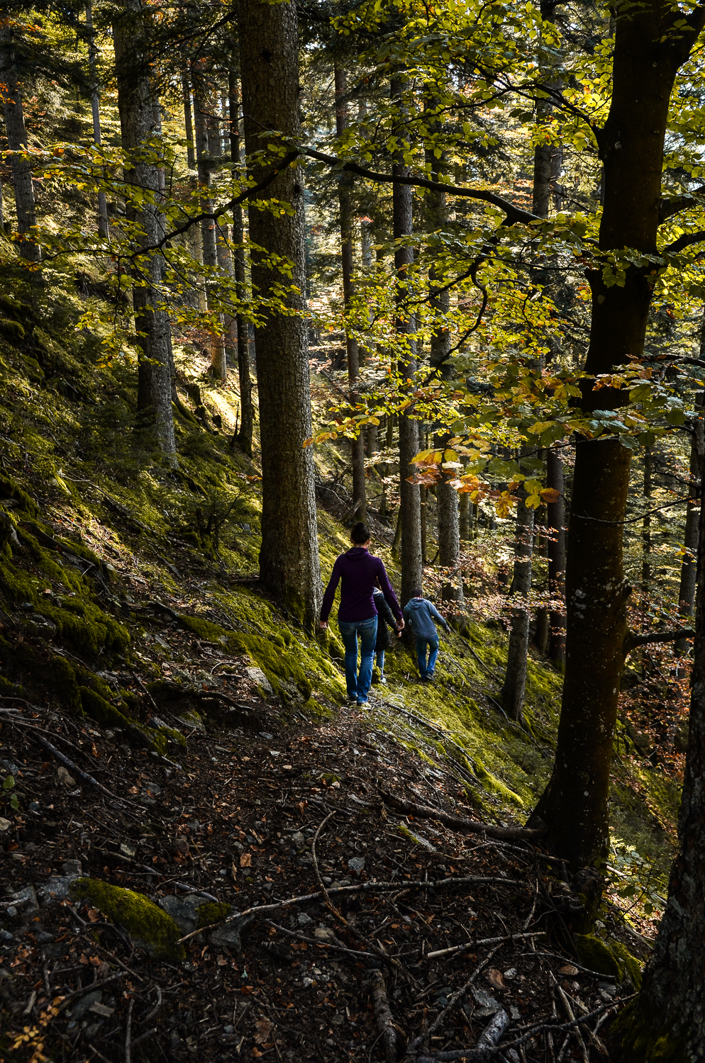 Als Abstieg haben wir dann den Pfad durch den Steilwald genommen – es gibt zwar ein ausgetretenes Wegerl, aber bei nassen Verhältnissen oder wenn Schnee liegt, rate ich davon eher ab. Rutschige Wurzeln, lose Steine und Moos können sehr schnell zur Stolper- oder Rutschfalle werden und sofern man dann keinen Baum touchiert, wartet ganz unten der Bach auf den verletzten Wanderer.