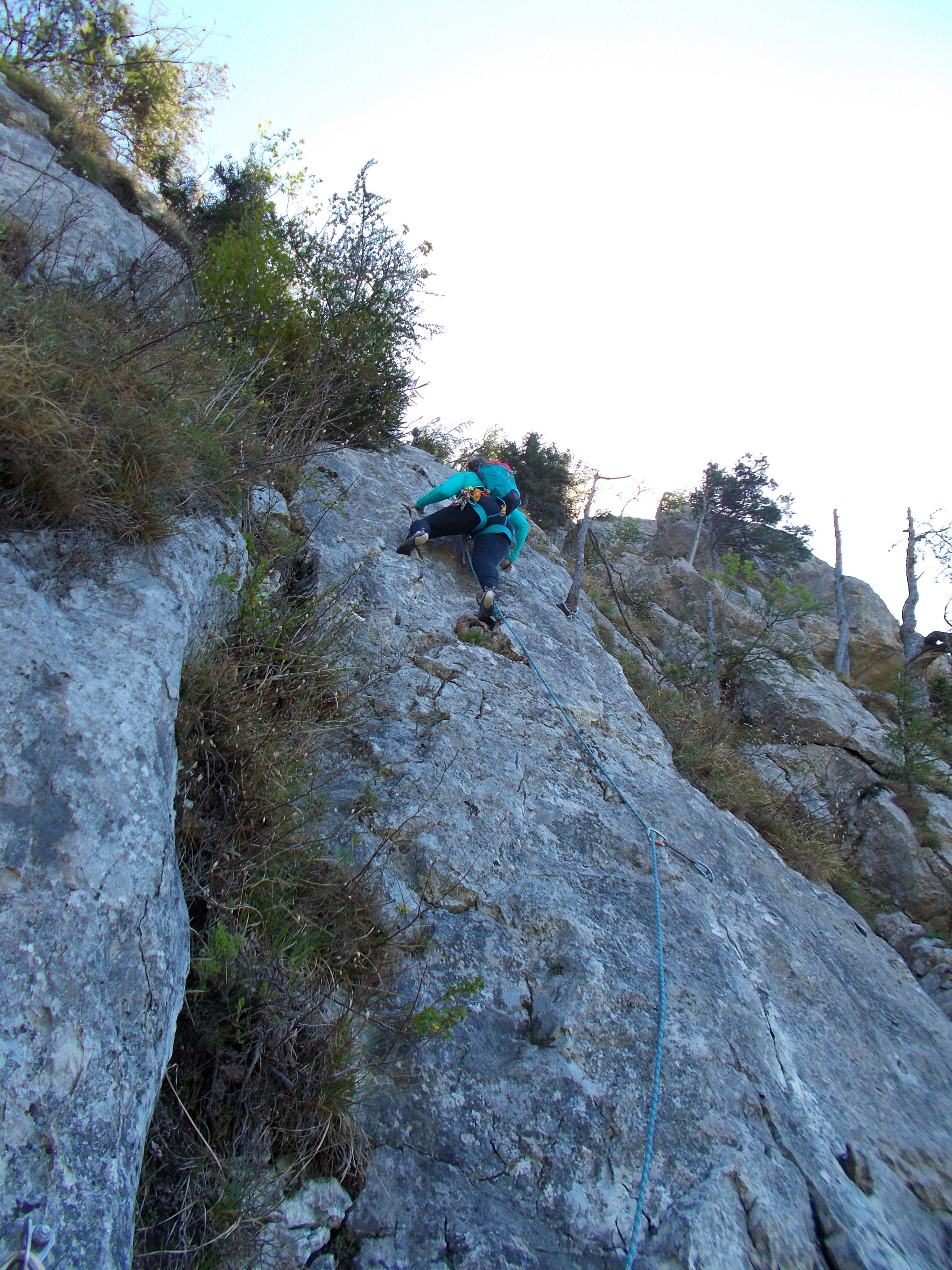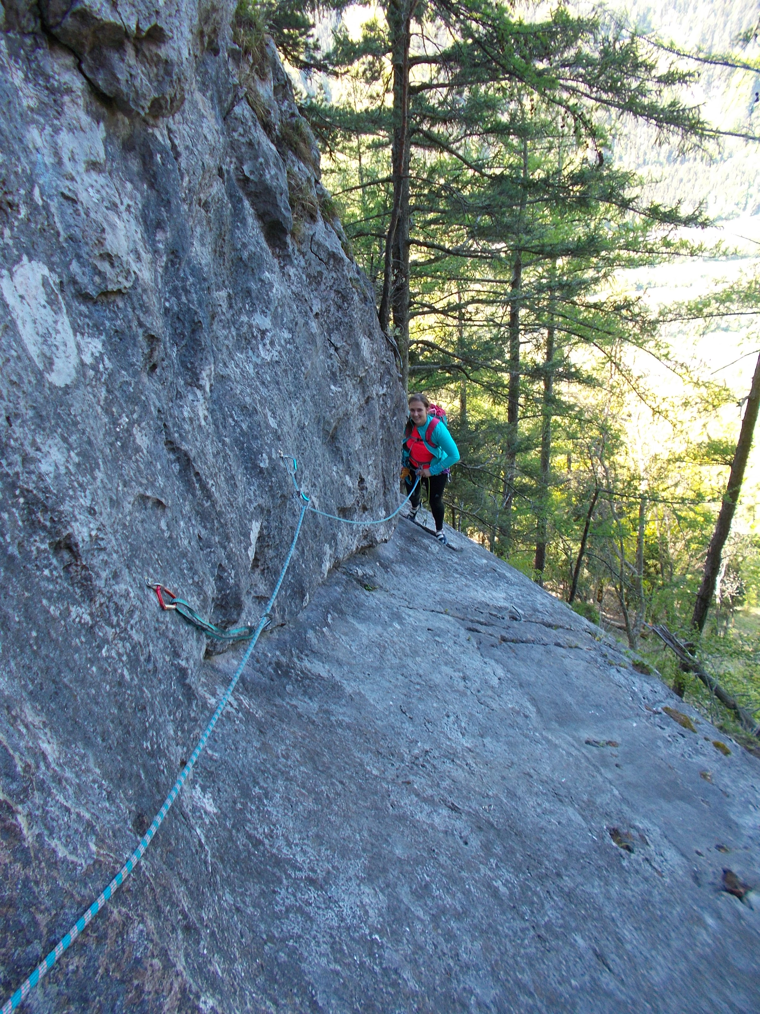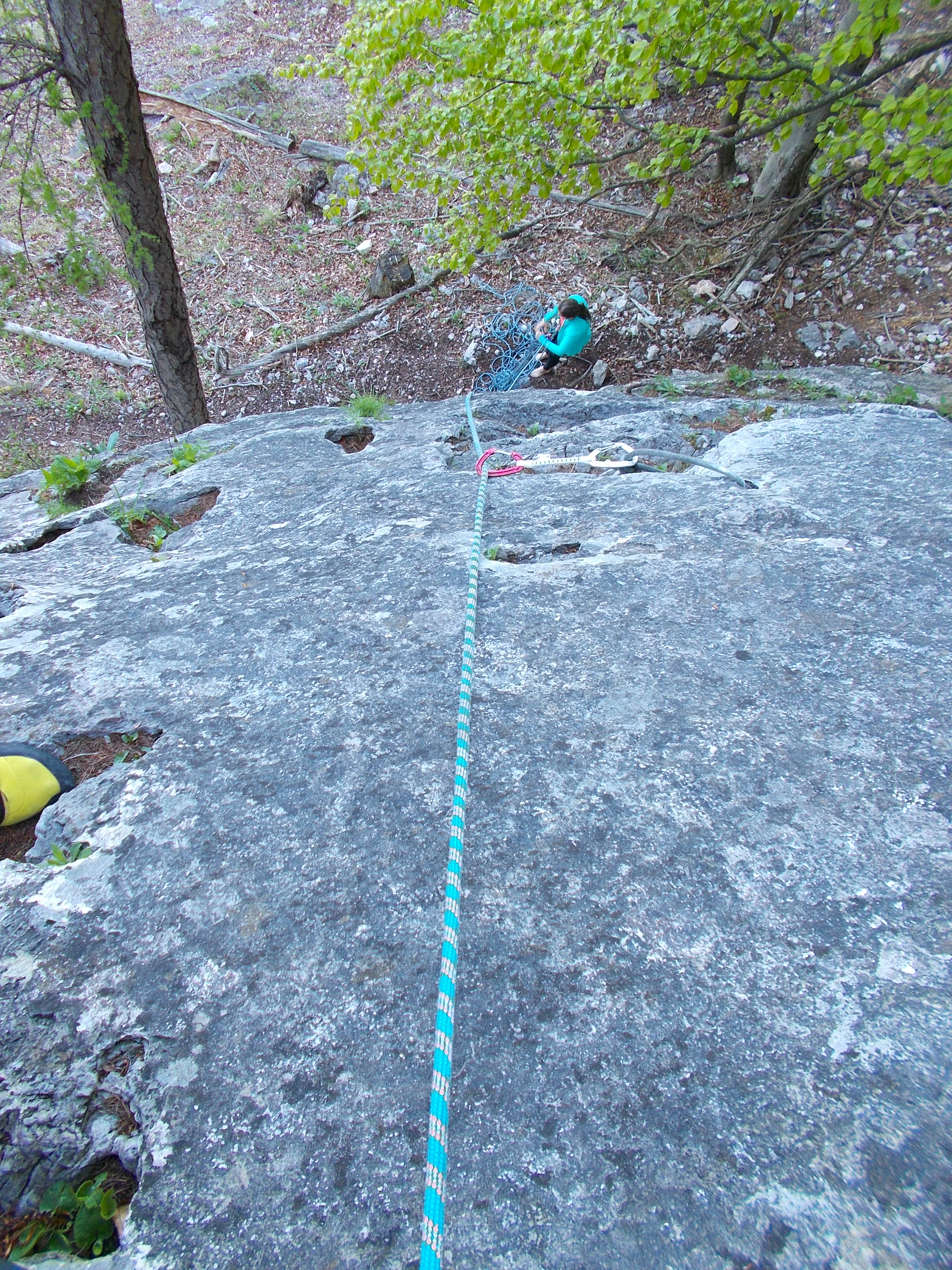 Auf Grund der westseitigen Ausrichtung kletterten wir bis zur 7. Seillänge im Schatten und es war recht kühl. Die Route läßt sich auch sicher gut an einem heißen Sommertag am Vormittag klettern, bevor die Sonne in die Wand kommt. Übersehen haben wir den 2. Stand, da dieser an einem Baum mit einem Seilrest gemacht werden soll. Paula ist aber einfach weitergeklettert und mit einem 60m Seil gehen sich die 2.+3. Seillänge auch in einem Aufwasch aus – lediglich die Seilreibung und die vorhandenen Exen können einen da ein wenig fuxen.