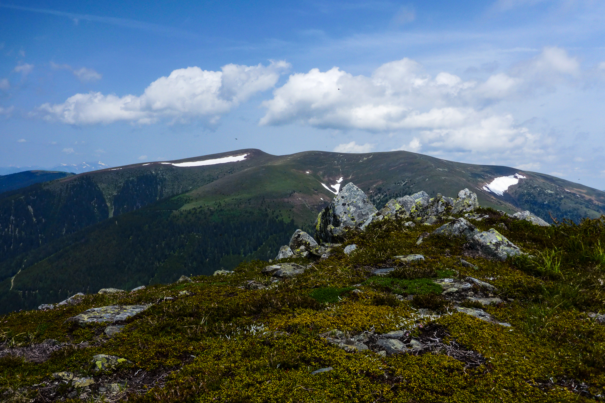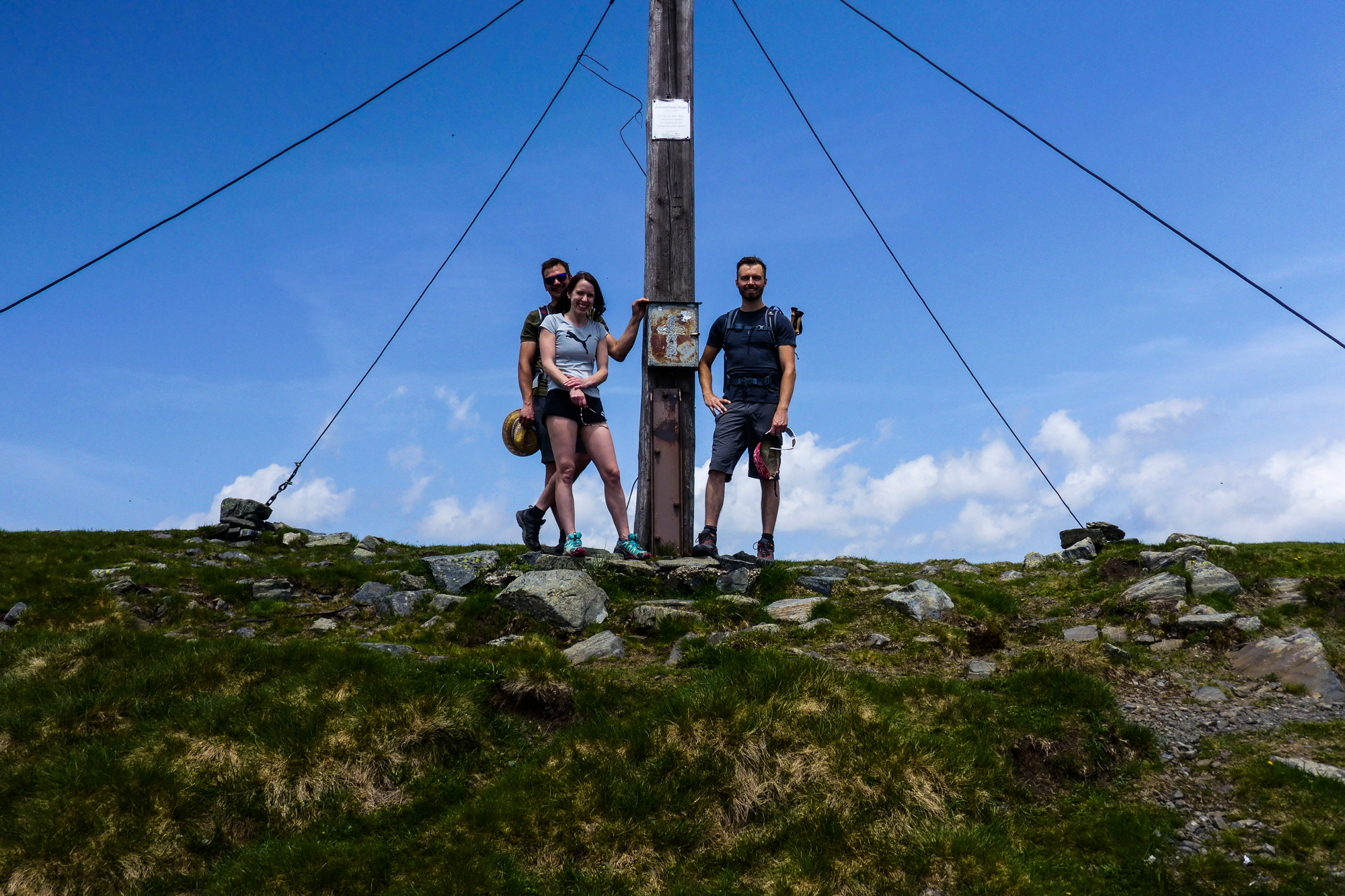 Der letzte Anstieg zum Roßbach-Pussor-Kogel ist dann keine große Herausforderung mehr und pünktlich nach 2,5 Stunden stehen wir am Gipfelkreuz. Ein tolles Panorama mit Ausblick zu den letzten Schneefeldern auf der Gleinalm bietet sich und obwohl die Fernsicht heute nicht ideal war, war der Ausblick doch herzerwärmend.