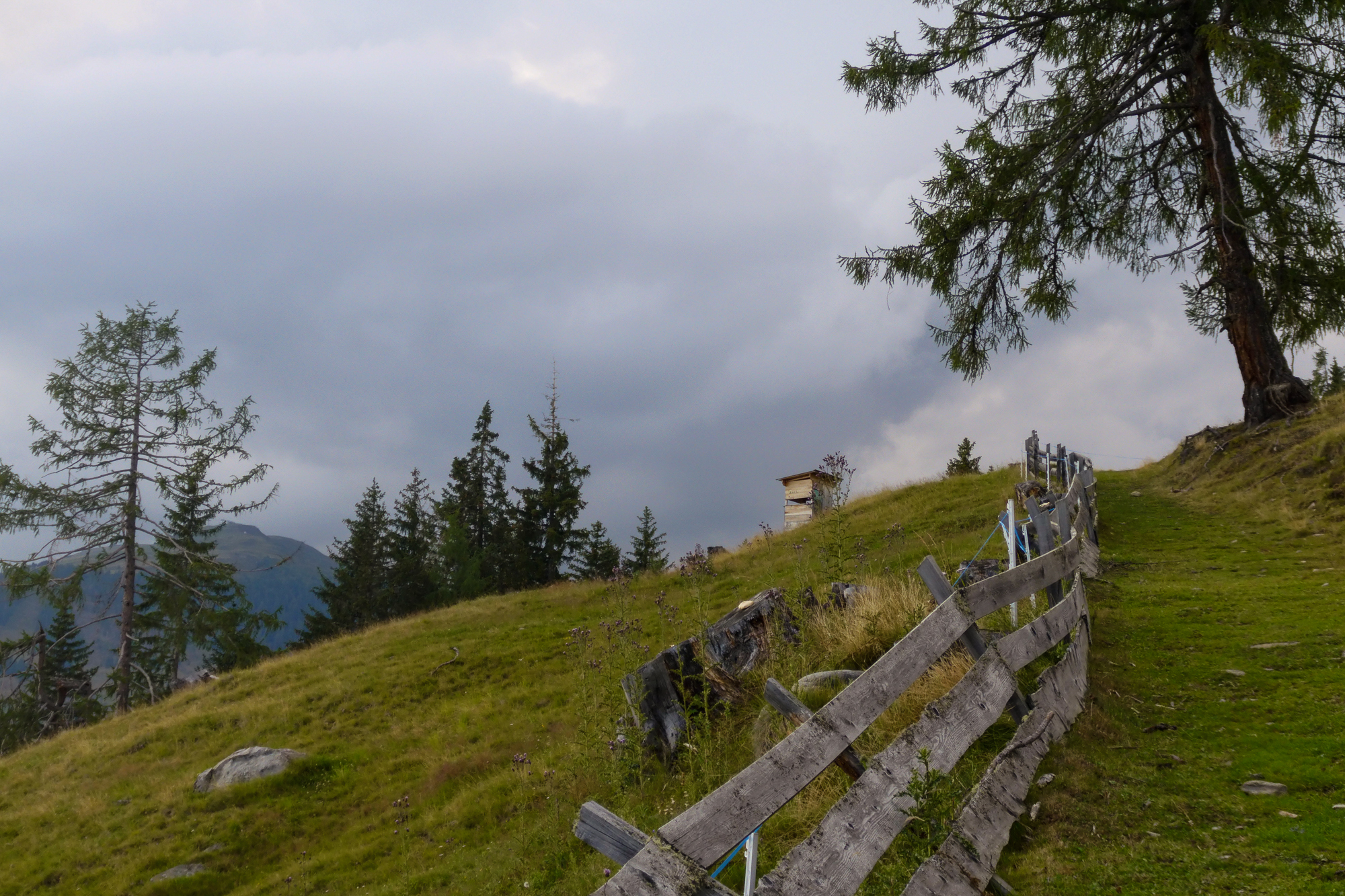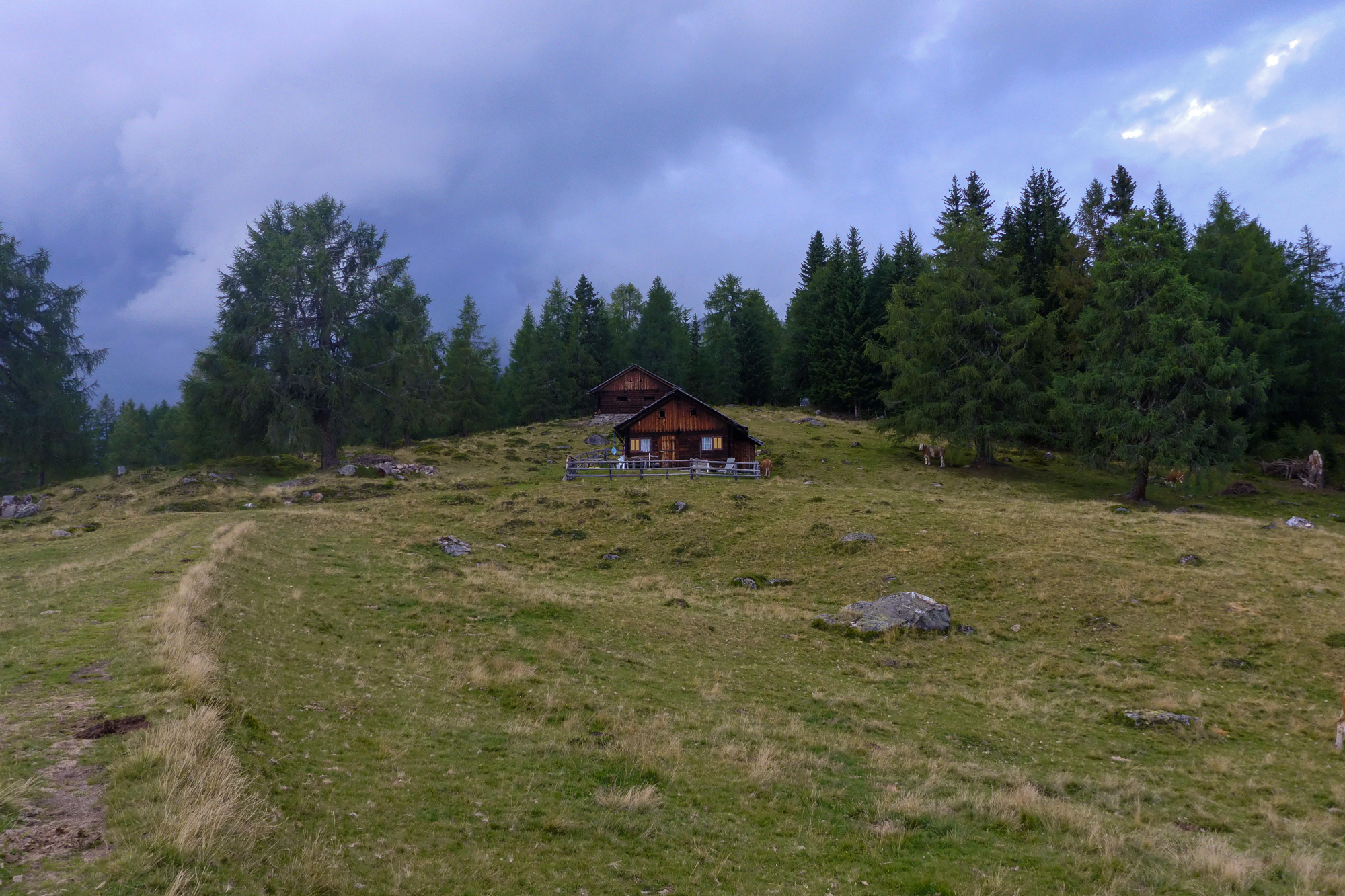 Zuerst bei Sonnenschein stiegen wir über Wiesen und Wälder leicht steigend bergauf. Die Zeit bis zur Winklerner Alm betrug lediglich 2,5 Stunden. Da sich aber nach dem halben Weg der Himmel zu verdunkeln begann und Donnergrollen hörbar wurde, legten wir einen Zahn zu.