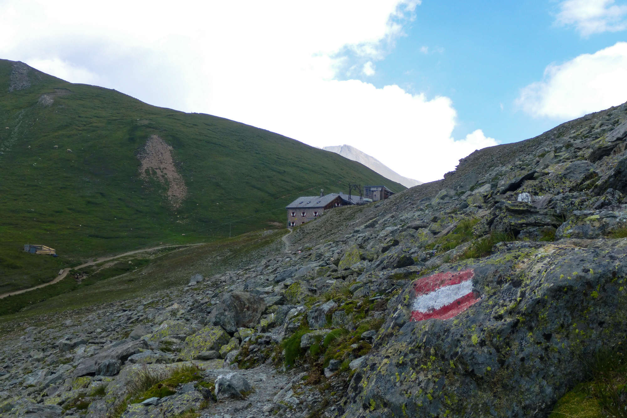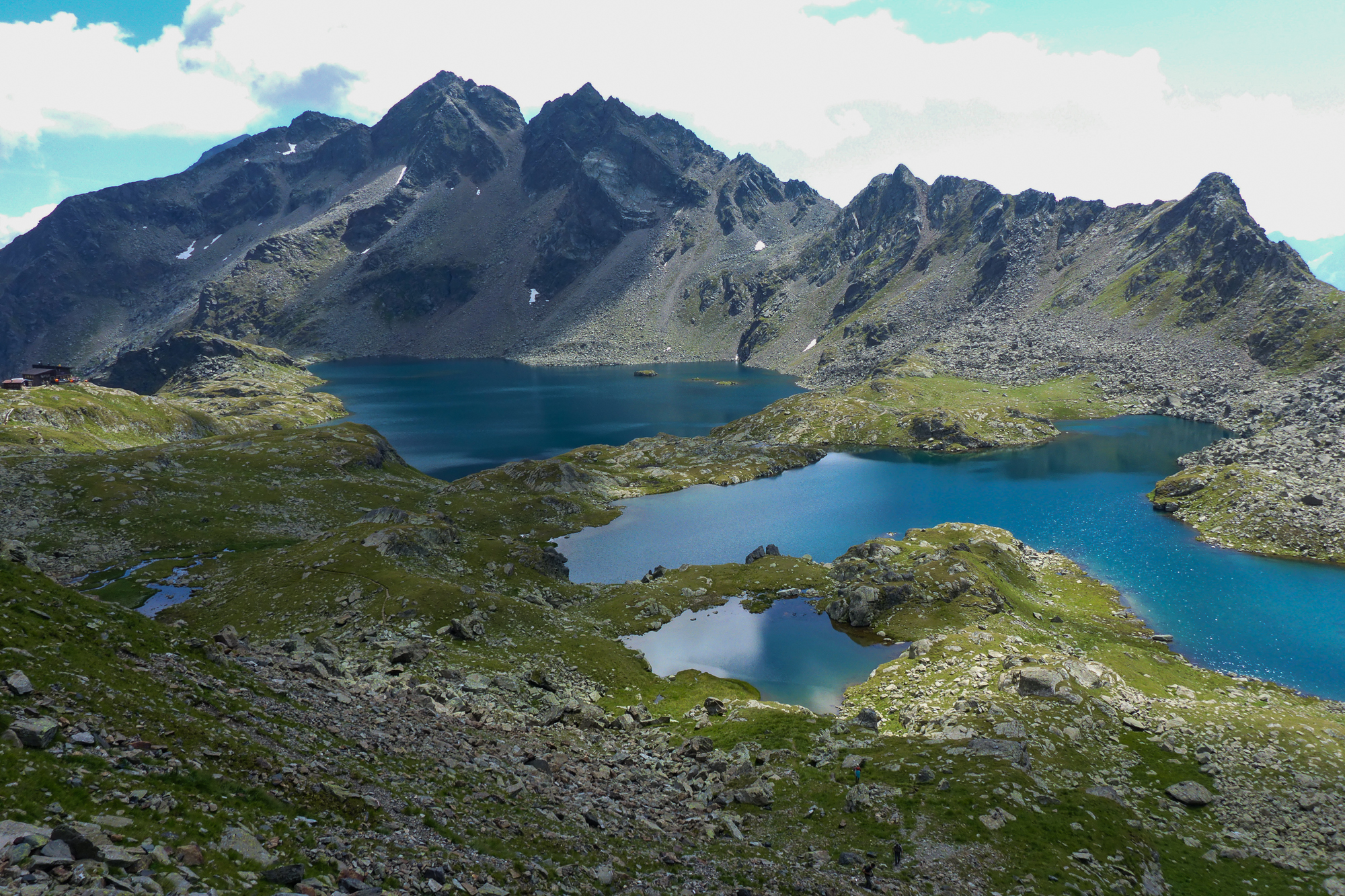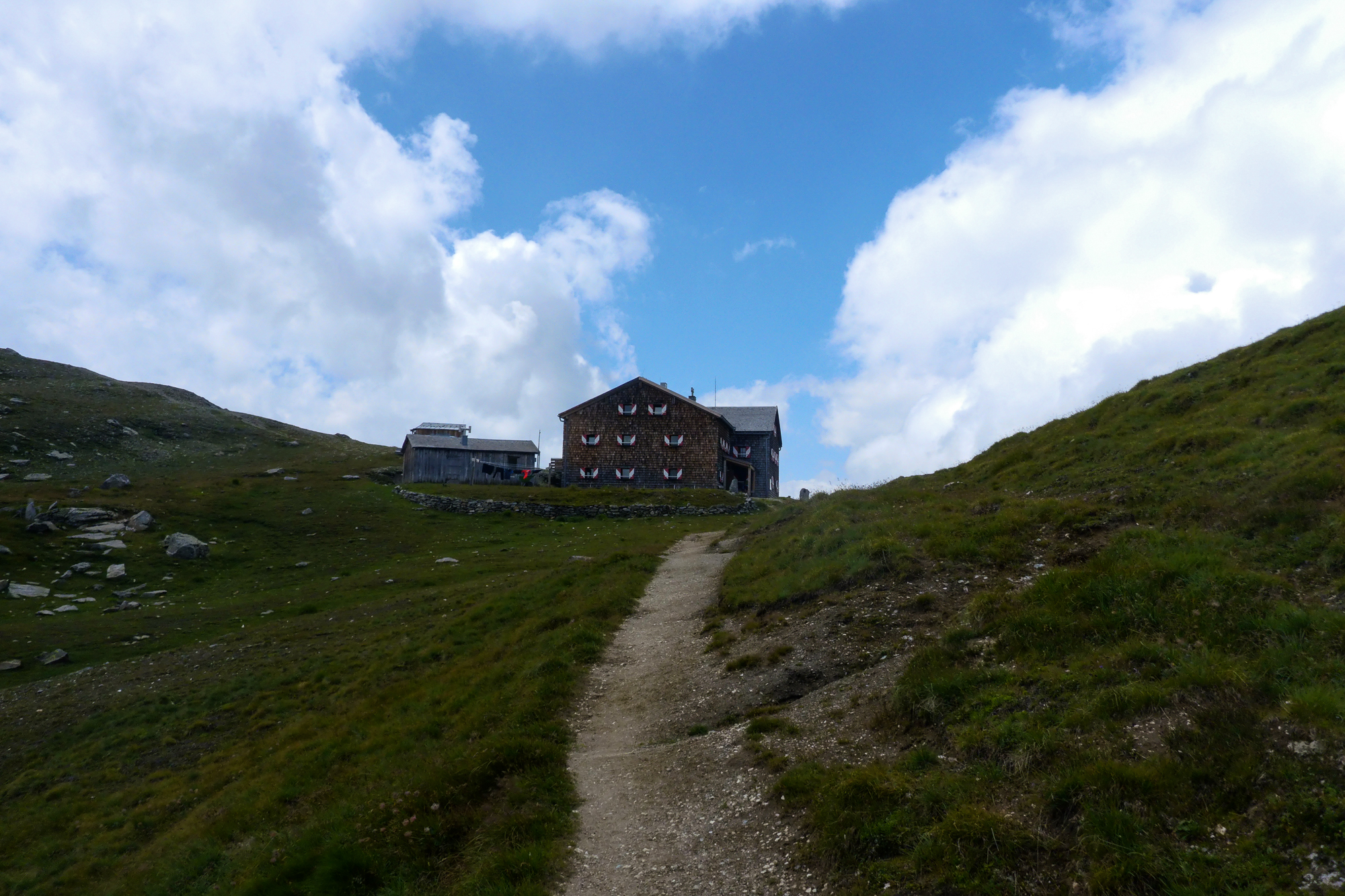 Von der Scharte sieht man schon die Wangenitzseehütte, der Abstieg hat sich dann doch noch etwas gezogen. Kurz überlegten wir, gleich weiter zu gehen, damit wir der Gewittergefahr am Nachmittag entgehen. Aber wir beide konnten wirklich eine Pause vertragen, nachdem wir dank des Schnarchers noch immer ziemlich abgerockt dreinschauten und die Terrasse der Wangenitzseehütte sah einfach zu einladend aus.