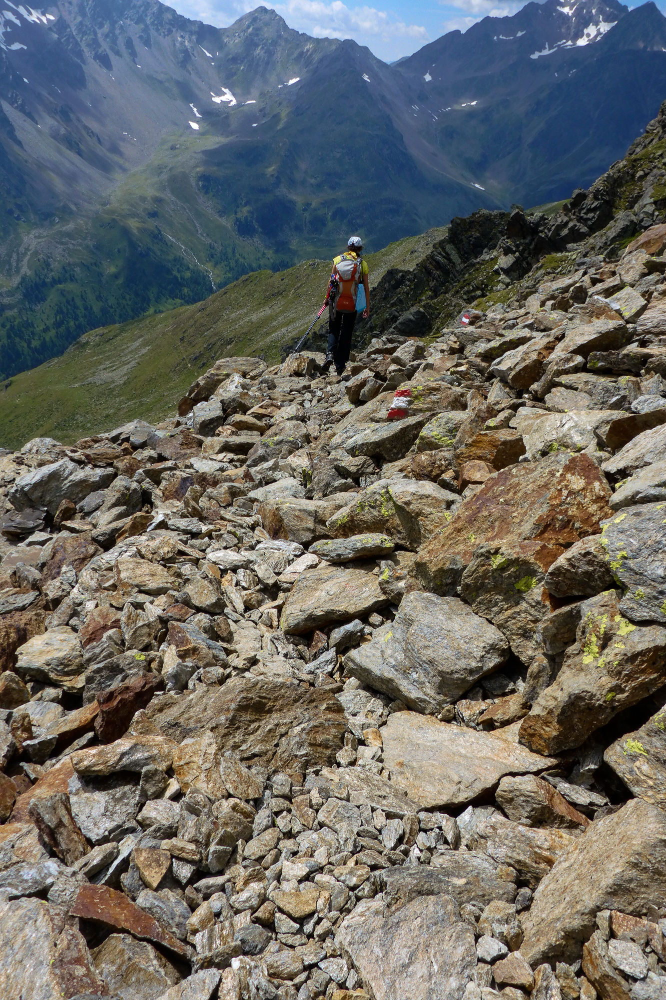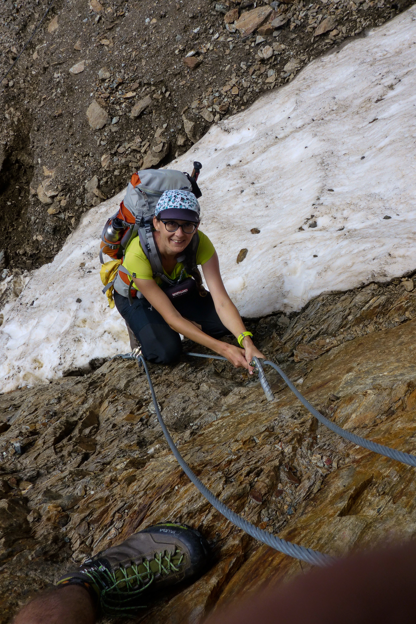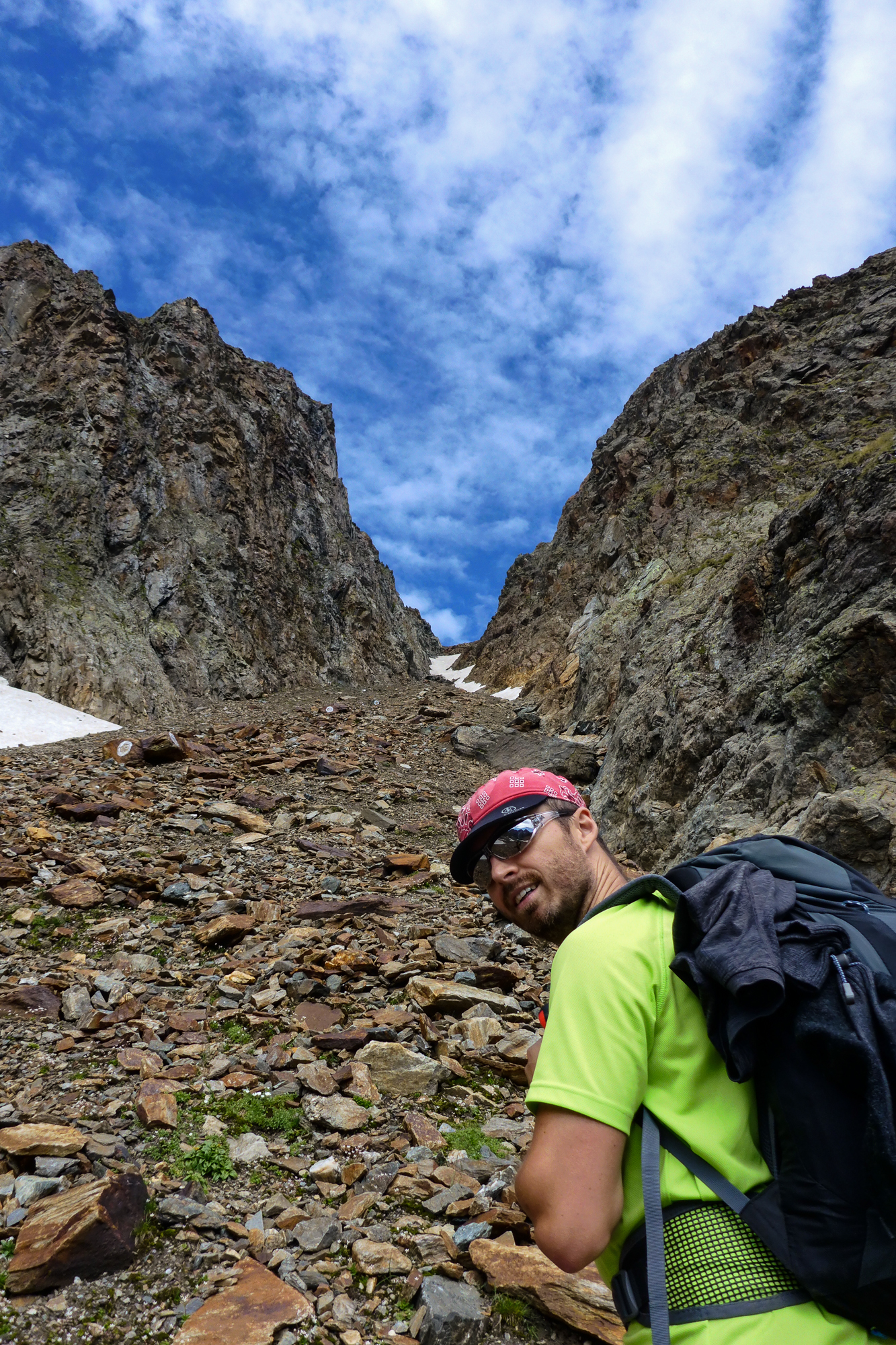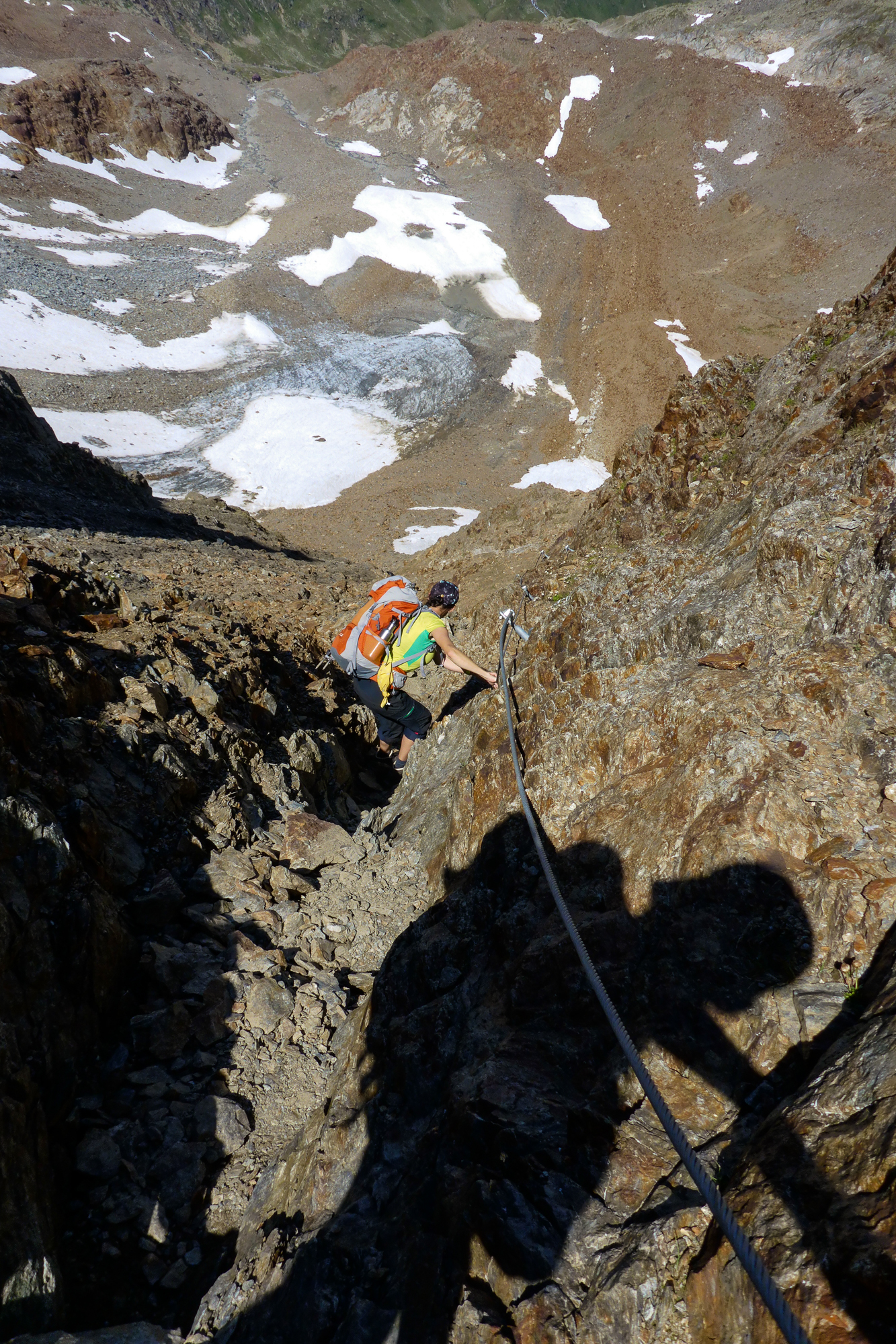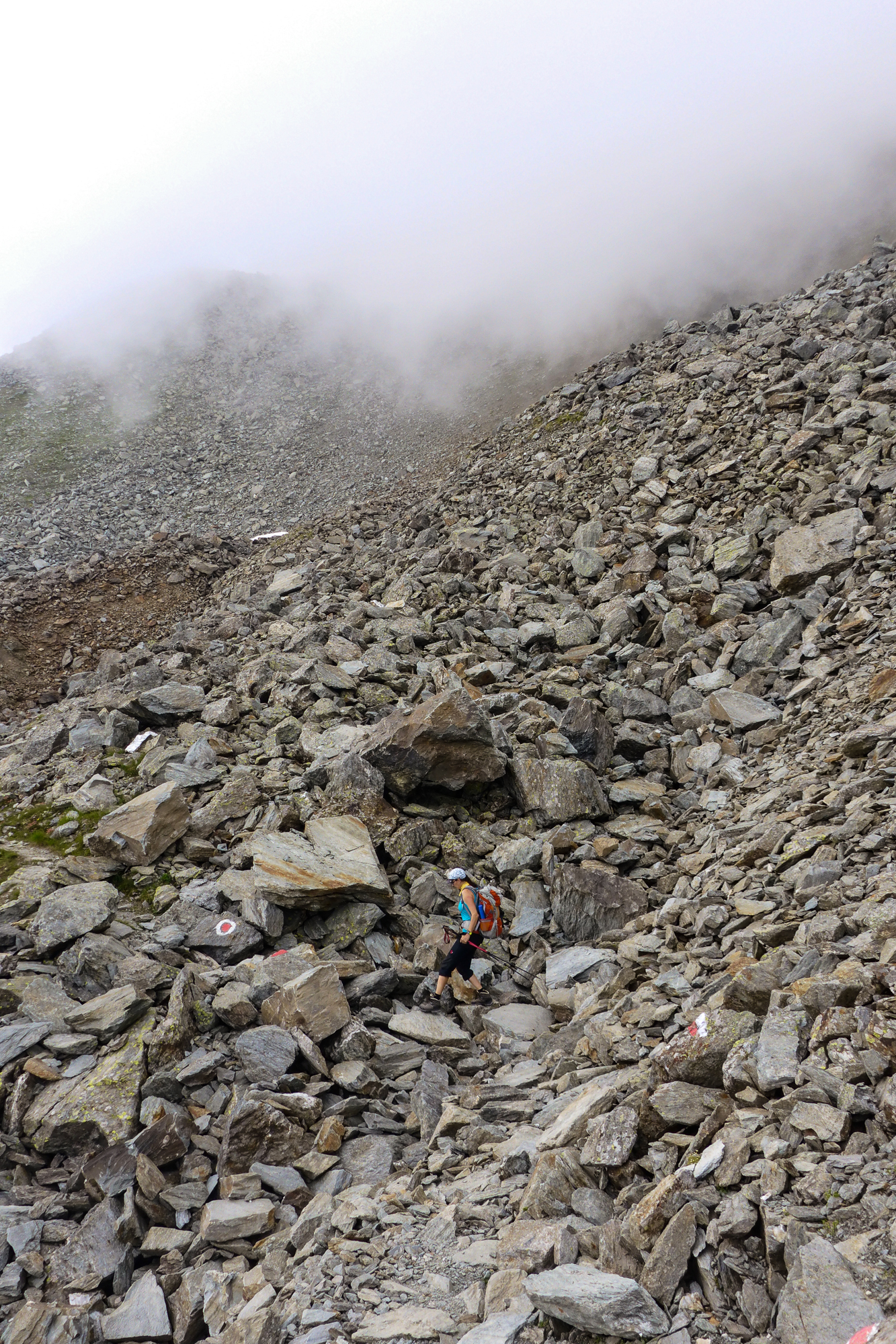 Auf der Geröllhalde konnte man auch mit größter Vorsicht einen Steinschlag auslösen. So wie die entgegenkommenden Niederländer, die uns gleich mit einem fußballgroßen Stein in ordentlicher Geschwindigkeit ihren Abstieg ankündigten.