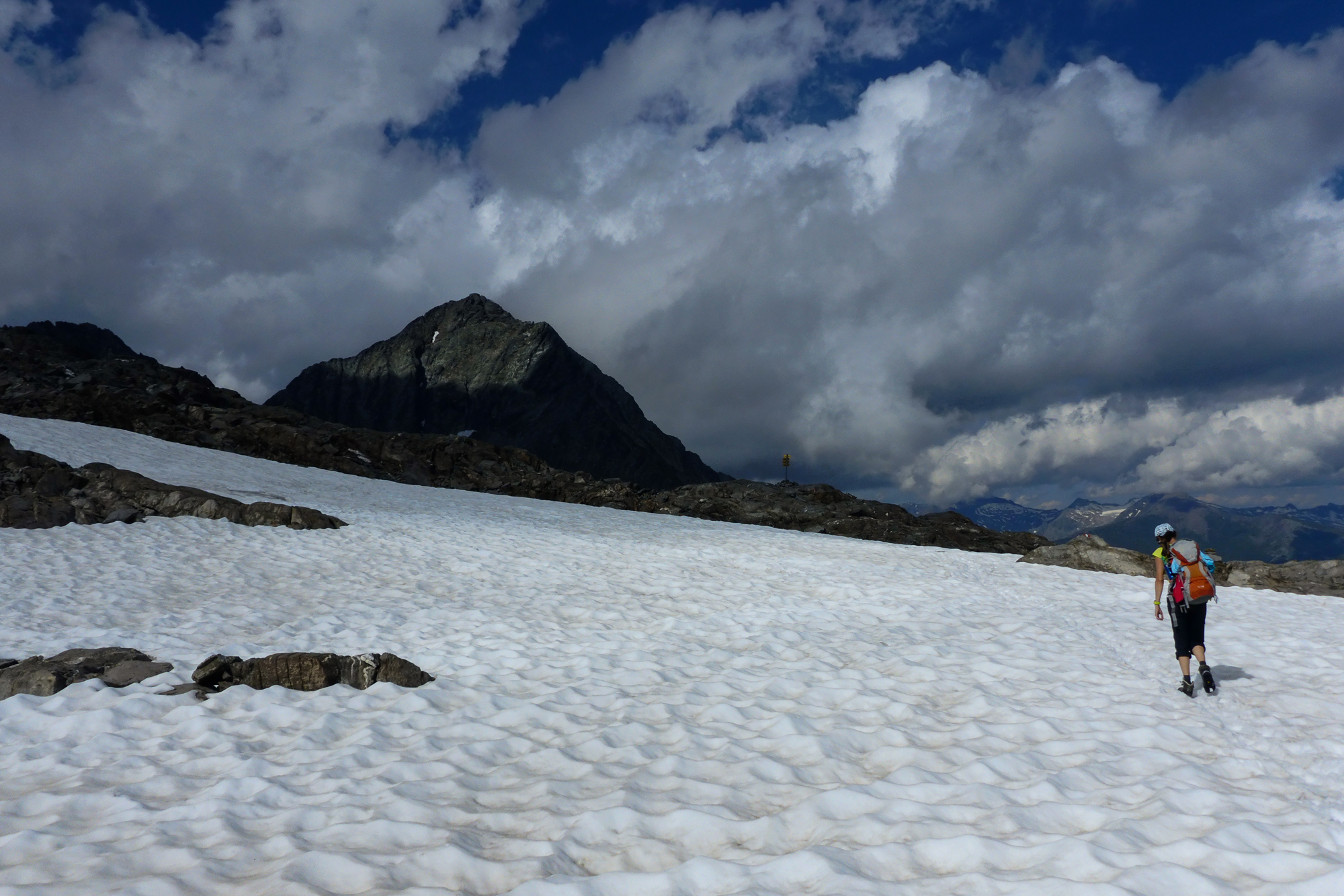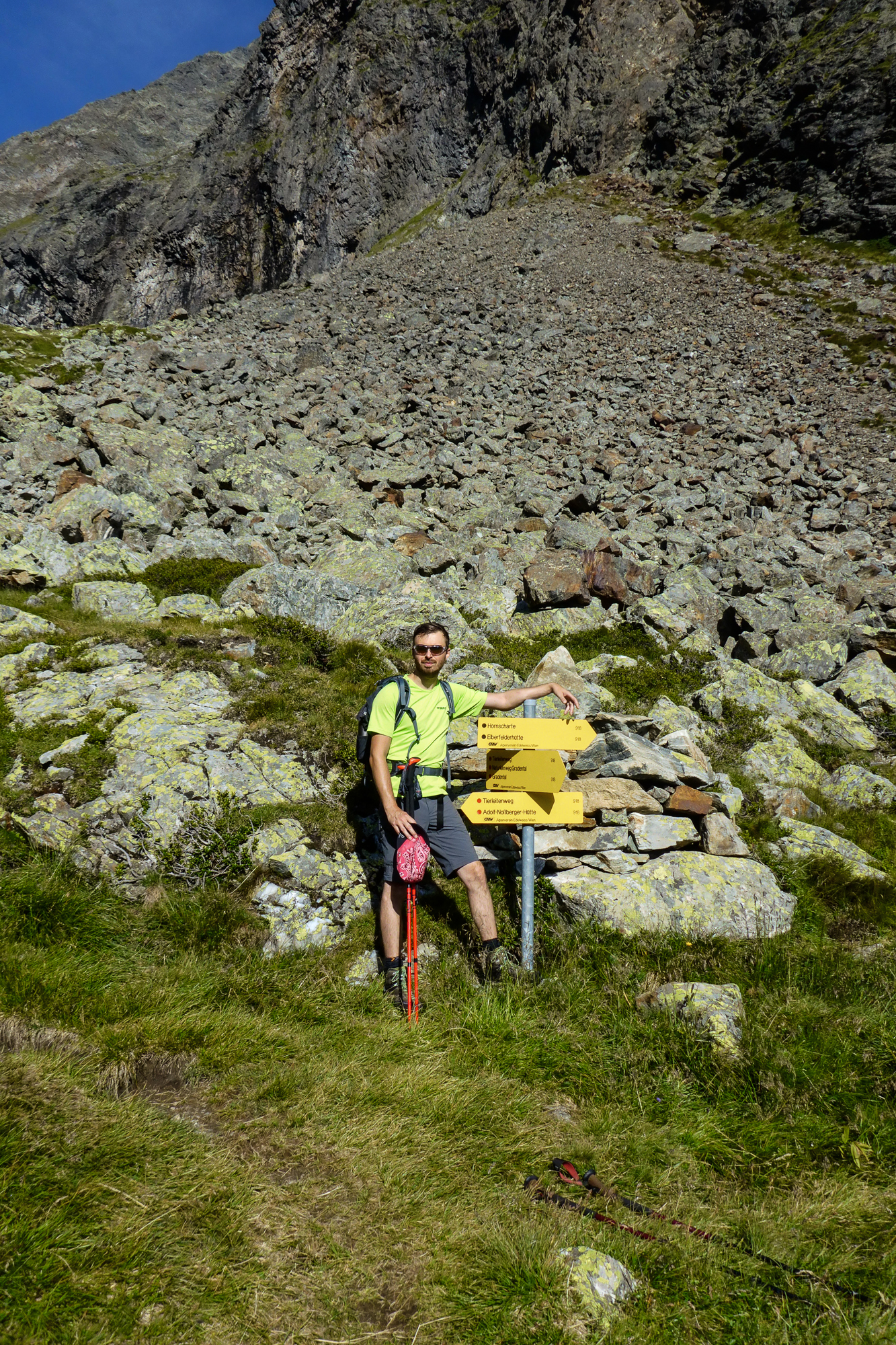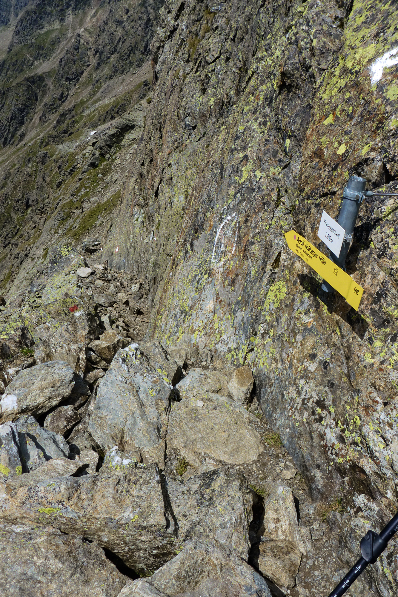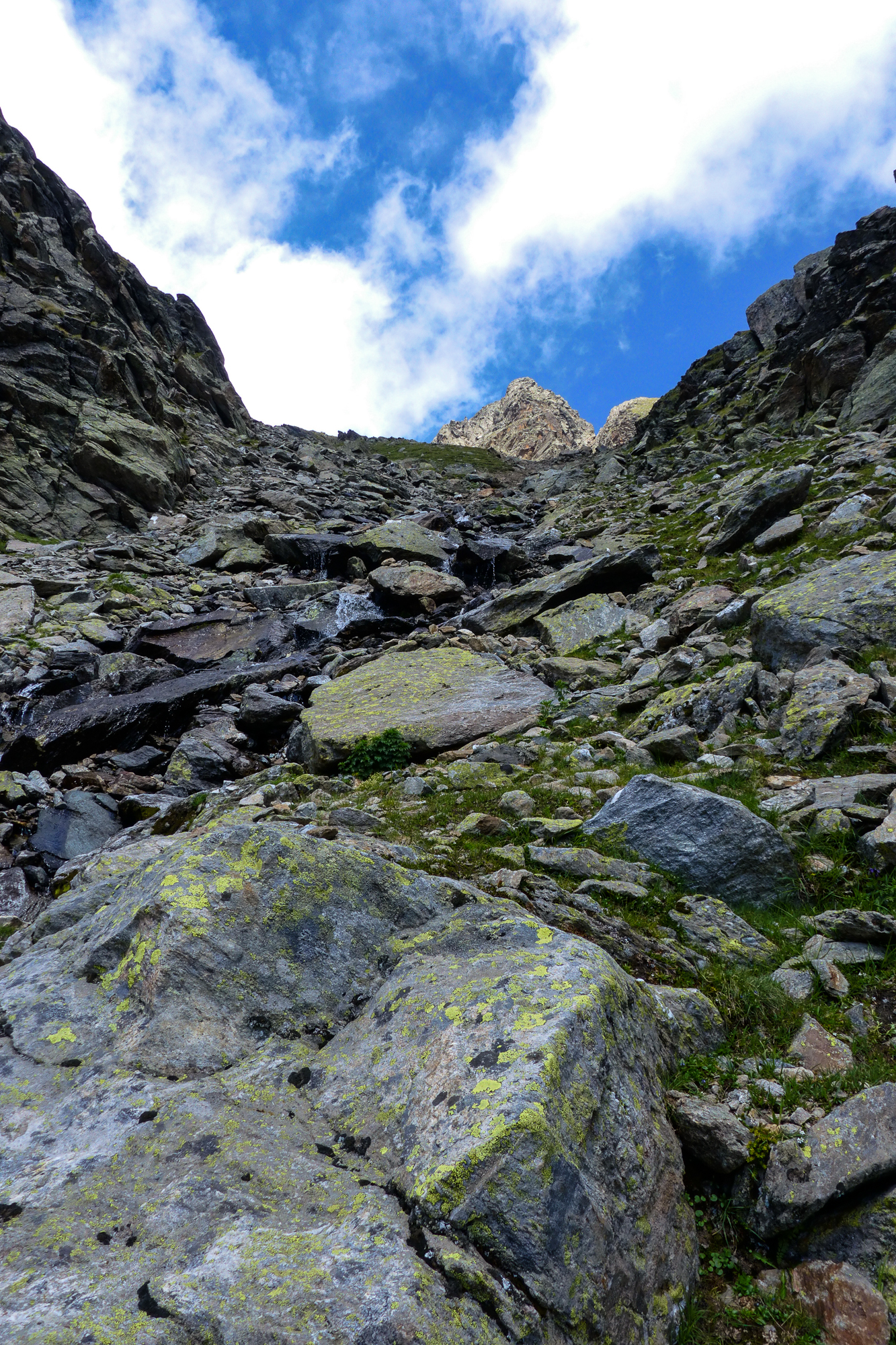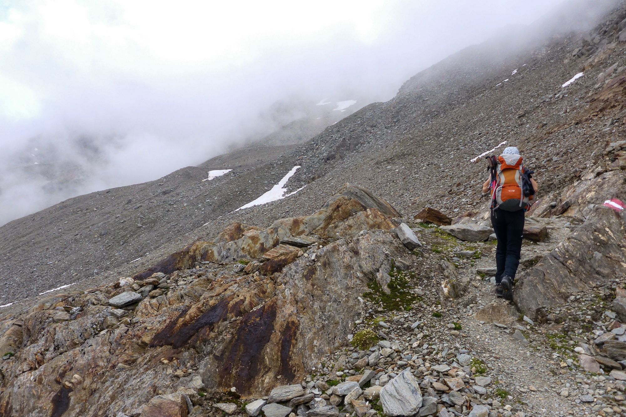 Auf der Geröllhalde konnte man auch mit größter Vorsicht einen Steinschlag auslösen. So wie die entgegenkommenden Niederländer, die uns gleich mit einem fußballgroßen Stein in ordentlicher Geschwindigkeit ihren Abstieg ankündigten.