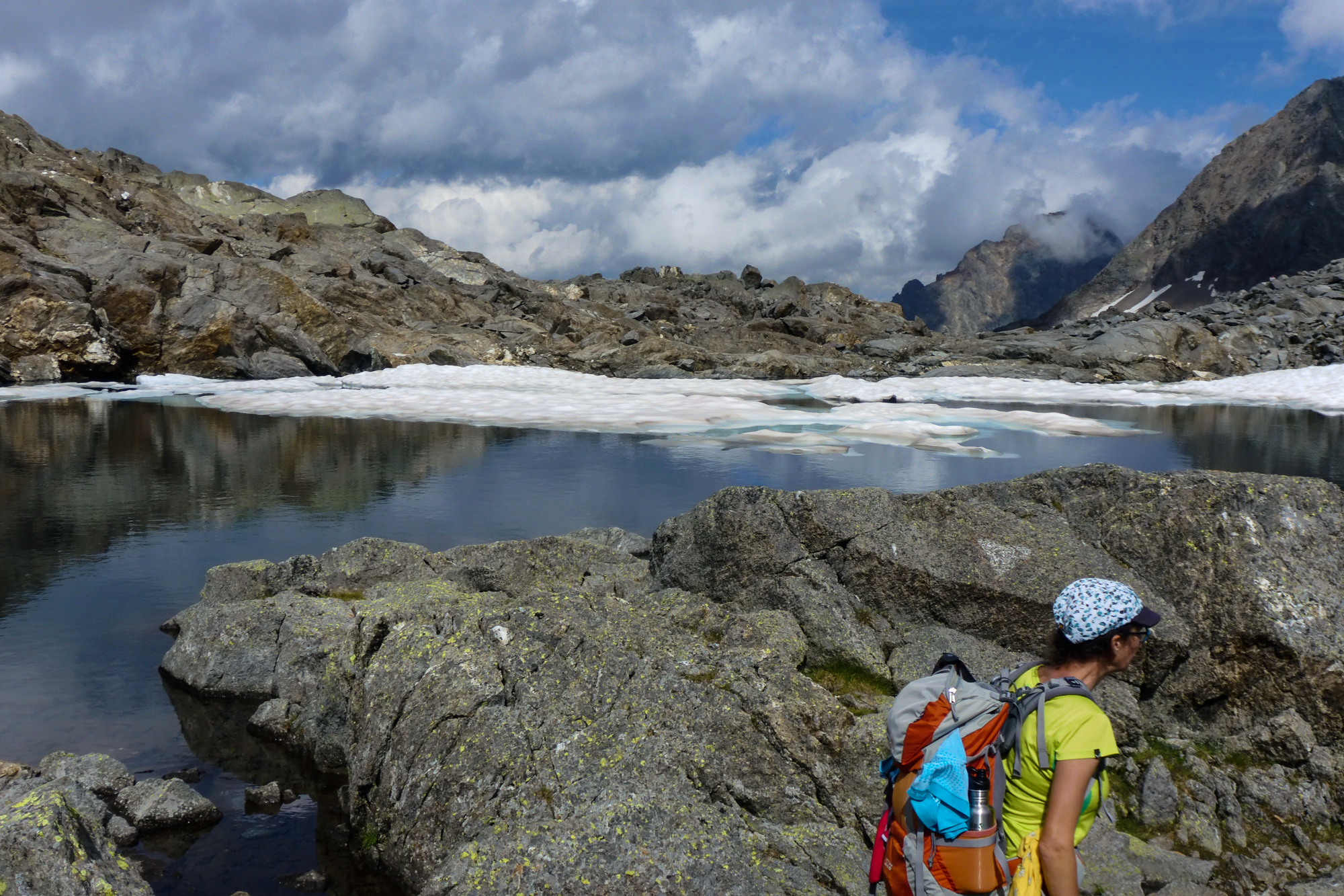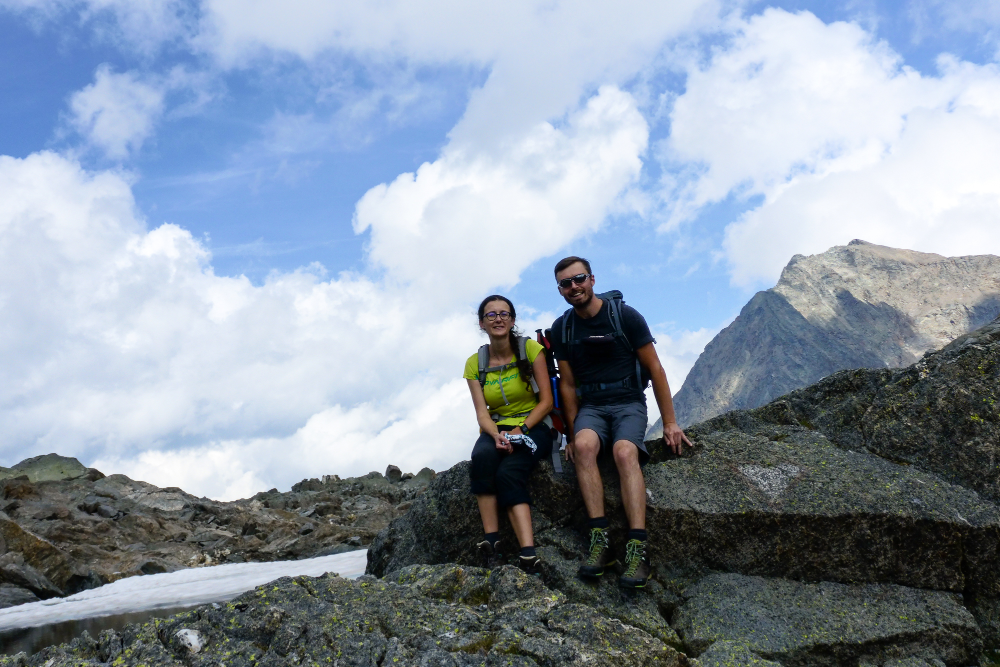 Zuerst lockte uns der Weg über die Hohe Gratenscharte, die in greifbarer Nähe schien und den Weg quasi halbieren würde. Da wir aber gewarnt wurden, dass es Steinschlag geben könnte auf der anderen Seite, gingen wir den längeren Weg zur niederen Gratenscharte – die im Übrigen nur wenige Meter niedriger war. Hier ist der Eissee definitiv sehenswert und wenn man dies als Tagesetappe macht, kann man locker einen 3000er mitnehmen. Wir sind allerdings froh, als wir über das Geröllfeld gehen und weiter unten schon die Adolf-Nossberger-Hütte sehen. Den Abstieg muss man zwar etwas suchen, er ist aber relativ einfach zu gehen, wenn man trittsicher ist.