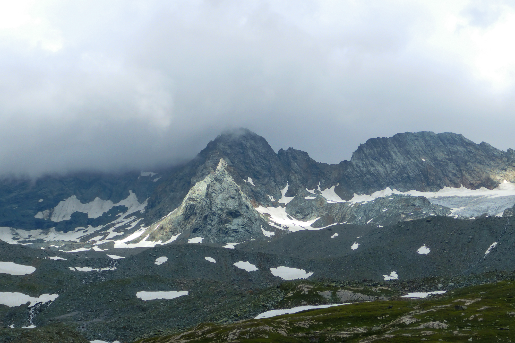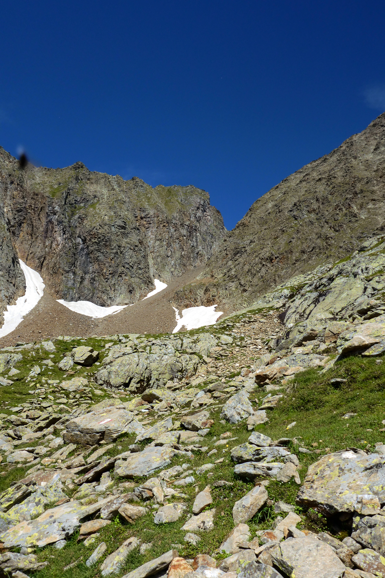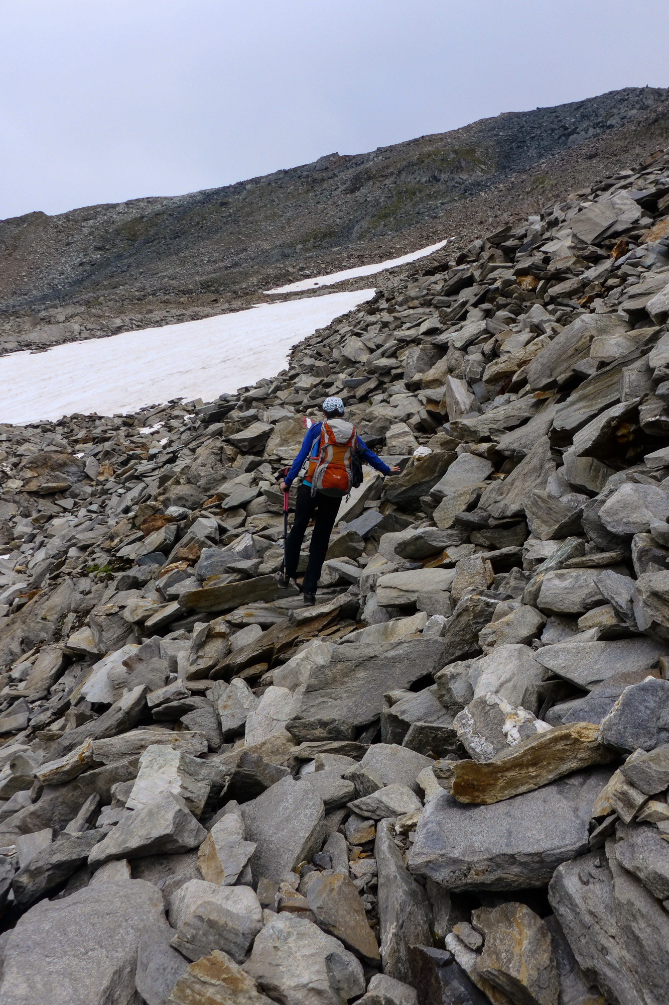 Wir überquerten zuerst ein paar Altschneefelder und kämpften uns mühsam eine rutschige Geröllhalde nach oben zur Hornscharte.