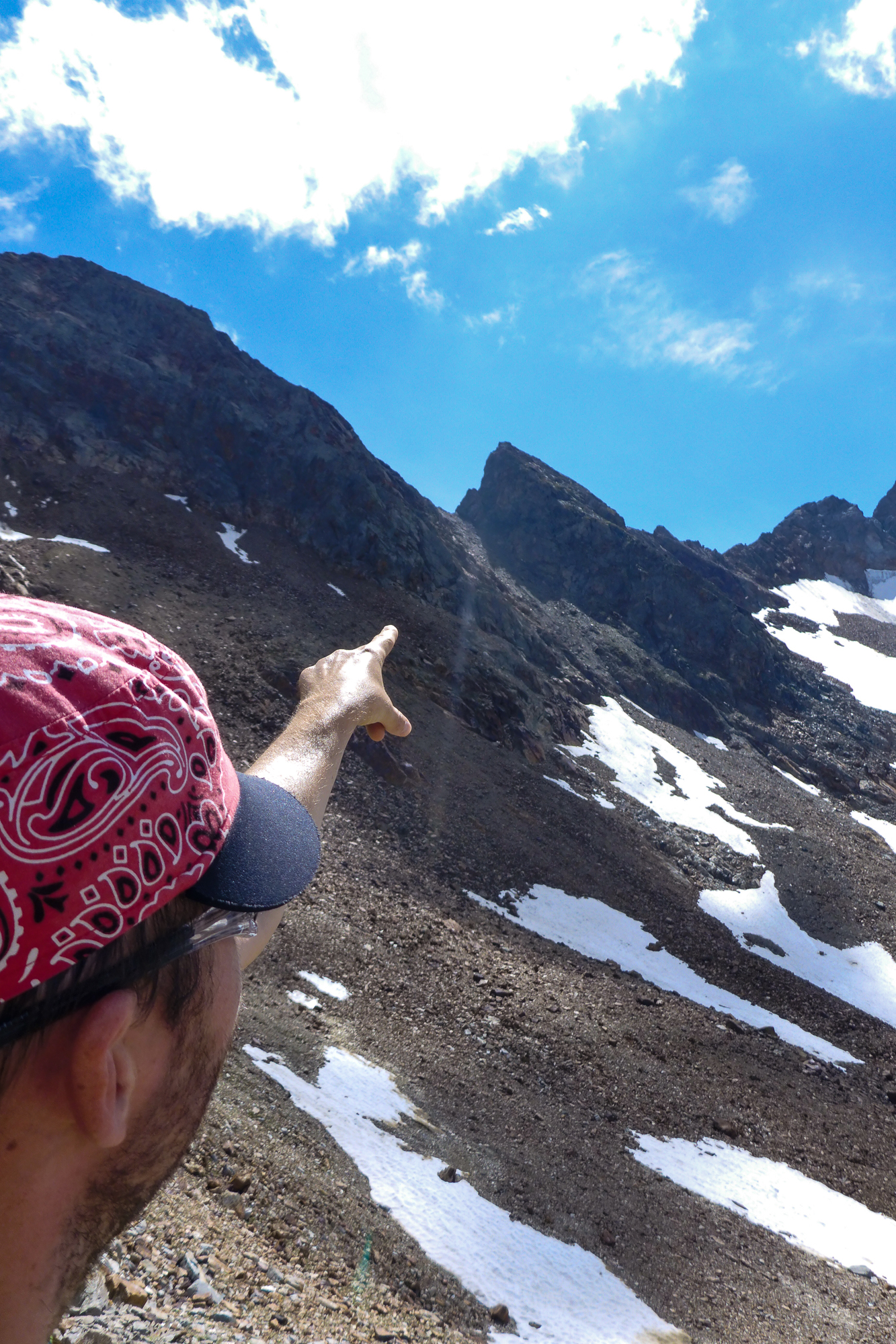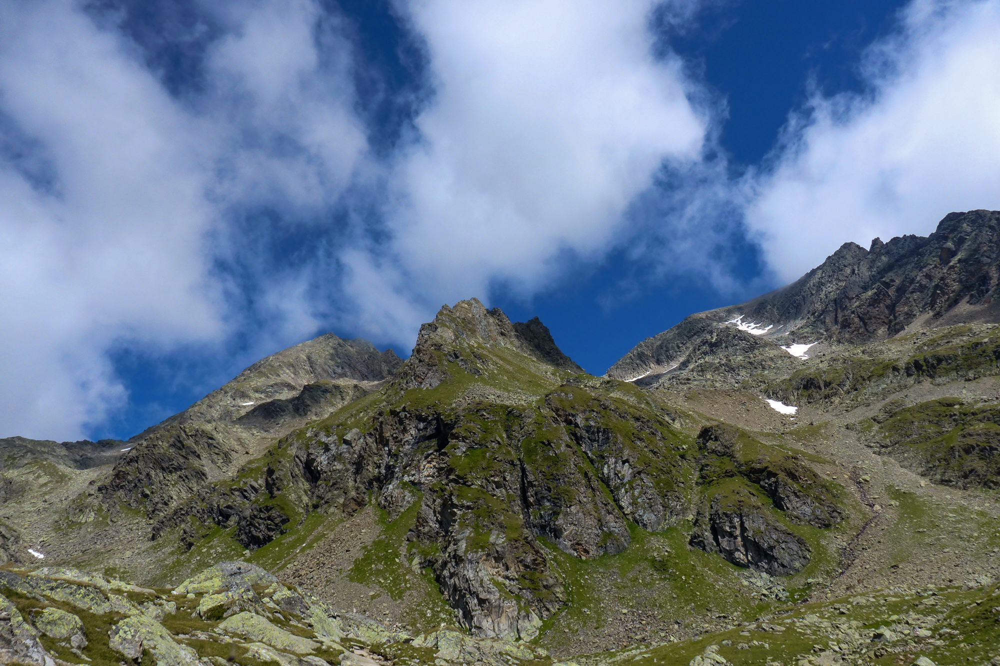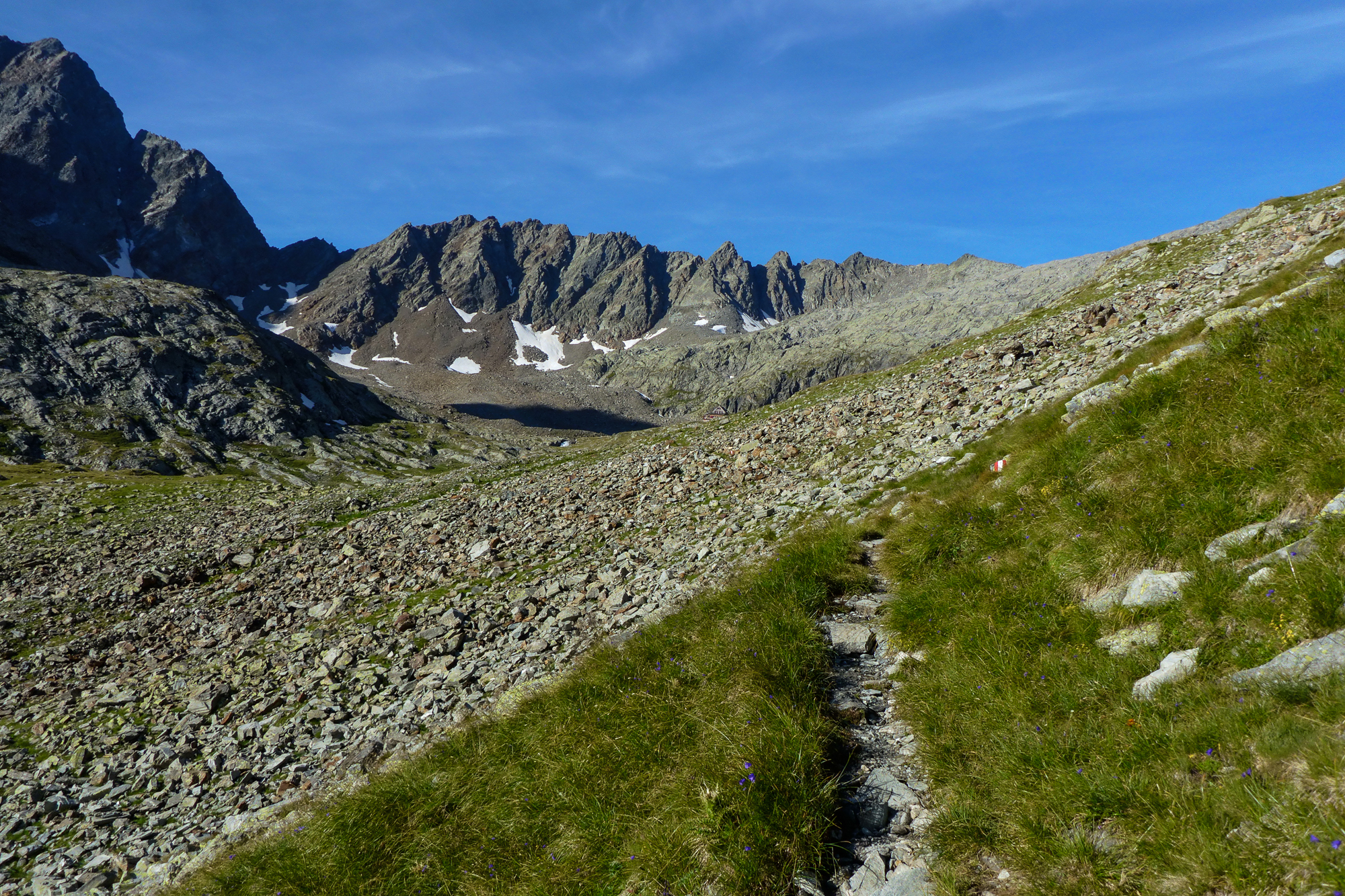 Wir überquerten zuerst ein paar Altschneefelder und kämpften uns mühsam eine rutschige Geröllhalde nach oben zur Hornscharte.