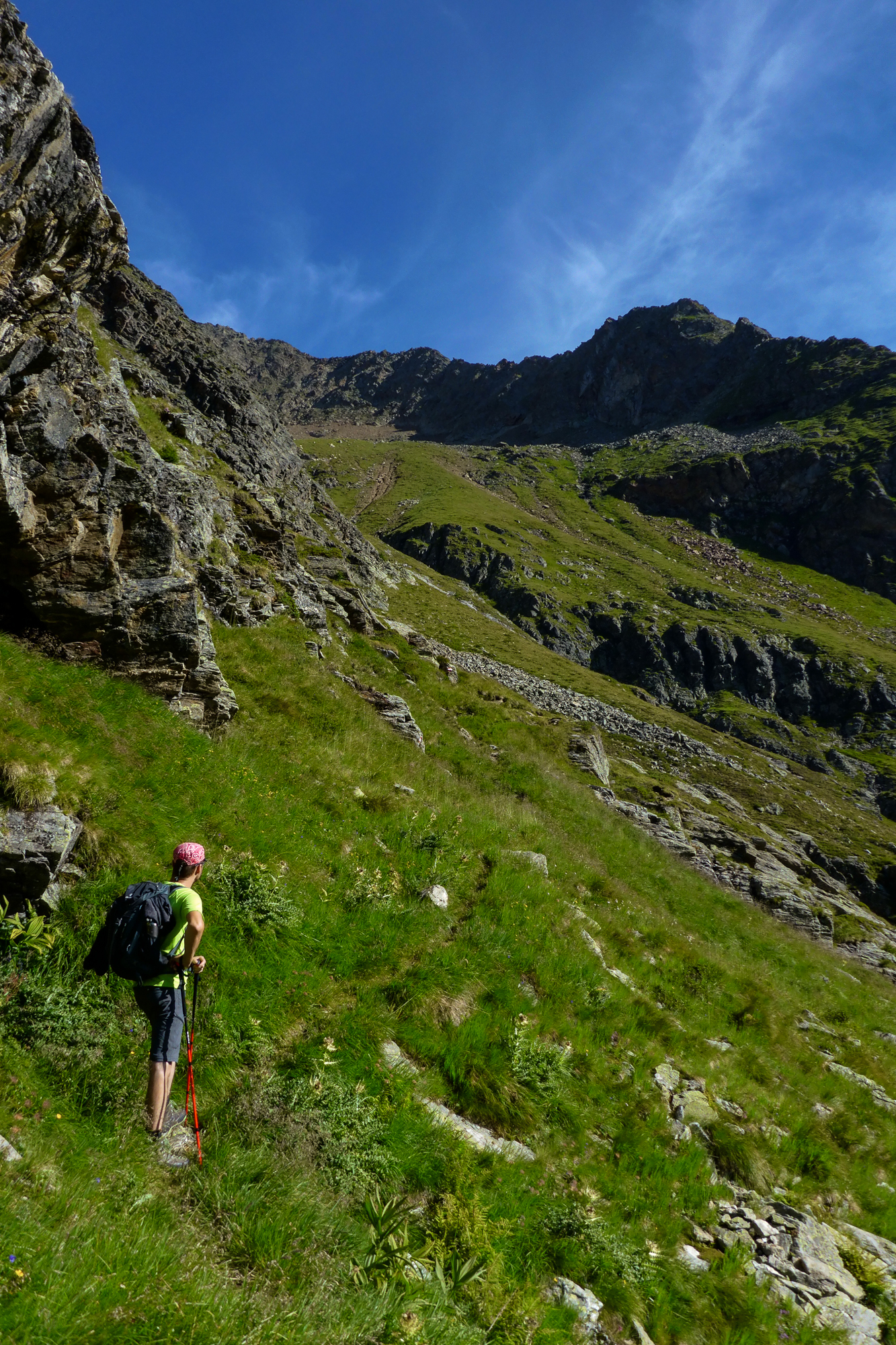 Von der Winklerner Alm ging es aber gemütlich über schöne Almwiesen dahin und man kommt in ein gutes Tempo rein. Nach 1,5 Stunden gönnten wir uns einen ersten Müsliriegel und eine kurze Pause. Der folgende Aufstieg zu unserer ersten Scharte verlangte uns dann doch Einiges ab. Aber auch unsere deutschen Verfolger mühten sich auf dem steilen Weg redlich.
