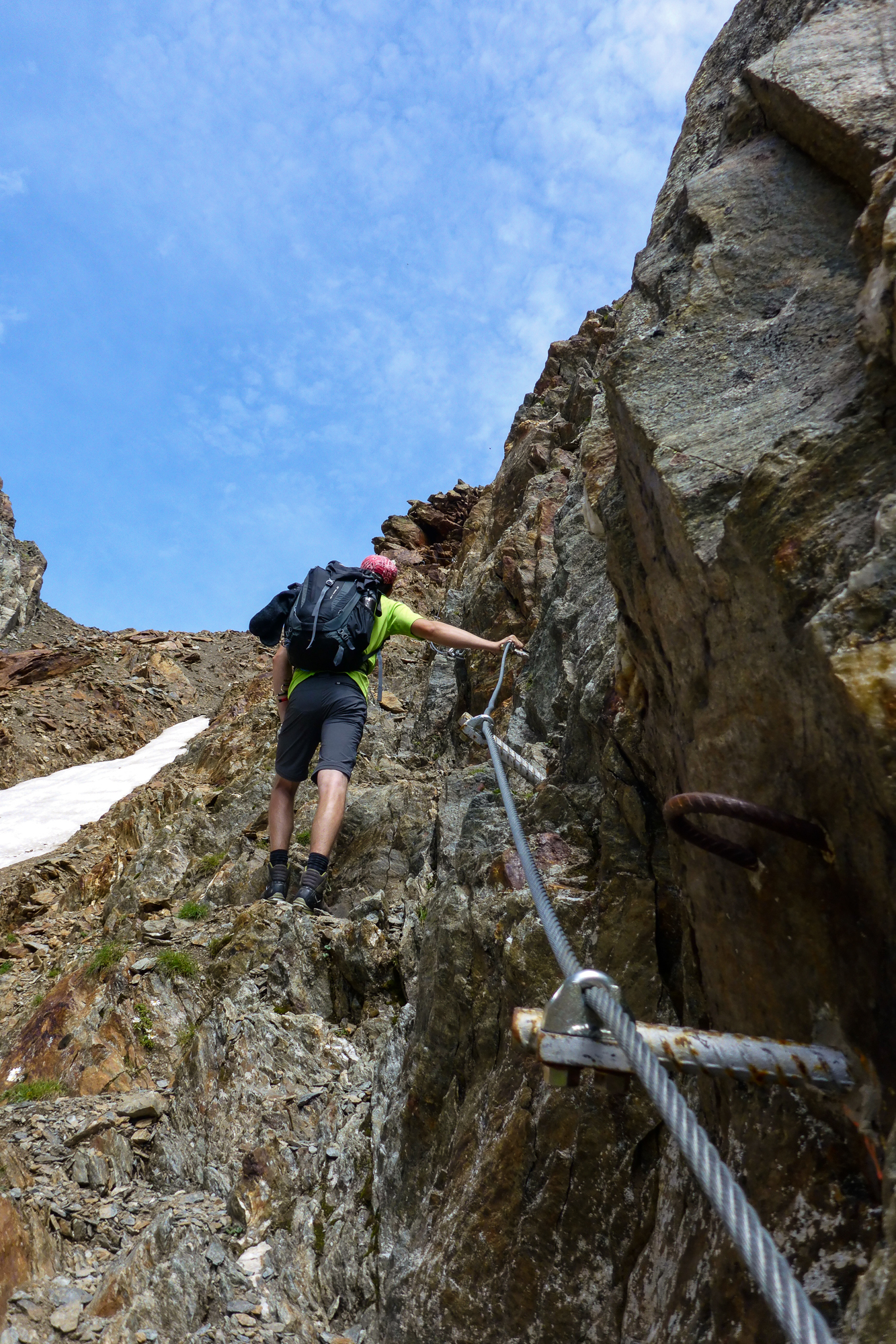 Aufgrund unseres Allgemeinzustandes (meine Gefährtin hat sich in der Früh noch übergeben und traute sich beim Frühstück nicht wirklich zuzugreifen) waren wir knapp davor gleich hier zu bleiben und ev. am nächsten Tag abzusteigen. Oder erst nach einer ruhigen Nacht weiterzugehen, was aber unseren Plan durcheinander geworfen hätte. Nach einer kräftigenden Suppe und einem schwarzen Tee fanden wir allerdings das Fünkchen Motivation das genügte um die nächste Etappe in Angriff zu nehmen. Wir fuhren die Stecken aus und es wurde weiter marschiert. Schonfrist gab es nur wenig, denn die nächsten Höhenmeter warteten schon auf uns. Man merkte schnell, dass es sich hier um einen schwarzen Weg handelte. Abschnittsweise gab es Versicherungen und an Trittstiften hangelten wir uns zur nächsten Scharte.