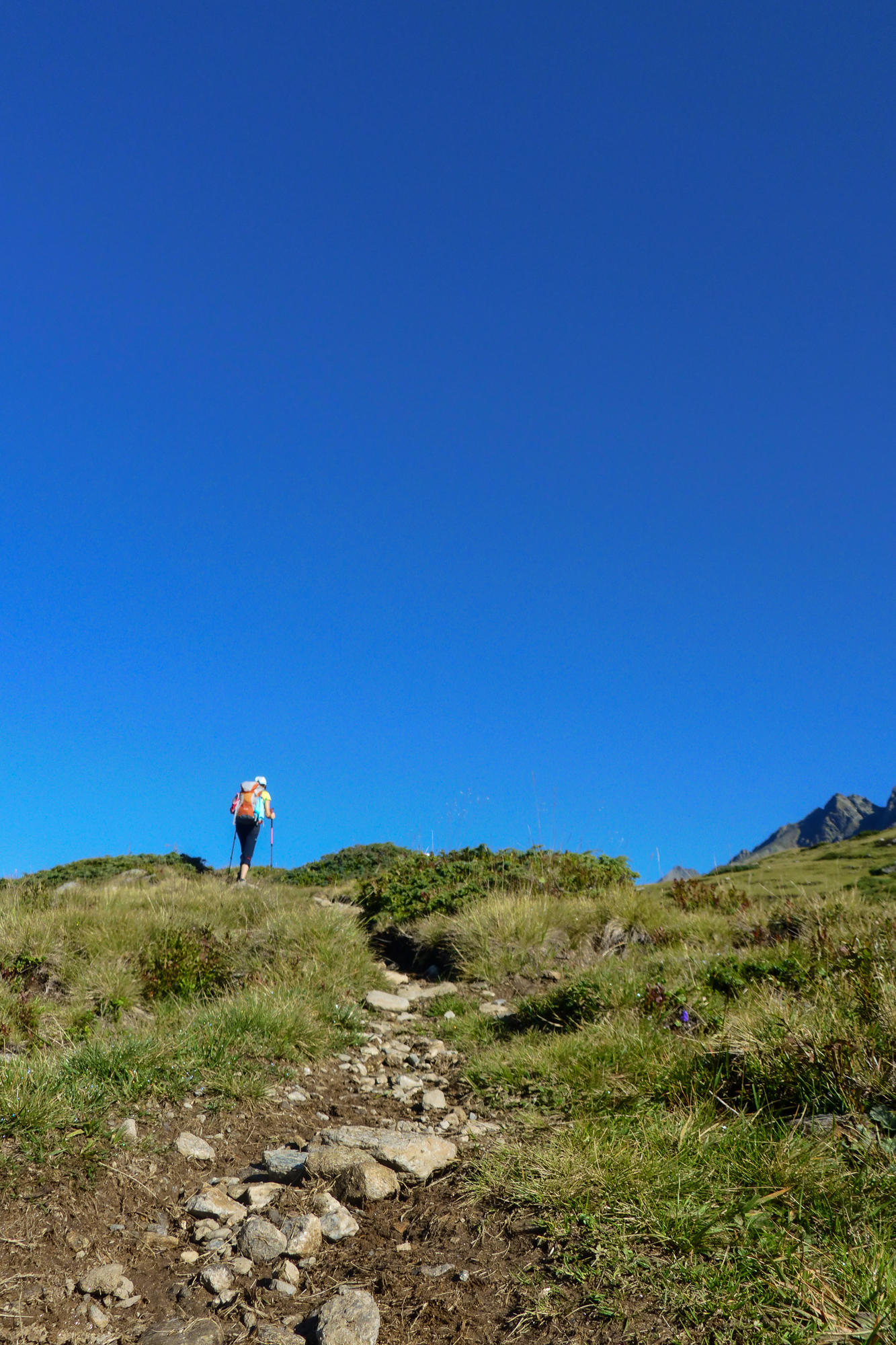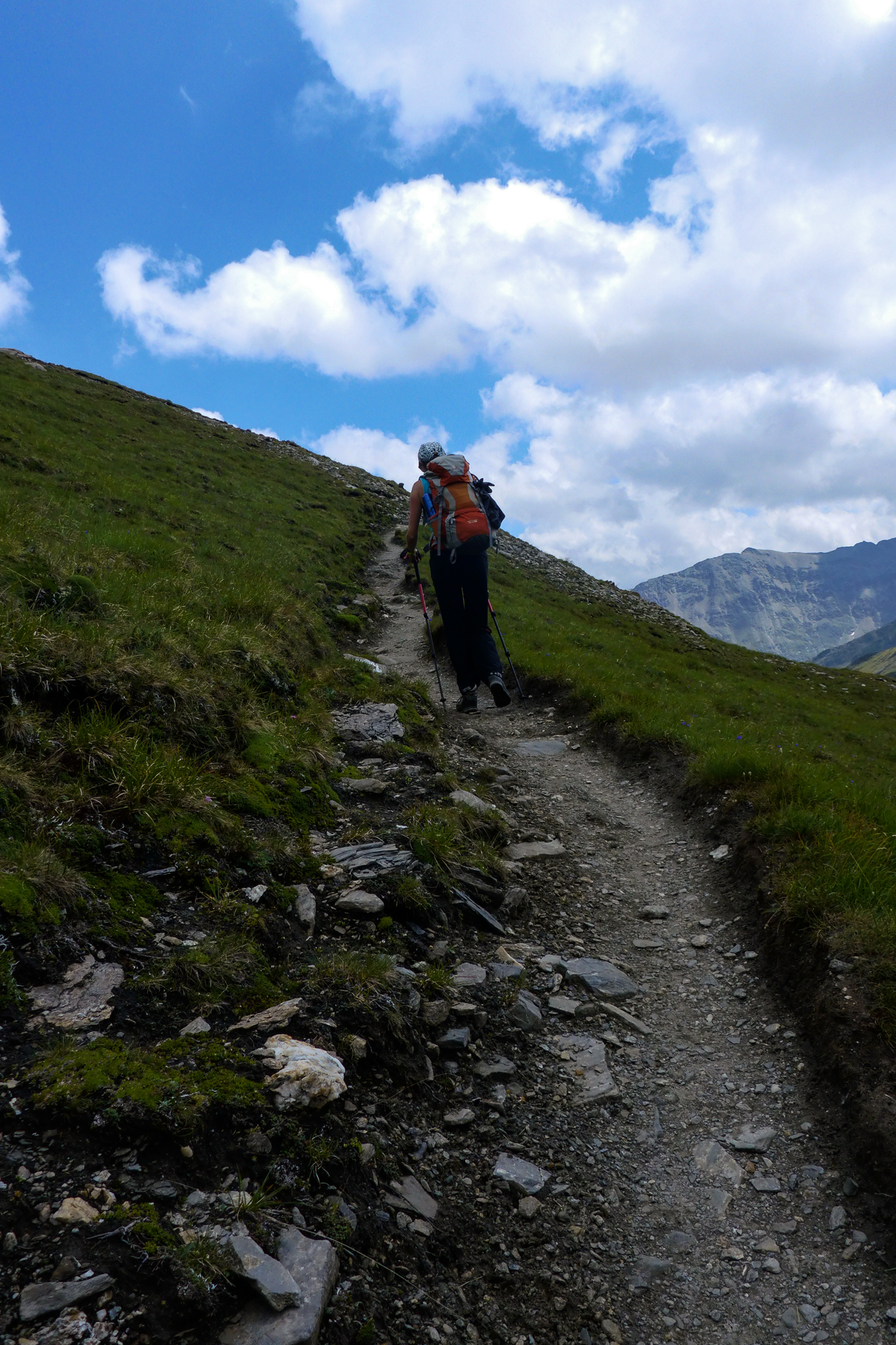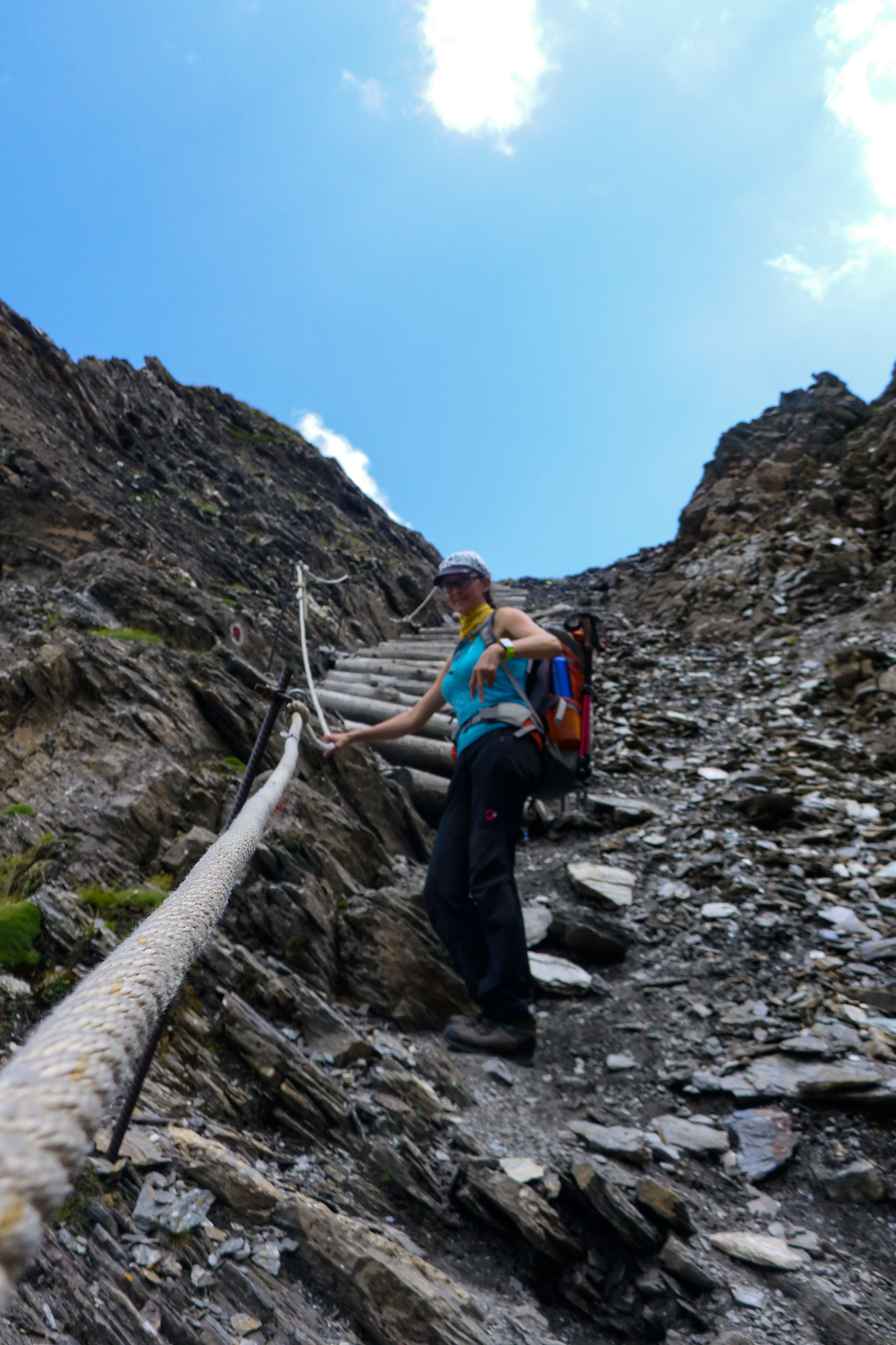 Lediglich 4 Stunden Gehzeit und nur 600 Höhenmeter? Das klang nach einem entspannten Tag und einem Chill-Out bei der Hütte. Doch schon bald nach der Nossi war es vorbei mit dem gemütlichen Wandern und es ging in Serpentinen und Querungen steil bergauf. Die gesamten Höhenmeter wurden hier in einem Aufwasch erledigt und das Gelände wurde immer fordernder.
