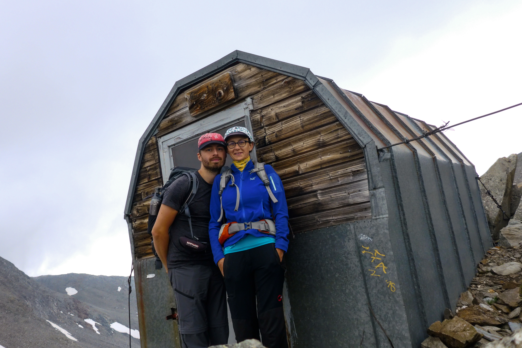 Wir starteten bei der Elberfelder Hütte bei dichtem Nebel und niedrigen Temperaturen. Zuerst ging es flach und angenehm dahin, aber auch heute warteten die Höhenmeter nicht lange auf uns. Am Weg zum Sattel, wo auch das Gernot-Röhr-Biwak steht, mussten wir wieder einmal die Stecken zur Hand nehmen. Wir spielten mit dem Gedanken das „Böse Weibel“ mitzunehmen und somit auch einen 3000er im Gepäck zu haben, da es aber noch immer wolkenverhangen und kalt war, haben wir uns das erspart und begannen mit dem Abstieg Richtung Unterstandshütte. Schottrig, dann felsig aber unschwierig und schlussendlich über charmante Almwiesen ging es zur Hütte, wo wir eine Rast einlegten.