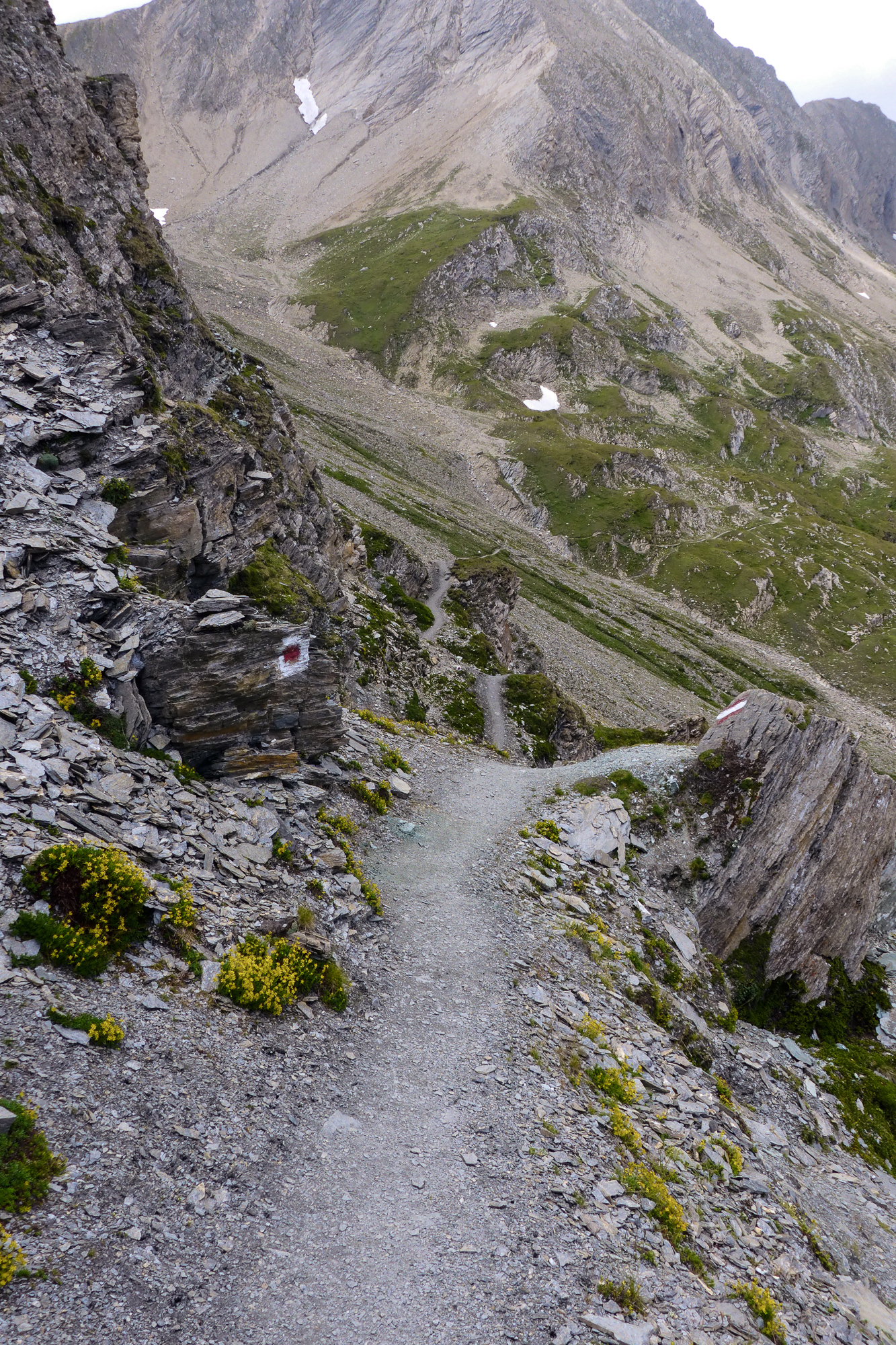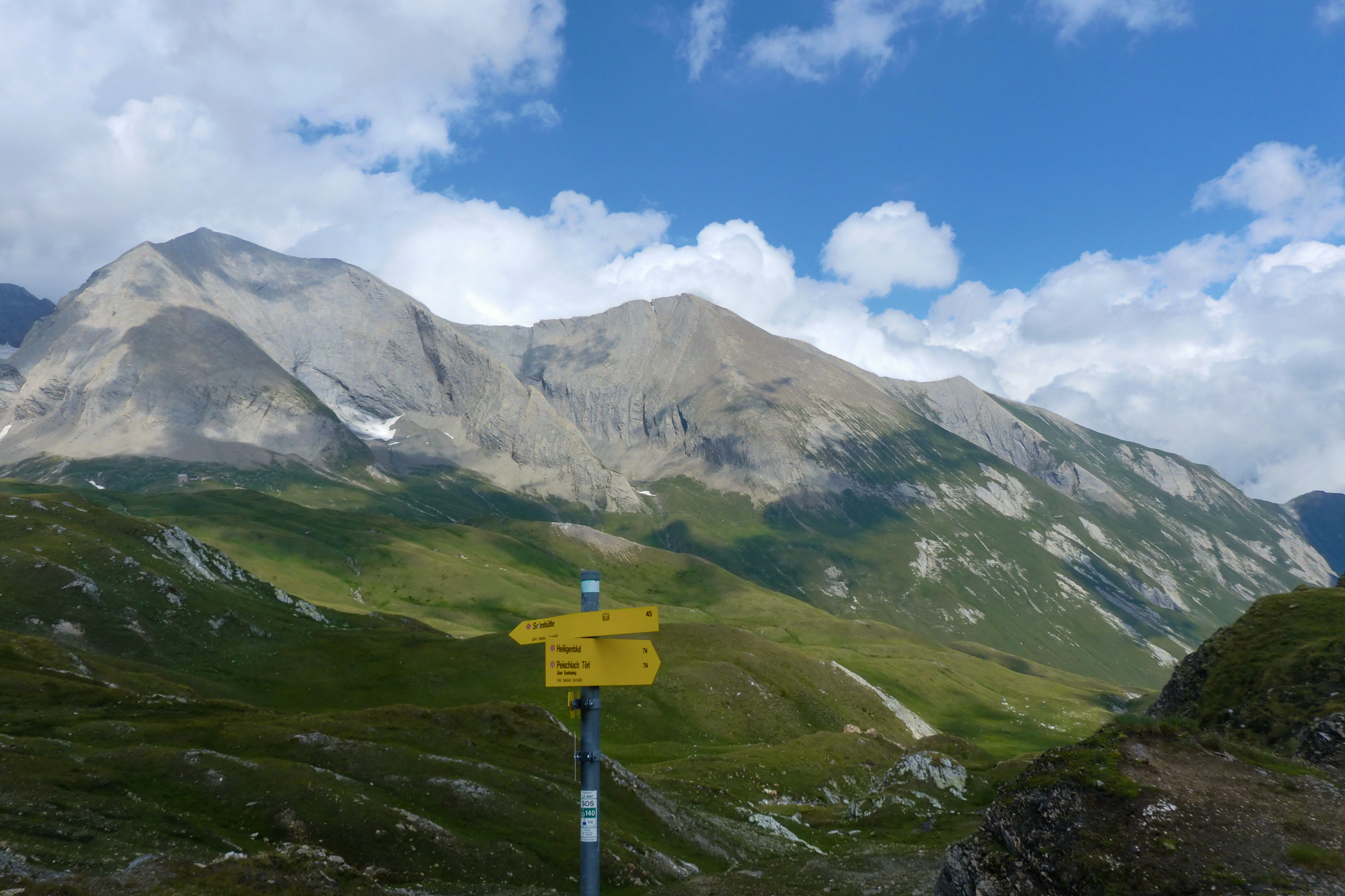 Im Vergleich zu den vorhergehenden Etappen war diese ja fast ein Spaziergang. Man macht nur wenige Höhenmeter und wir gingen die meiste Zeit quer zu einem steilen, felsendurchsetzten, Grashang. Hier war definitiv Murmeltierland und wir bekamen die Möglichkeit, die sonst scheuen Tierchen aus der Nähe zu betrachten, da sie ihre Ausgänge direkt neben dem Wanderweg hatten und anscheinend sich an die wandernden Besucher gewöhnt haben.