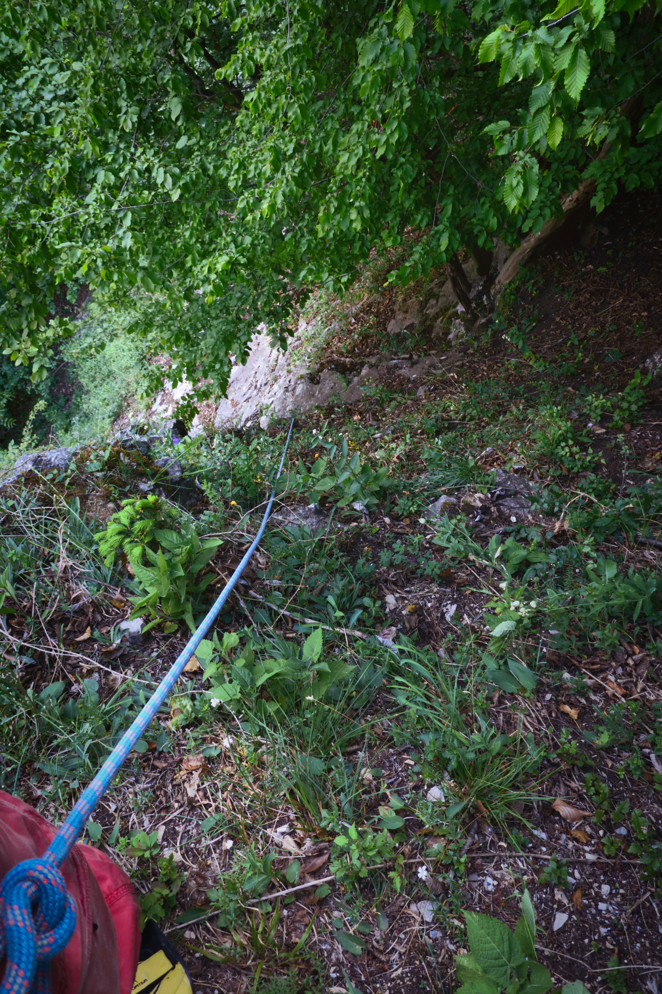 Ich steige heute vor und die erste Seillänge, eine 3+ die OK erscheint und nur wenig loses Gestein bietet endet gleich nach ca. 15 Metern.
