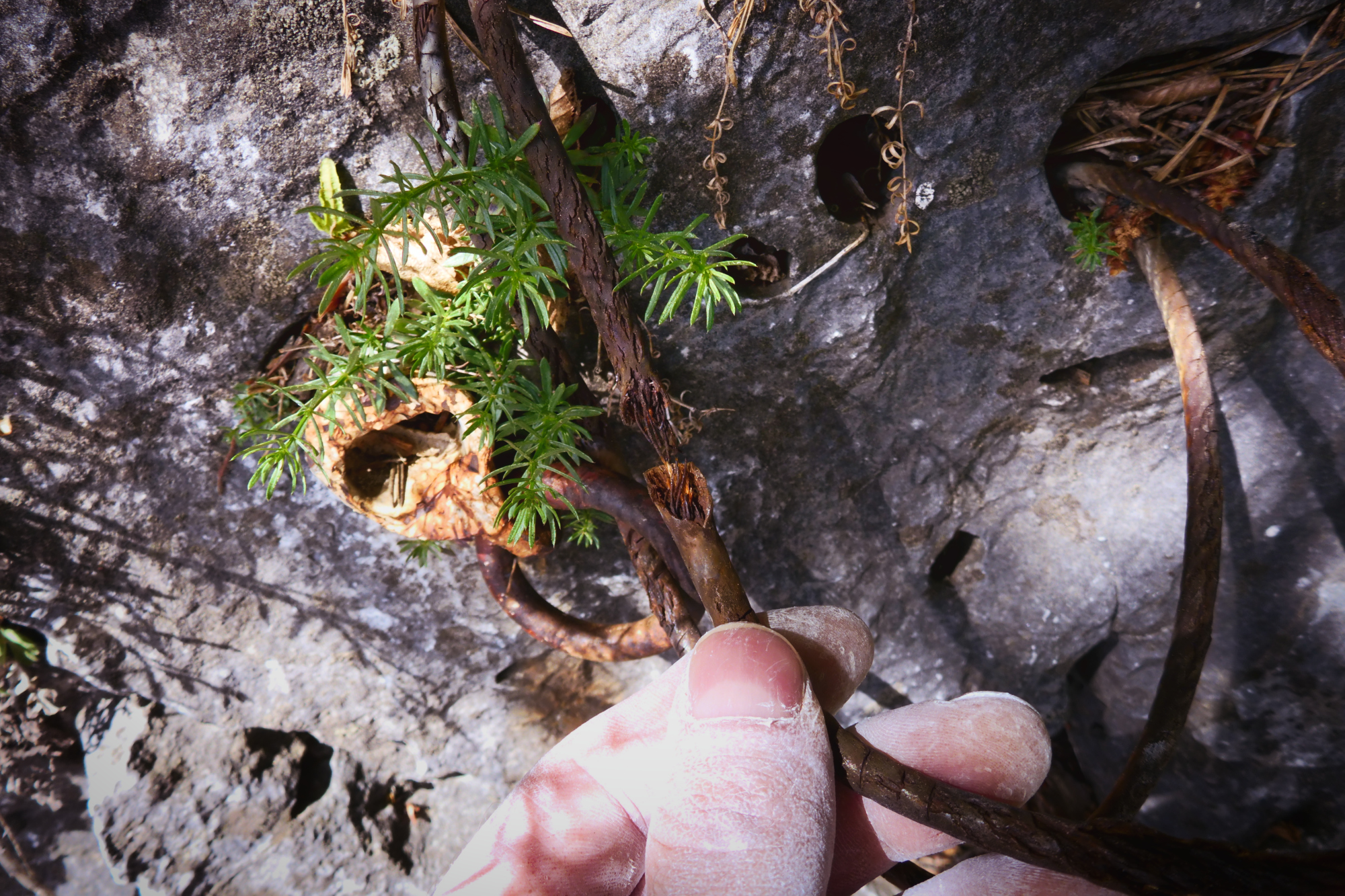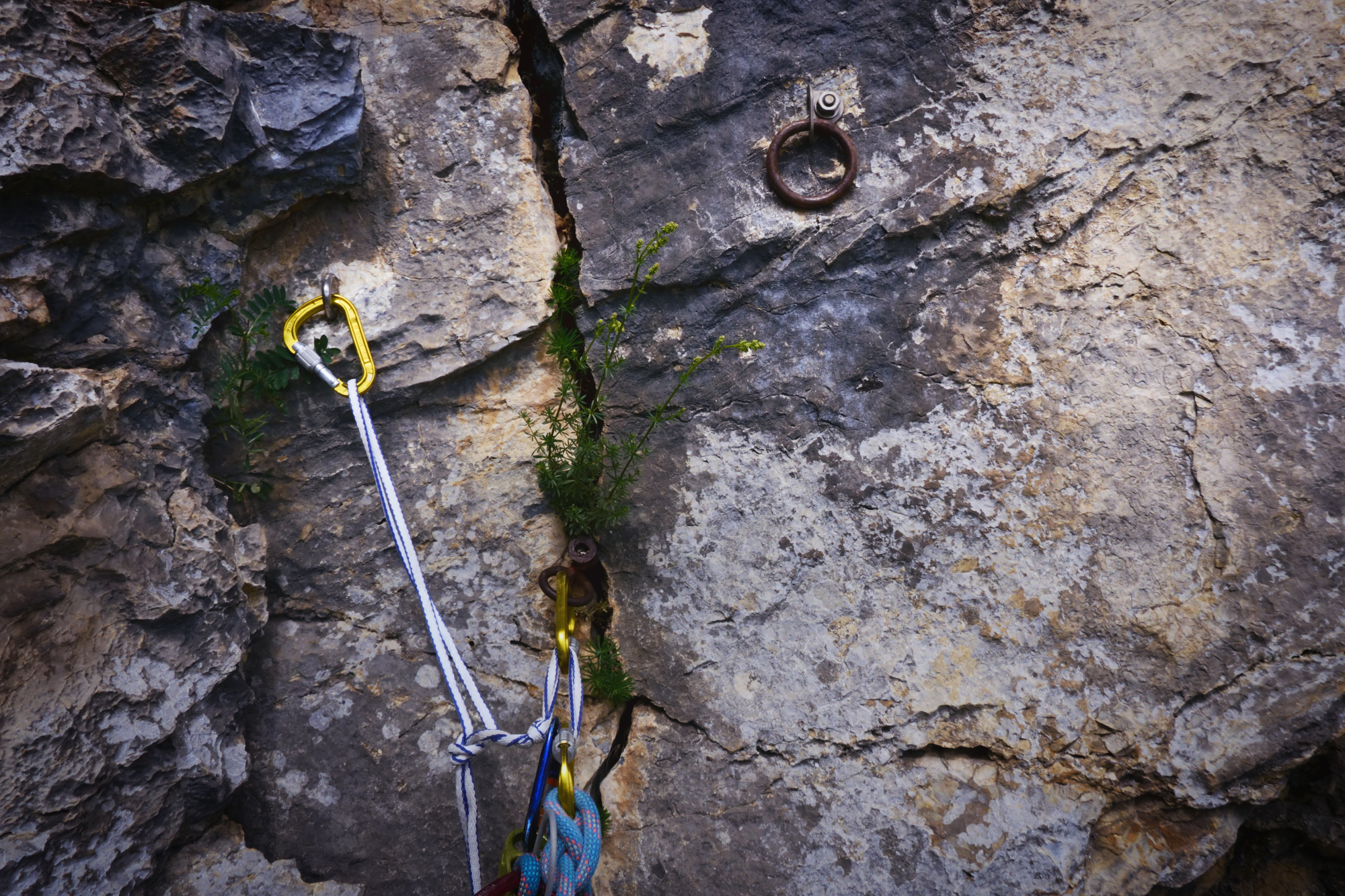 Seillänge 2 ist für eine 4+ schon etwas derb. Es ist auch keine schöne Kletterei, eher ein rüdes Gerampfe an diversem Hakenmaterial, dessen Qualität allenfalls als zweifelhaft beurteilt werden kann.