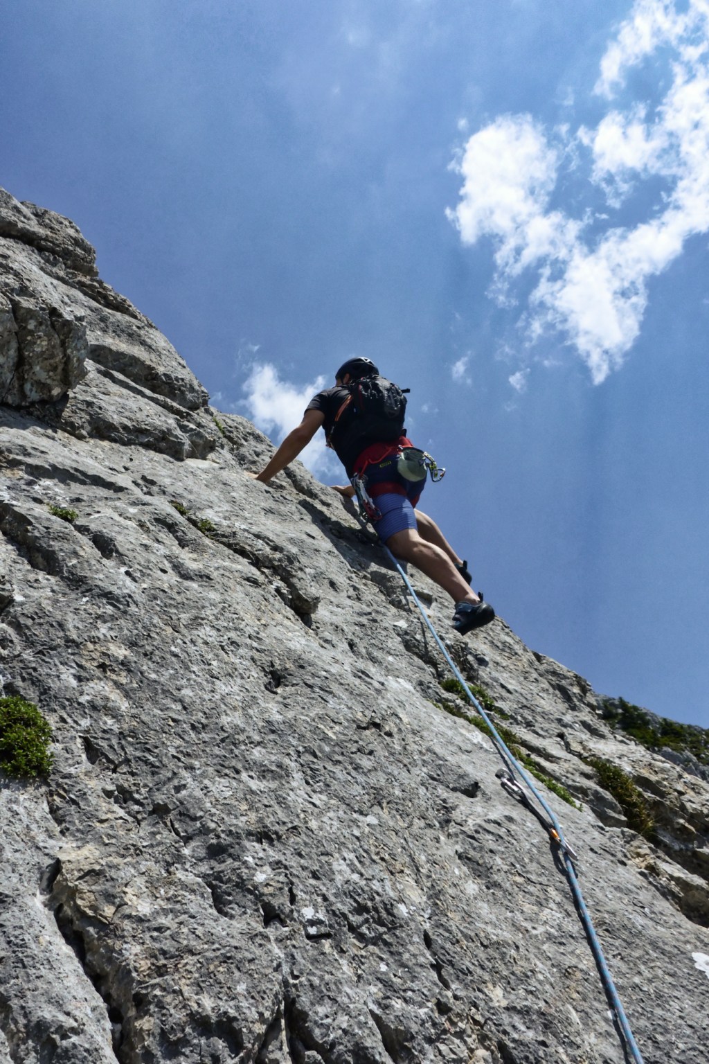 Nun, ich habe sie ausgesucht um meinem Seilpartner auch einmal die Erfahrung im brüchigen Fels zu spendieren. Vorsichtiges Greifen und Steigen, sowie das Testen von Griffen ist etwas, dass man schon auch bedenken sollte wenn man im alpineren Gelände unterwegs ist. Auf Grund der guten Absicherung ist die Verletzungswahrscheinlichkeit aber eher gering und durch die vielen Bänder, Querungen und nur kurzen Kletterstellen hat man selten die Möglichkeit mit dem ausgelösten Steinschlag seinen Partner zu verletzen.