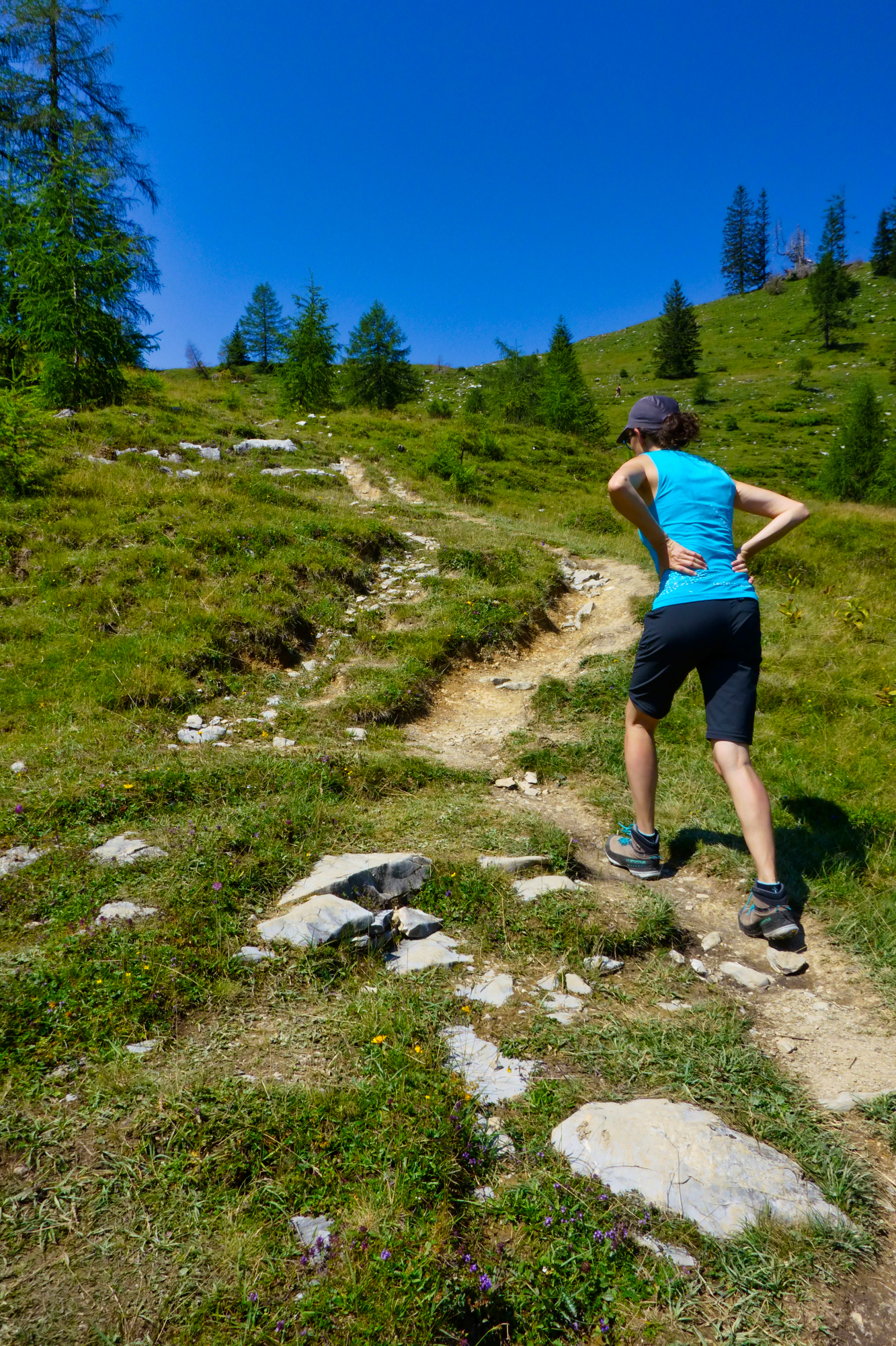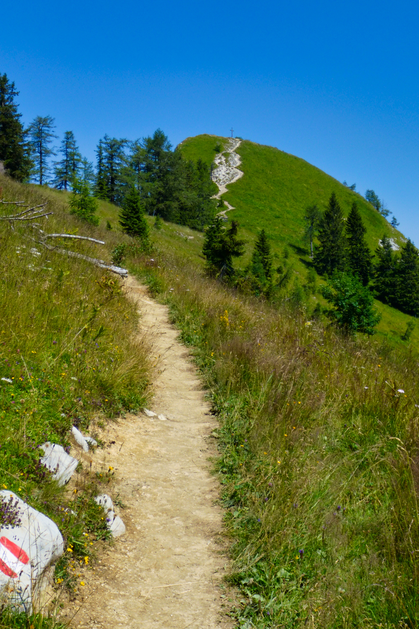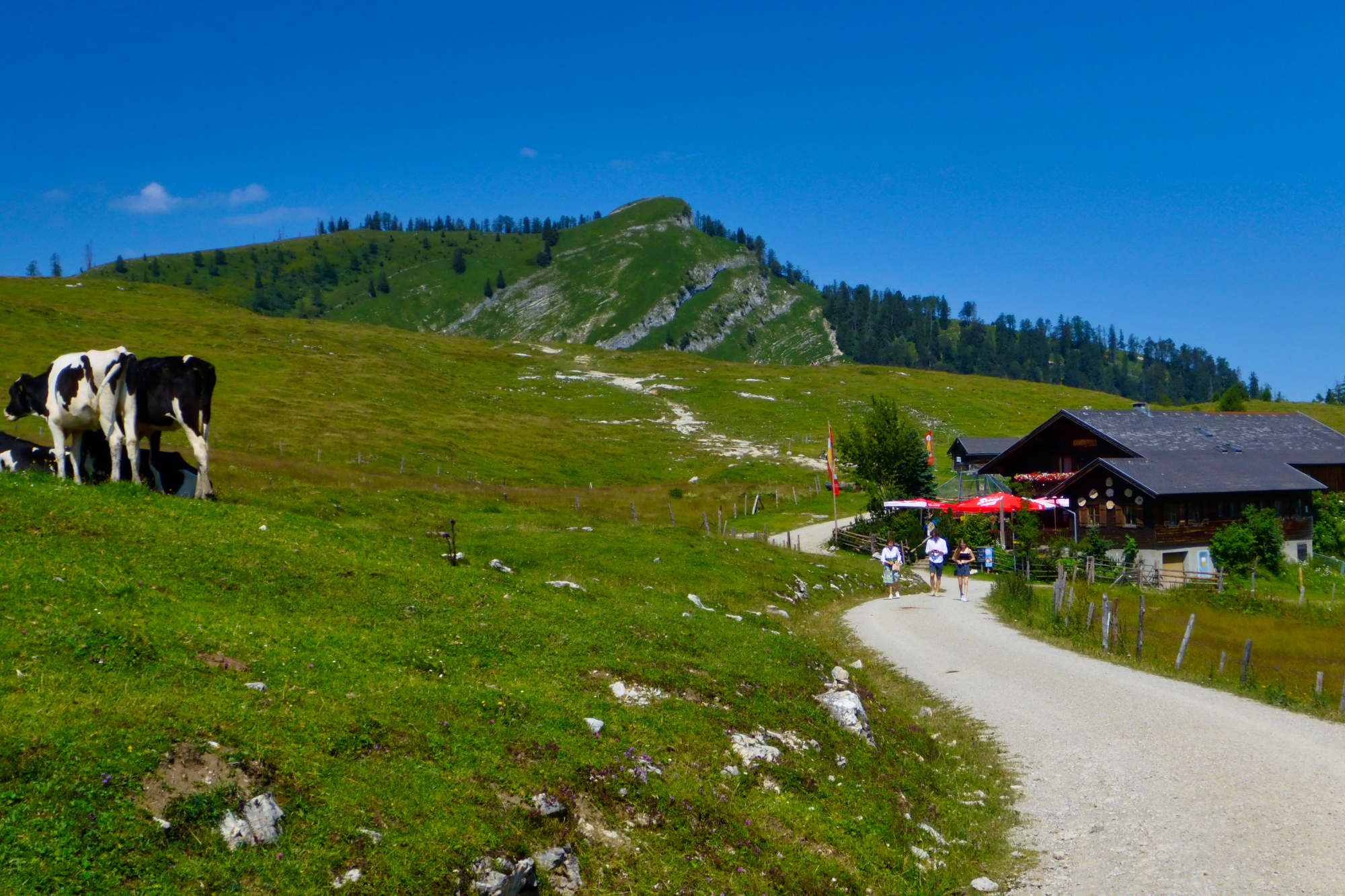 Wir genossen die gemütliche Wanderung über die Alm, wo Kühe hier ihre Sommerfrische verbrachten. Nur heiß war es trotzdem. Kein Wunder, hatte es im Tal doch 35°C an diesem Tag gehabt, da ließ es sich auf der Alm schon eher aushalten. Die paar harmlosen Anstiege brachten uns trotzdem ins Schwitzen und es war schon ein bisserl was los auf diesem Wanderweg Richtung Ausblicksgipfel.