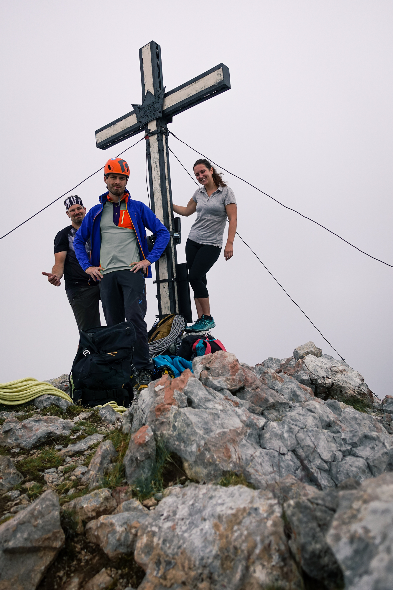 Die letzten Meter zum Gipfelkreuz ließen ein richtig erhabenes Gefühl aufkommen und als sich die Wolke, die uns in ein dunkles Grau hüllte, verzog, sahen wir, wie sich in weiter Ferne eine Front aufbaute. Geplant war ursprünglich, dass wir um 12 Uhr am Gipfel sein sollten, was wir um 1 Stunde überschritten hatten. Glücklicherweise hat sich das Wetter entschieden uns wohlgesonnen zu sein und wir konnten den heiklen Abstieg trocken hinter uns bringen.