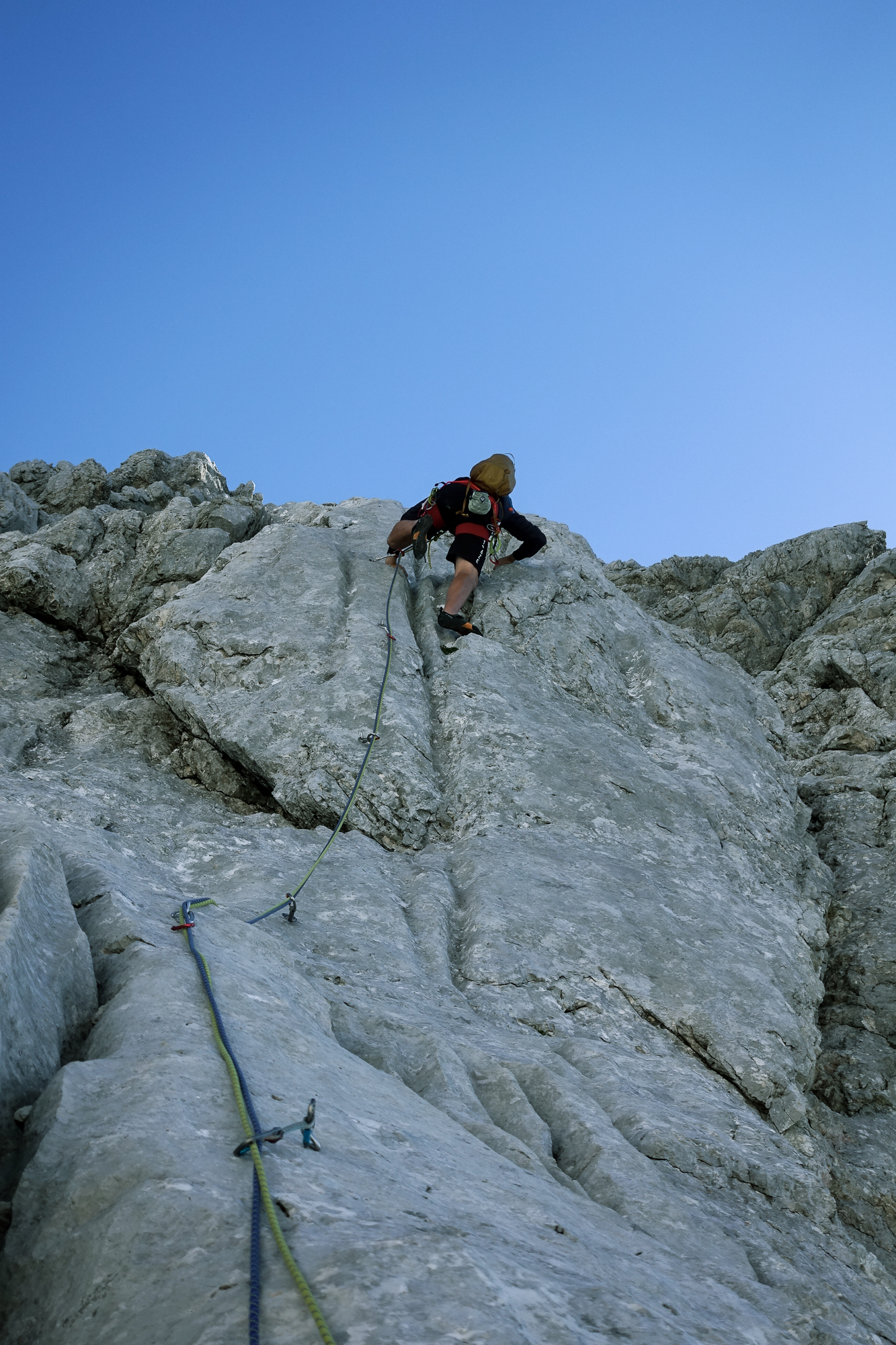 Sehr flott führte Stefan die 5 Seillängen bis knapp unter den Südgrat und nun übernahm ich die Führung im alpinen Gelände des Südgrats. 10 Klemmis und Camalots 0,5 – 2 hängen zusätzlich an meinem Gurt.