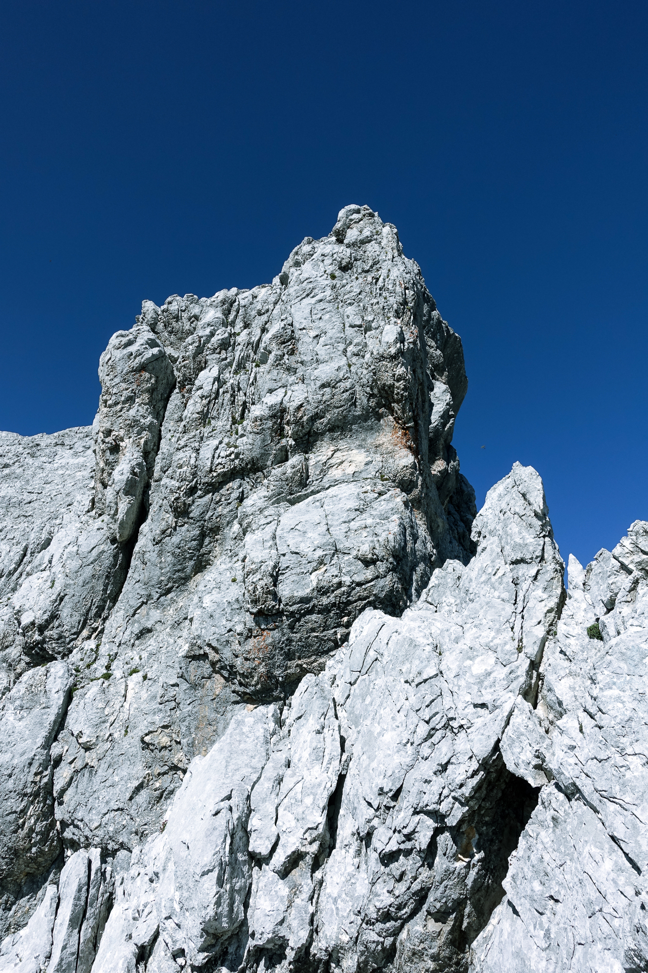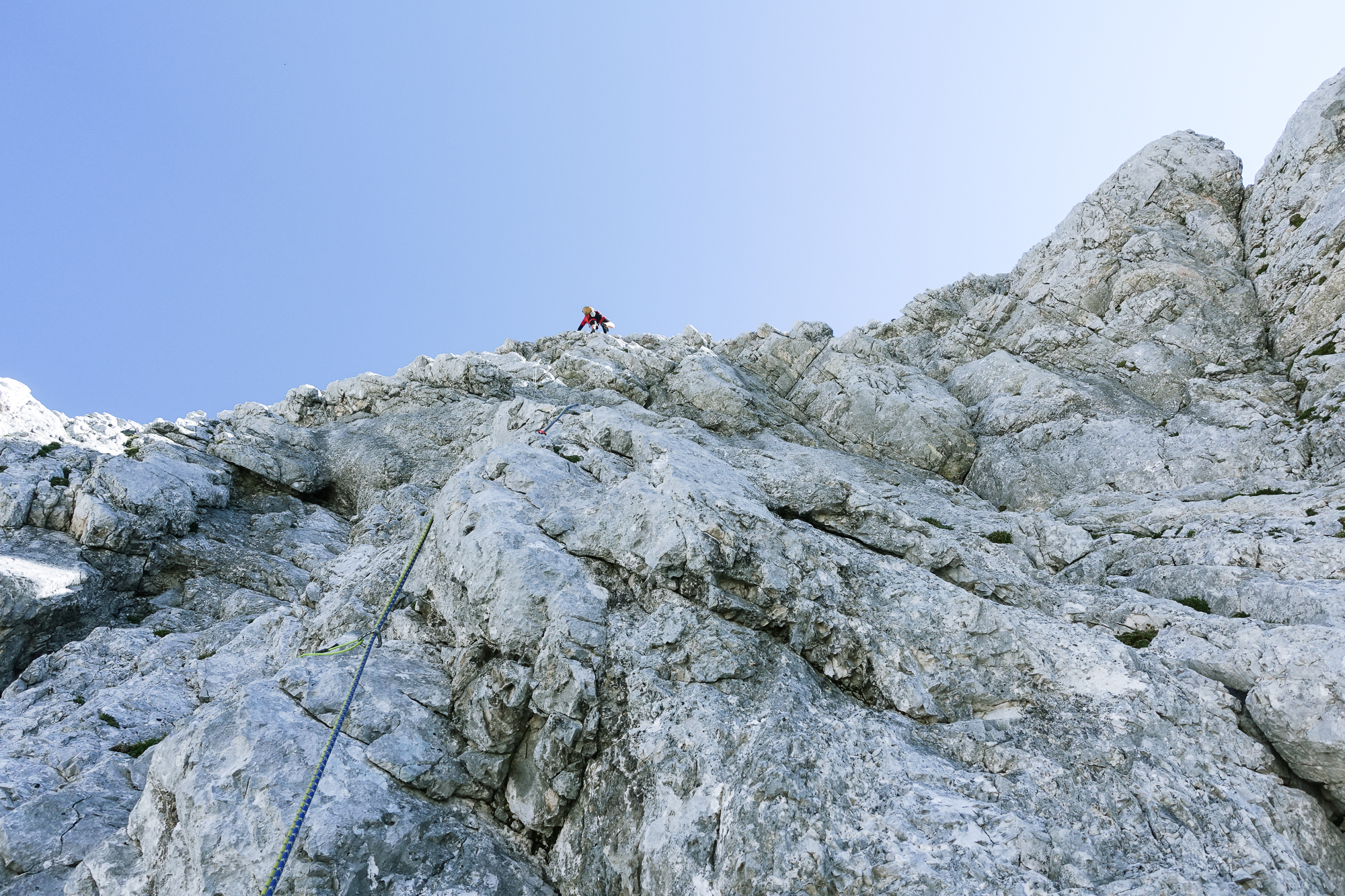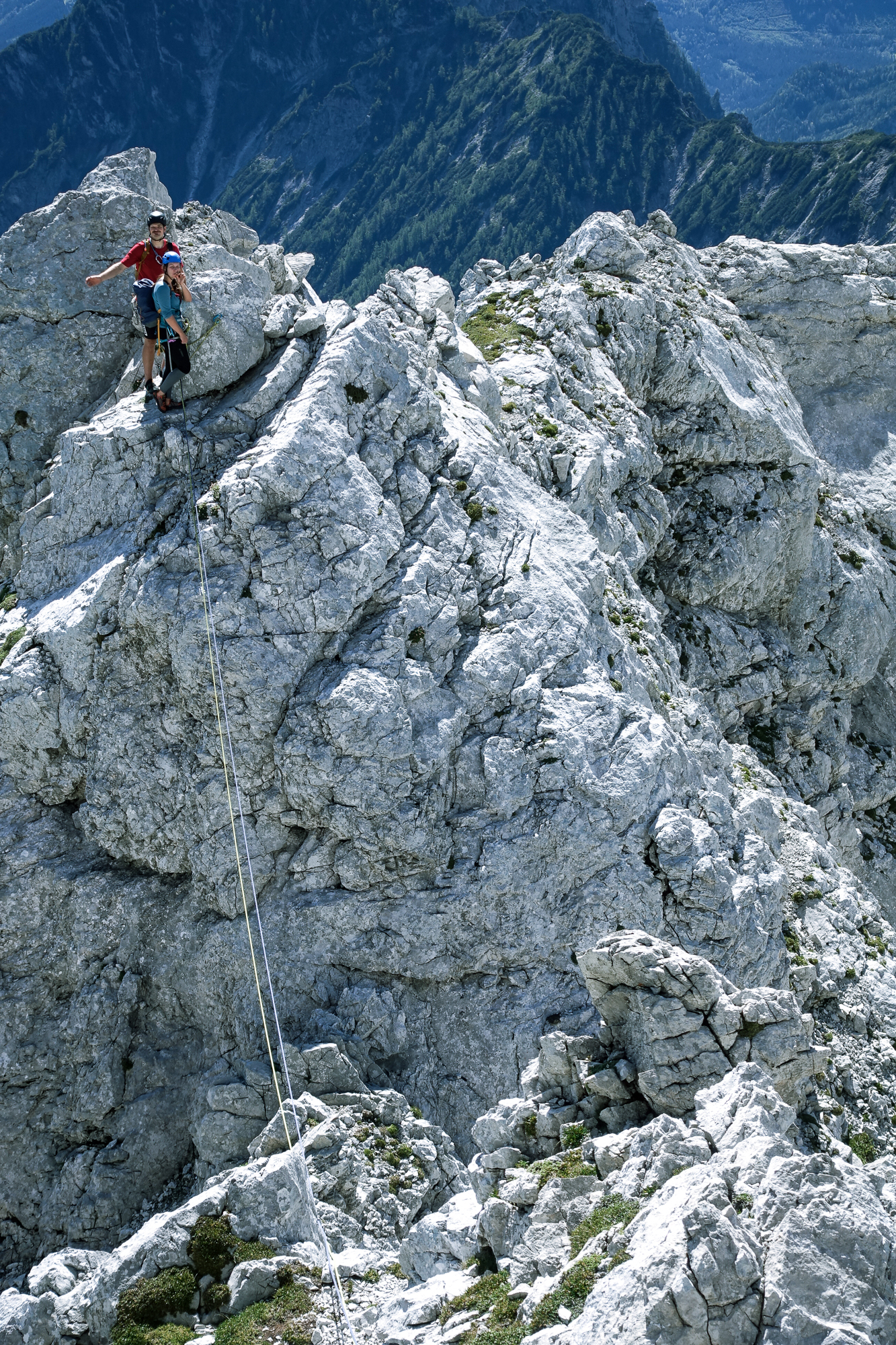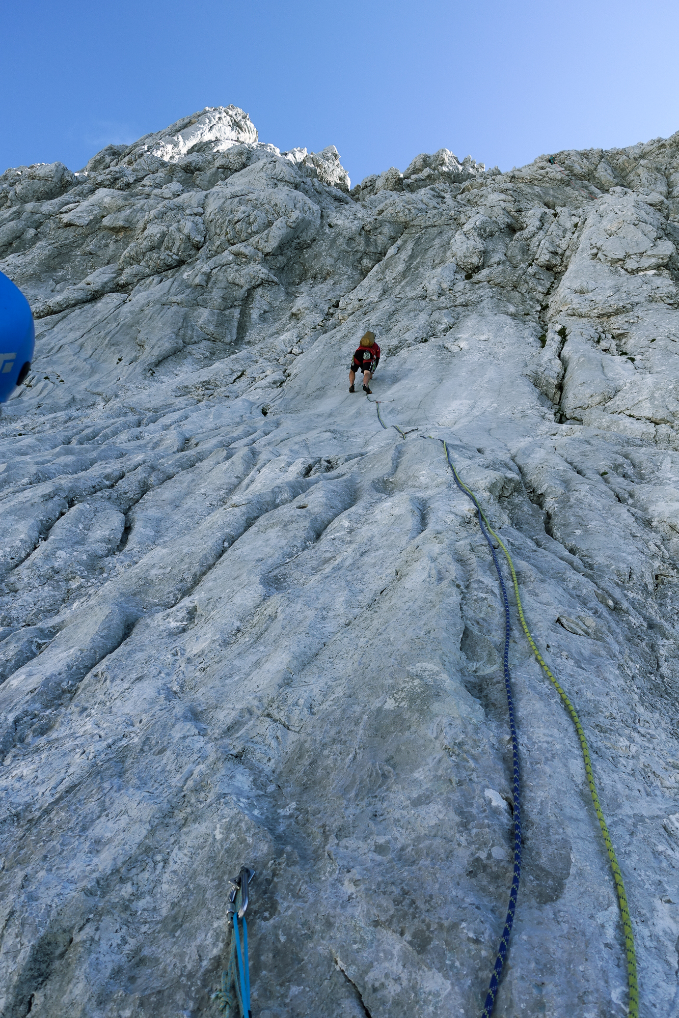 Die 1. Schlüsselstelle, der kurze Überhang, ist zwar gut abgesichert aber auch gut abgeschmiert. Außerdem verlangt er eine gewisse Körpergröße (>180cm) um leicht drüberzuklettern. Beherzt angreifen mussten wir aber alle und vor allem Kleinere sollten die Stelle nicht unterschätzen. Im Übrigen war das Sichern am Grat oft eine Qual. Scharfe Kalkfelsen, Nischen oder Risse bremsten das Seil als wäre ein Prusik eingeknüpft worden. Meine Idee ein Stück am laufenden Seil zu klettern war dann ein veritabler Verhauer, der uns nur Zeit kostete und ich mit einem selbst gebauten Stand (wunderschön btw!) wieder ausbügeln musste.