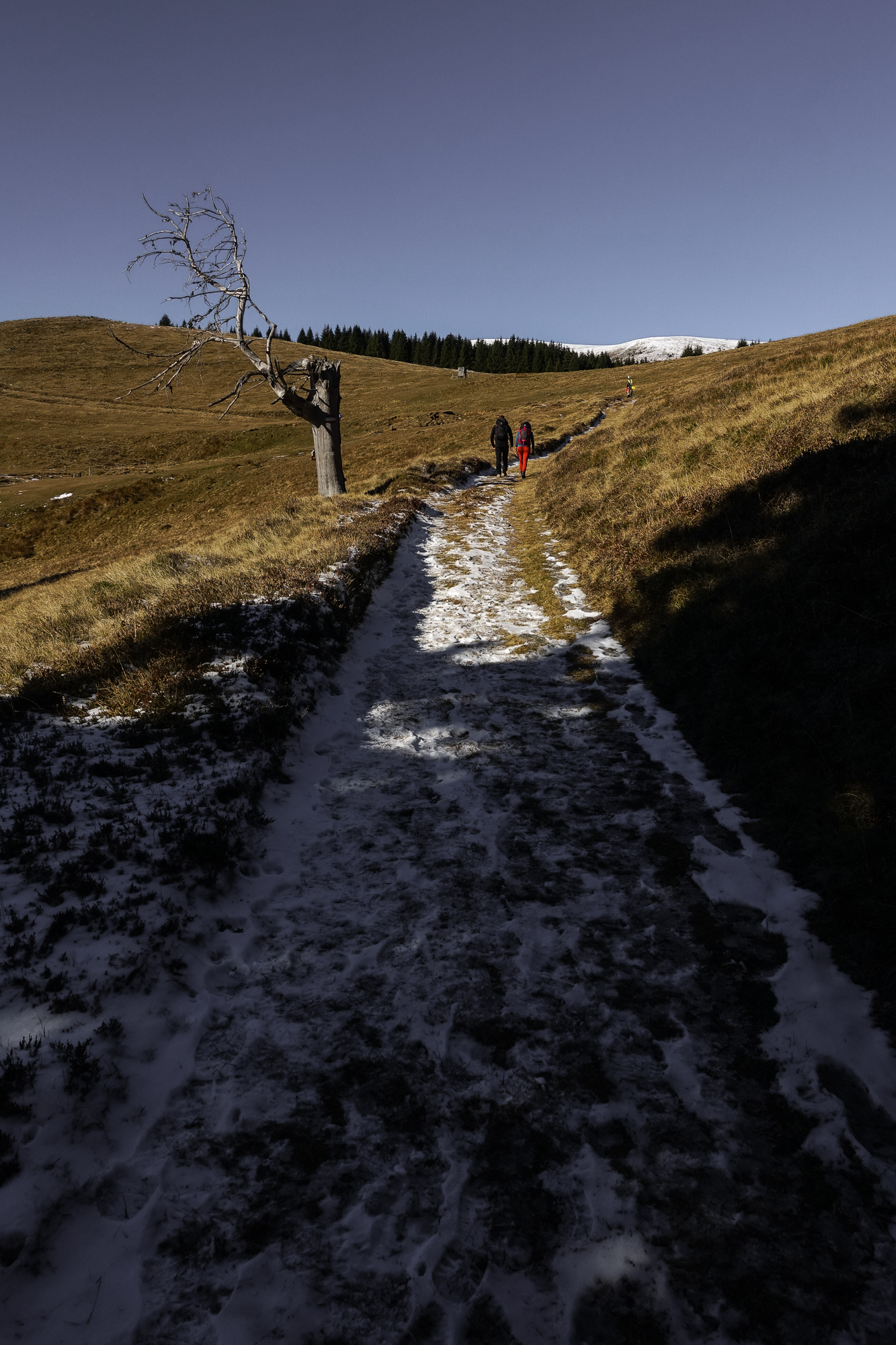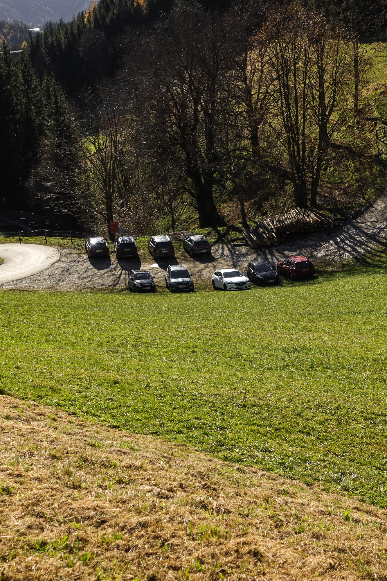 Alleine waren wir hier ganz und gar nicht. Es standen doch einige Autos am Parkplatz und deren Besitzer waren, wie wir, auf der Suche nach Durchlüftung des Oberstübchens und sportlicher Betätigung – was eine nette Umschreibung dafür ist, dass zu dieser Zeit eigentlich eine 24-stündige „Ausgangsbeschränkung“ herrschte (wieder einmal) aber es jedem ziemlich egal war und man sich zu jeder Zeit und an jedem Ort draußen bewegte. Gefühlt waren jedenfalls 300% mehr Wanderer unterwegs als an einem vergleichbaren Tag in den letzten Jahren.