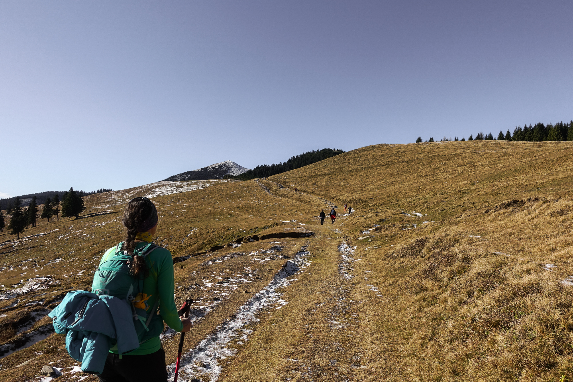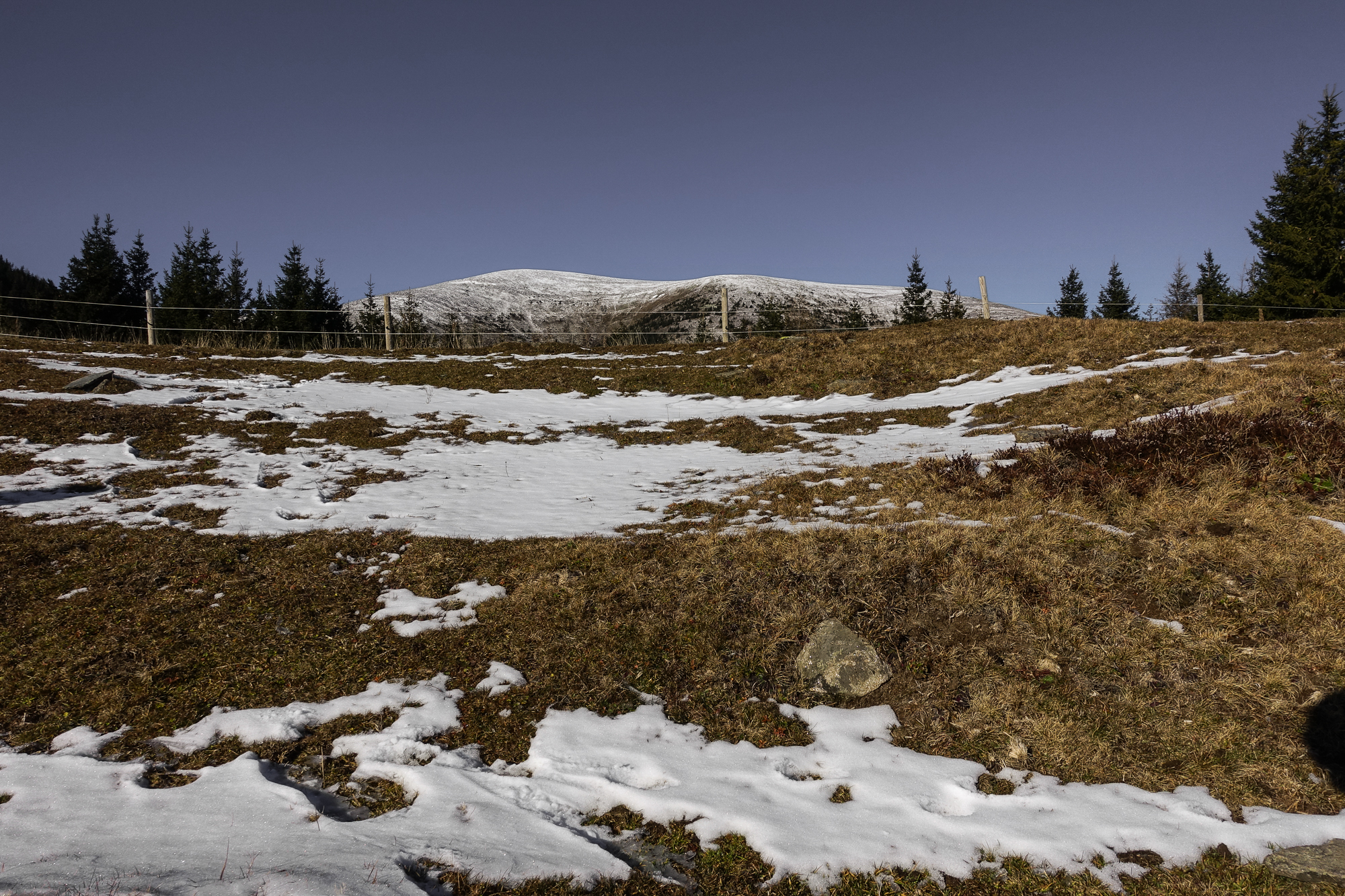 Kaum waren wir aus dem Wald, konnten wir eine herrliche Aussicht auf den Roßbachkogel und die Gleinalm genießen. Die Brendlalm, auf der im Sommer die Lipizzaner ihre Sommerresidenz haben, ist in der warmen Jahreszeit sicher auch einen Ausflug wert.