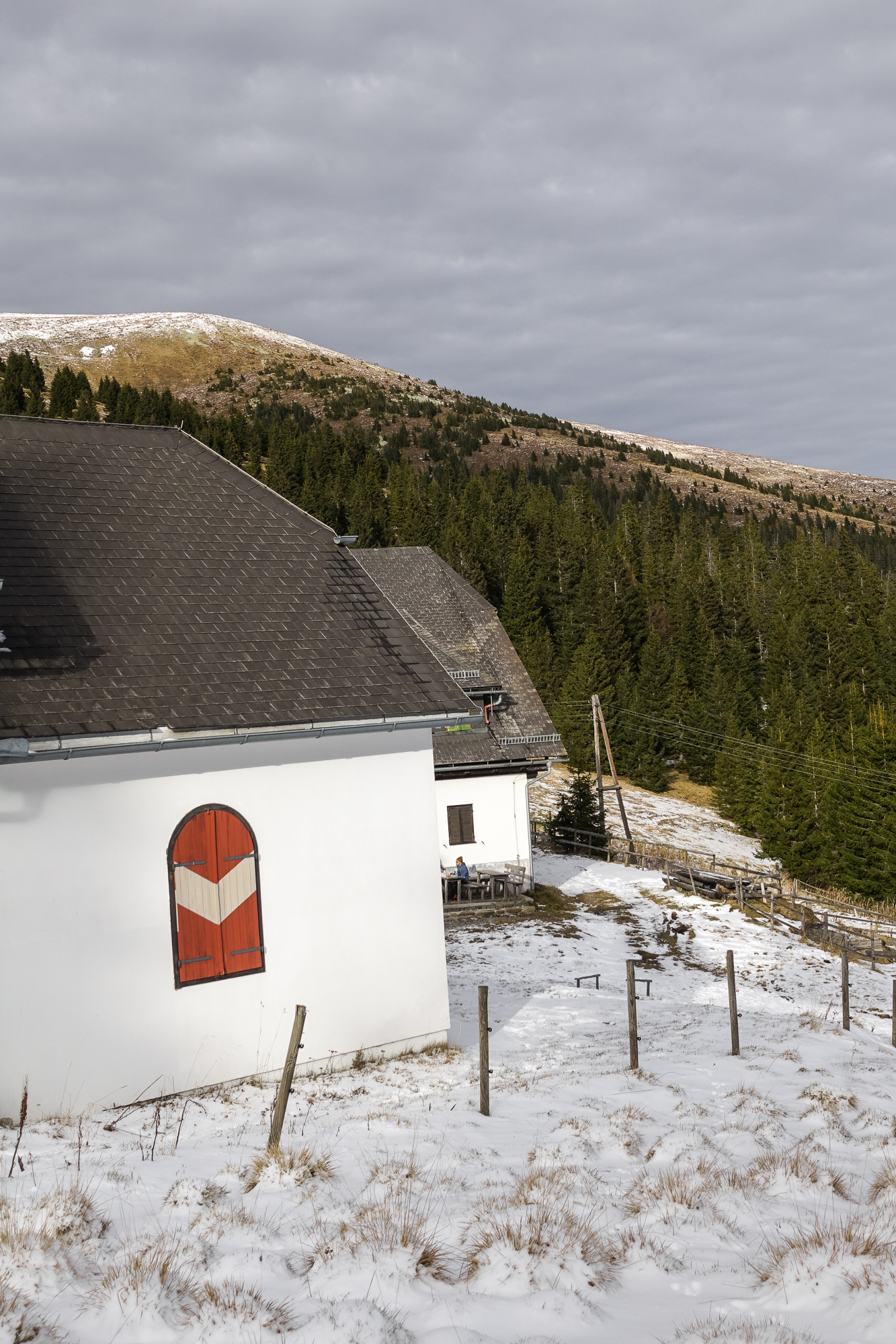 Kurz ging es aus der Sonne durch den Wald Richtung Gleinalmschutzhaus, welches im Winter geschlossen hat. Übrigens war der Winterraum ebenfalls verschlossen, aber viele Wintertourenwanderer verirren sich ja nicht hierher oder steigen ab.