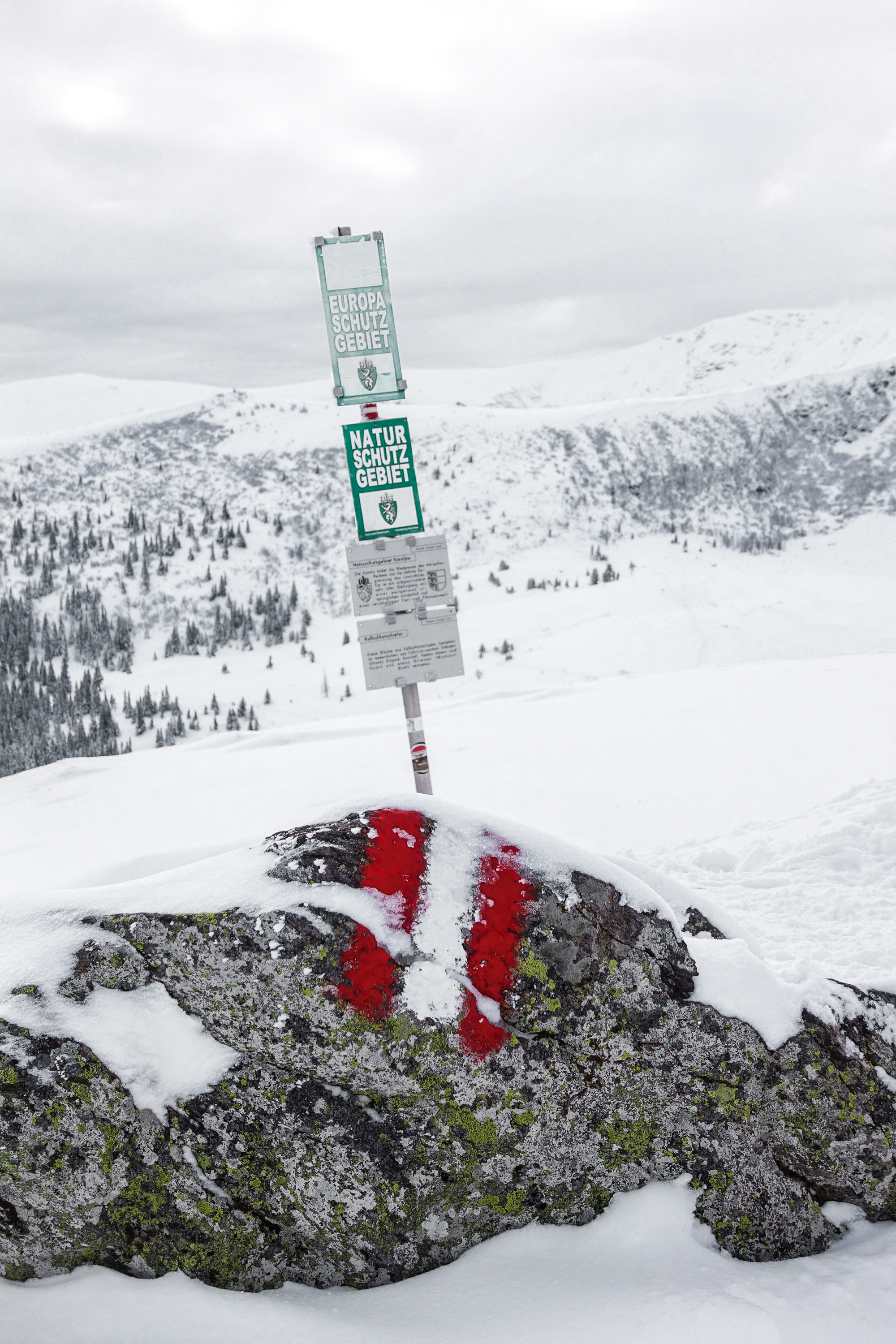 Wenige Höhenmeter unter dem Moschkogel, bei den Tafeln des beginnenden Europaschutzgebietes der Koralpe machten wir eine kurze Rast und beschlossen zurückzugehen. Hier war der aufkommende Hunger in Kombination mit der Kälte doch stärker als der Wille den Gipfel mitzunehmen. Trotzdem war es eine sehr schöne Tour und bekommt meine Empfehlung 😉