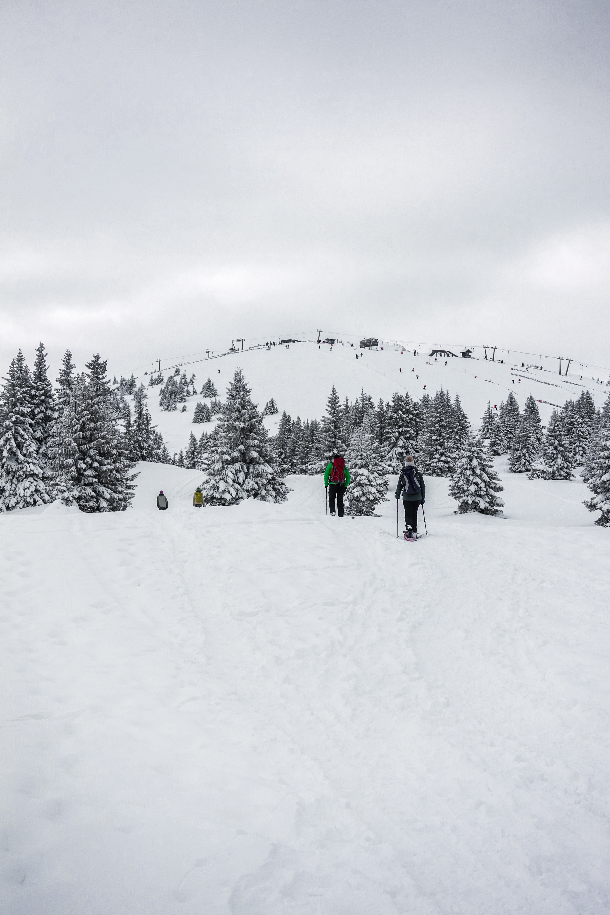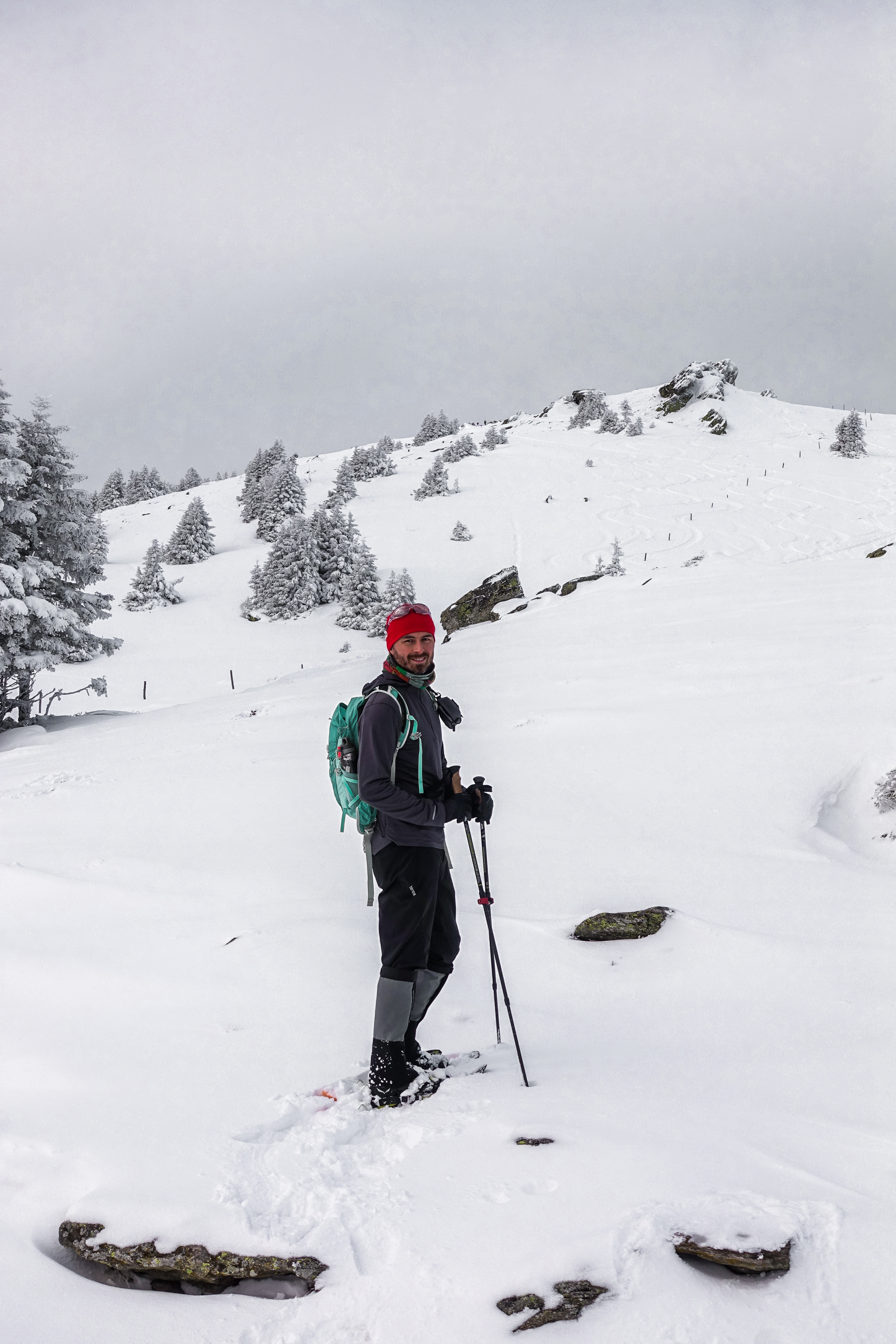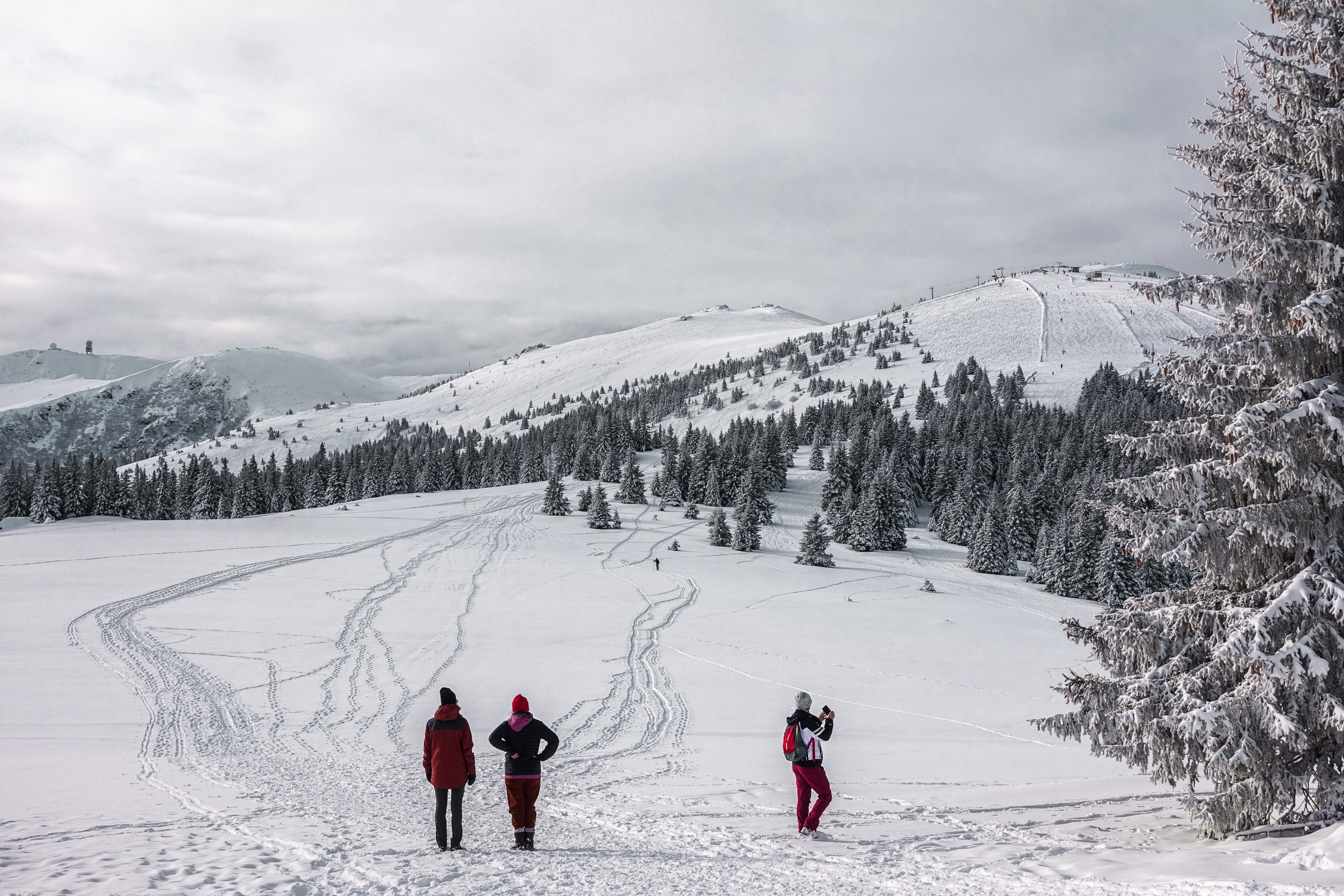 Die Weinebene präsentierte sich Ende Dezember frisch angezuckert, kalt, es gab wenig Wind und zwischendurch sogar etwas Sonne. Nachdem wir noch einen Parkplatz ergatterten stapften wir zuerst mit unseren Wanderschuhen Richtung Moschkogel. Der Schnee neben der Piste war zwar schon etwas planiert, aber unangenehm zu gehen. So schnallten wir schon bald unsere Schneeschuhe an die Füße und konnten wesentlich schneller und ohne zu rutschen dahinmarschieren.