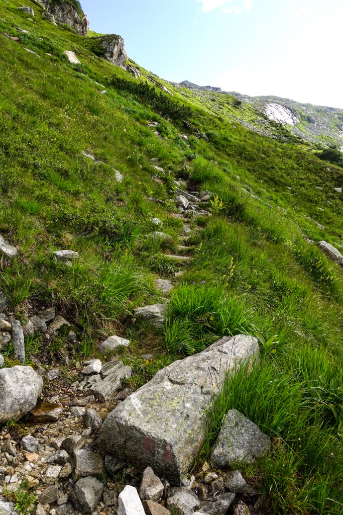 So blieb es dann nicht sehr lange, denn nach der Jagasteighütte zweigte es rechts ab und ab da darf man ordentlich Höhenmeter herunterspulen. Ca. 500HM sind es ab hier bis zur Marchkarscharte, unser erstes Ziel für heute.