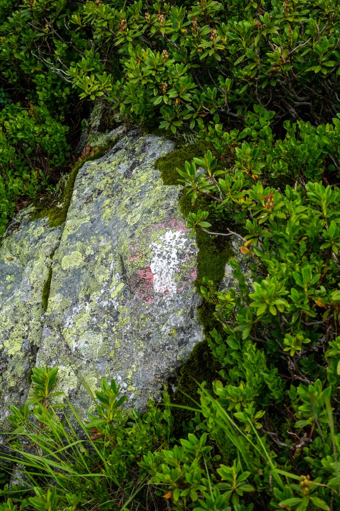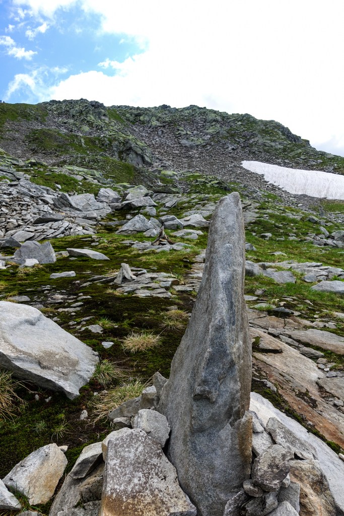 Einige Wegmarkierungen waren schon Zusehens verblasst und versteckten sich hinter einer leichten Flechtenschicht. Abschnittsweise markierten Steinmänner den Weg (siehe Foto) und wir kamen eigentlich problemlos zur Scharte hinauf. Zwischendurch gingen wir über Geröllfelder, die aber recht stabil waren und kaum wackelige Steine boten.