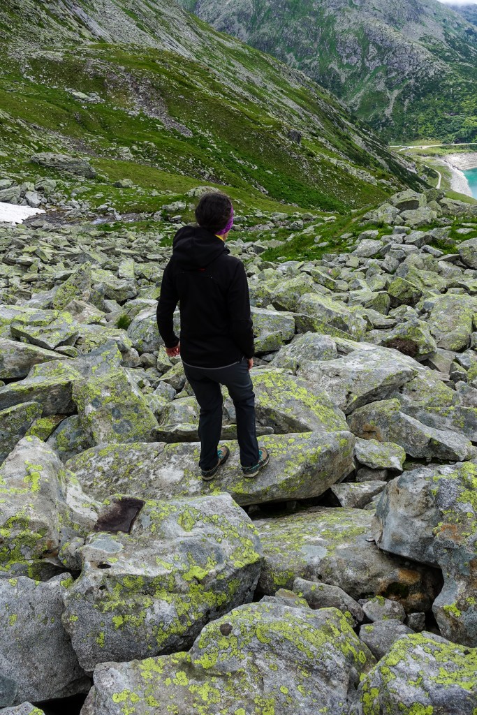 Auf der Marchkarscharte angekommen empfing uns ein eisiger Wind und wir redeten kurz mit anderen Hotelgästen, die heute noch bis zur Sticklerhütte weitergehen wollten. Die aufziehenden Wolken und der beißende Wind ließ uns aber umkehren. Wir überlegten noch, ob wir den unmarkierten Weg auf den Marchkarspitz gehen sollten, waren aber etwas unschlüssig weil es anfangs recht felsig und zum Klettern aussah. Deswegen gingen wir denselben Weg zurück. Später stellte sich aber heraus, dass das felsige Stück nur anfangs bestand und vielleicht ein paar 1er und 2er Stellen sich darin befunden haben. Danach mündete die Kraxelei in einen normalen Weg Richtung Arlscharte (bzw. kann man den Marchkarspitz als Gipfel mitnehmen). Wäre auch möglich gewesen, aber mit unserer Sicherheitsvariante sind wir bisher immer gut gefahren 😉