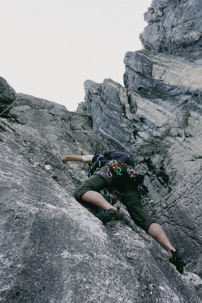 Erst die 4. und 5. Seillänge haben wieder tolle Kletterei an rauem, festen Fels geboten. Die 6- Stelle war für mich etwas unübersichtlich, aber wenn man die Griffe über dem Bauch gefunden hat, kommt man gut drüber. Danach kam wieder eine Schrofenlänge zur Erholung bevor es ins steile Finale ging.