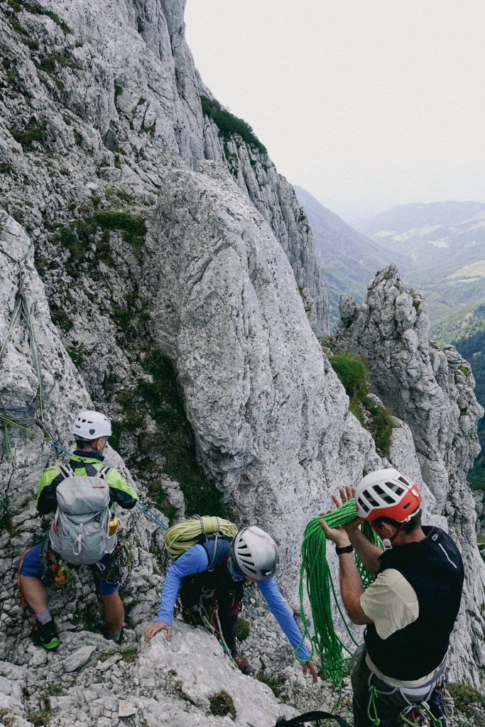 Der Abstieg zum Führerweg hat es allerdings nochmal in sich. Man seilt von einem Stand ab, der aus 2 Schlaghaken besteht. Die Reepschnüre waren zwar relativ neu, aber hier könnte eine motivierte Person schon mal nachbessern mit Normbohrhaken – wir sind ja nicht in den Dolomiten.