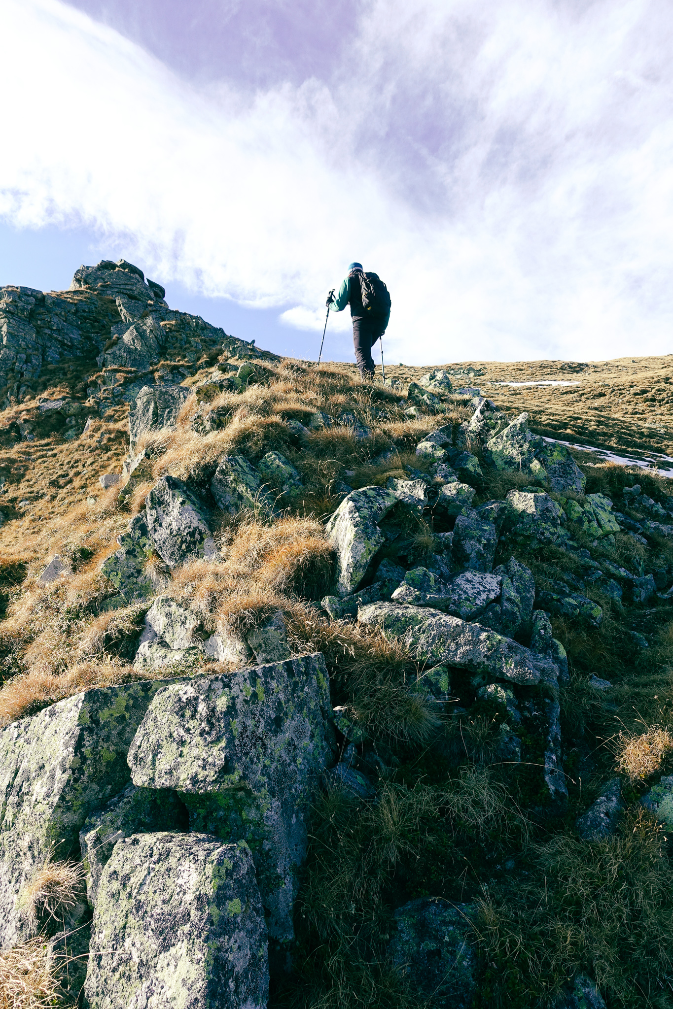 Dieser Weg ist ungemütlich zu gehen, durch die Steilheit und die Graspölster muss man sehr achtsam sein und genau darauf achten, wohin man steigt.