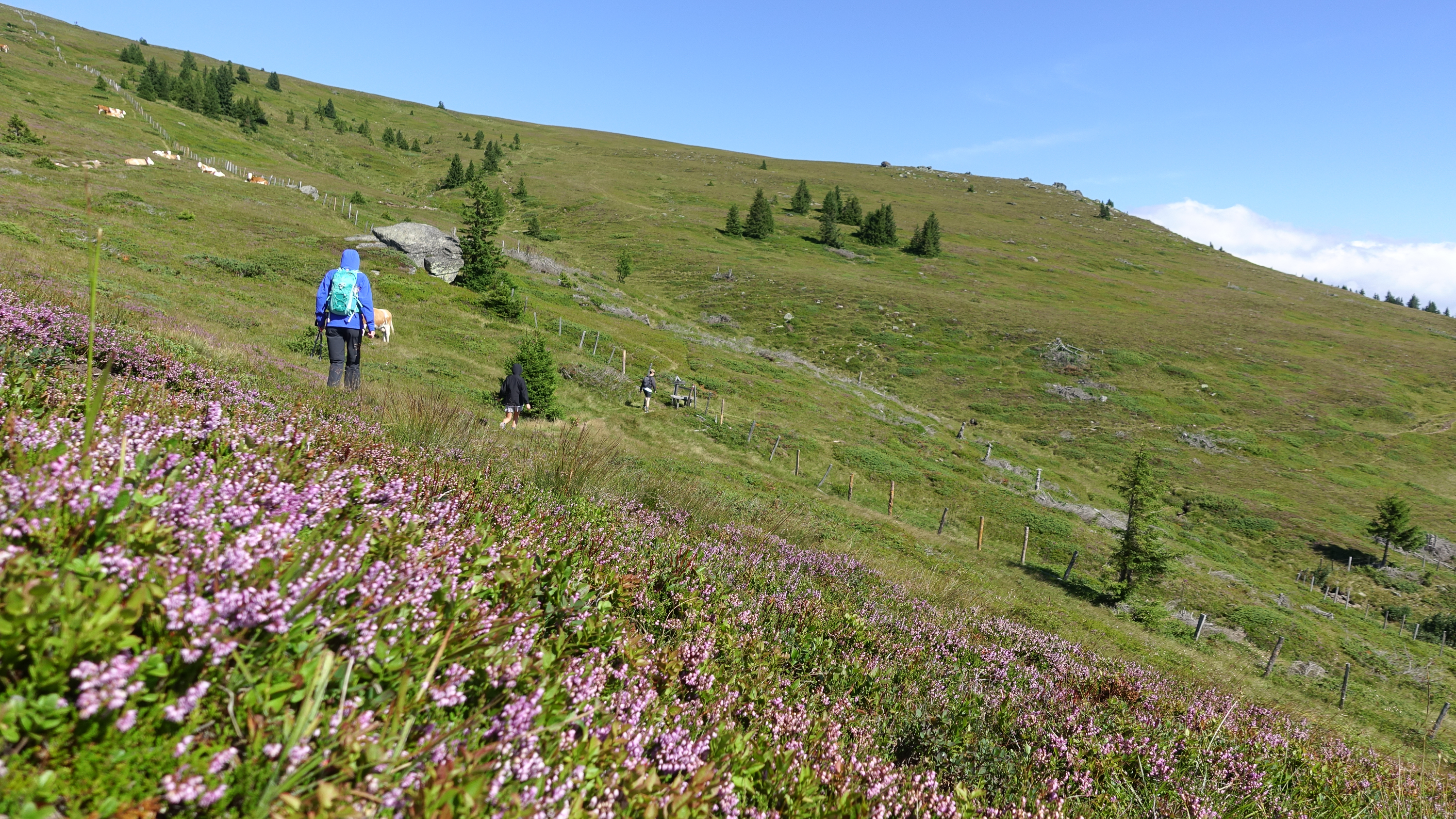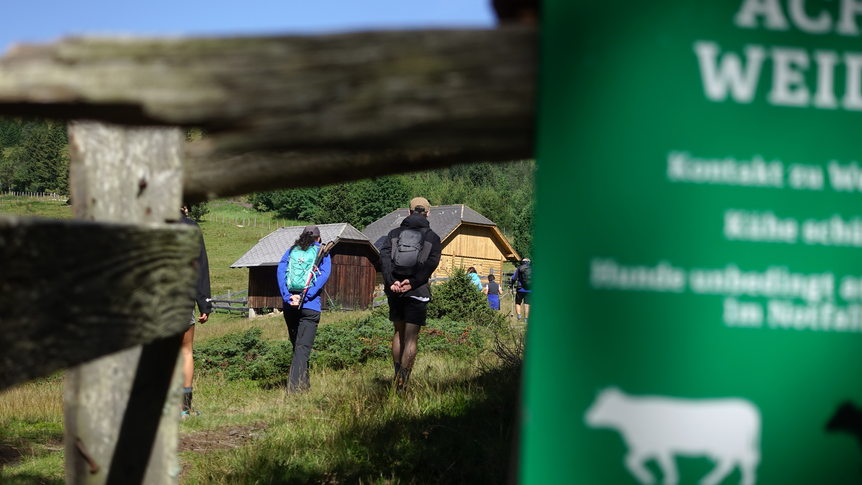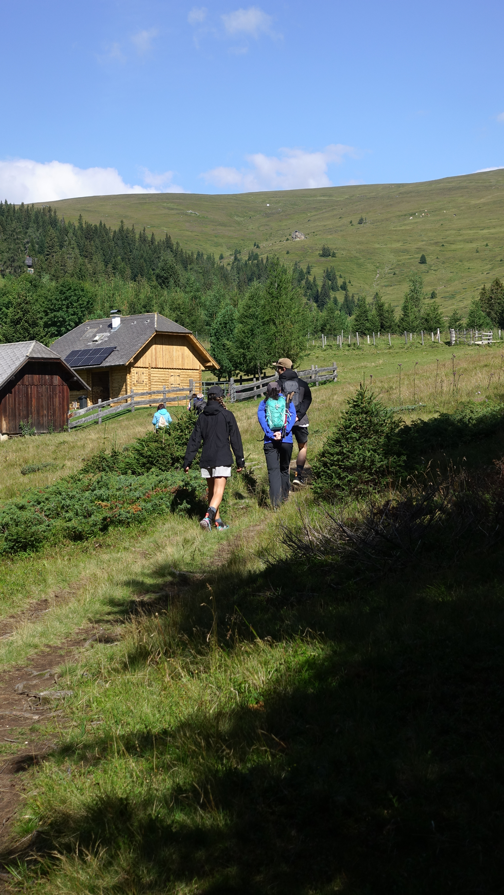 Unsere Wanderung begann nicht wie die klassische Hüttenrunde sondern in entgegengesetzter Richtung. Von der Zechhütte Richtung Offnerhütte ging es zuerst auf der Schotterstraße und später über die erste Almwiese mit Kühen. Bei der Offnerhütte vorbei, wurden die Markierungen etwas weniger und wir stiegen, Trittspuren folgend, nach oben auf den Kamm. Ab und zu sahen wir noch eine verblasste Markierung, diese wurden dann erst wieder auf dem Steiglein Richtung Ruprechtsfelsen besser.