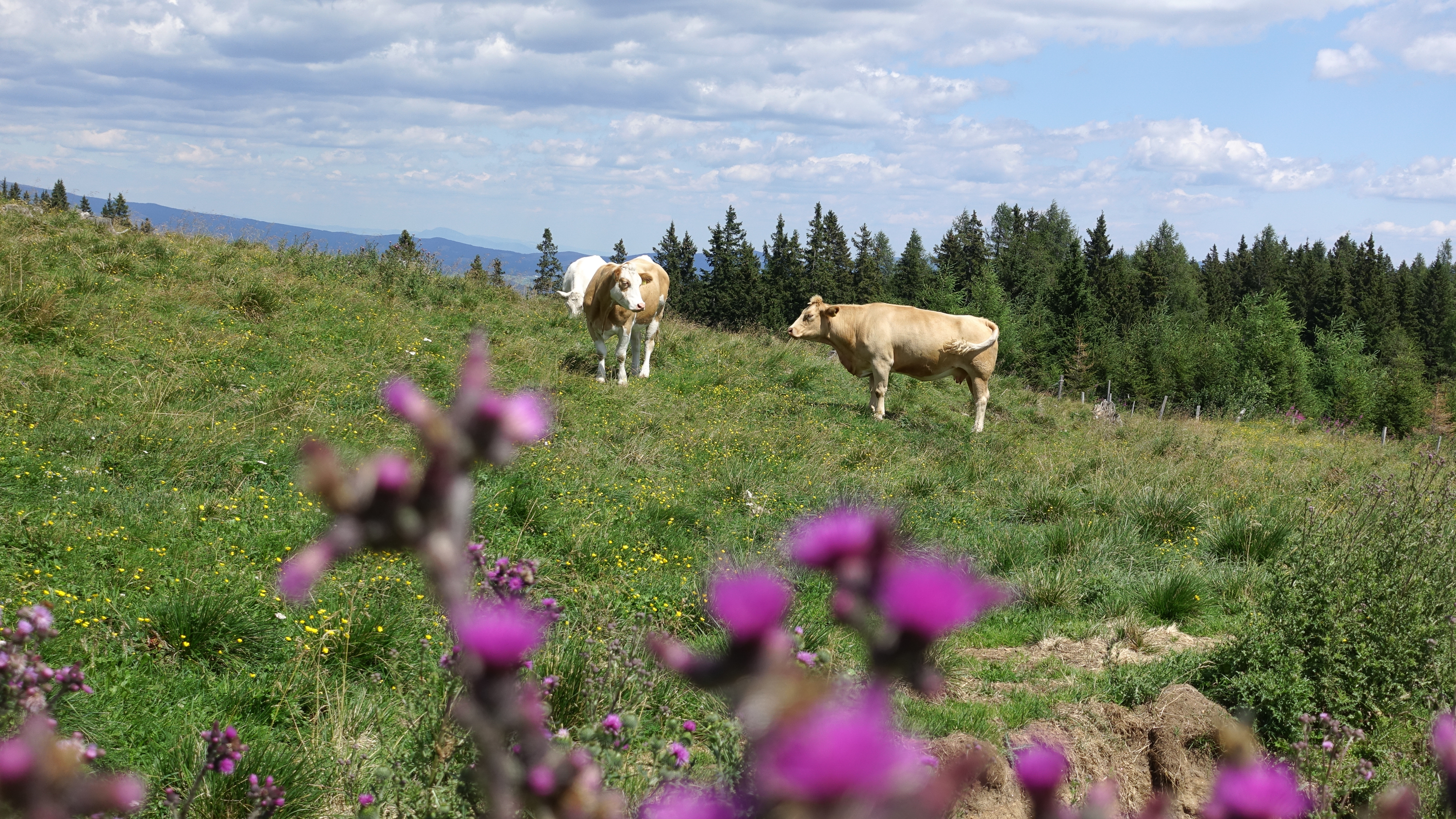 Supertolle Gegend! Die Saualm habe ich bisher wohl sträflich vernachlässigt, bietet sie doch genau die Gegend, in der ich so gerne unterwegs bin: Almen bzw. Wiesen über der Baumgrenze. Der Wind war an diesem Tag etwas nervig, aber die tolle Ladinger Hütte und das geniale Panorama in absoluter Postkartenlandschaft waren für mich die Highlights dieser Tour.