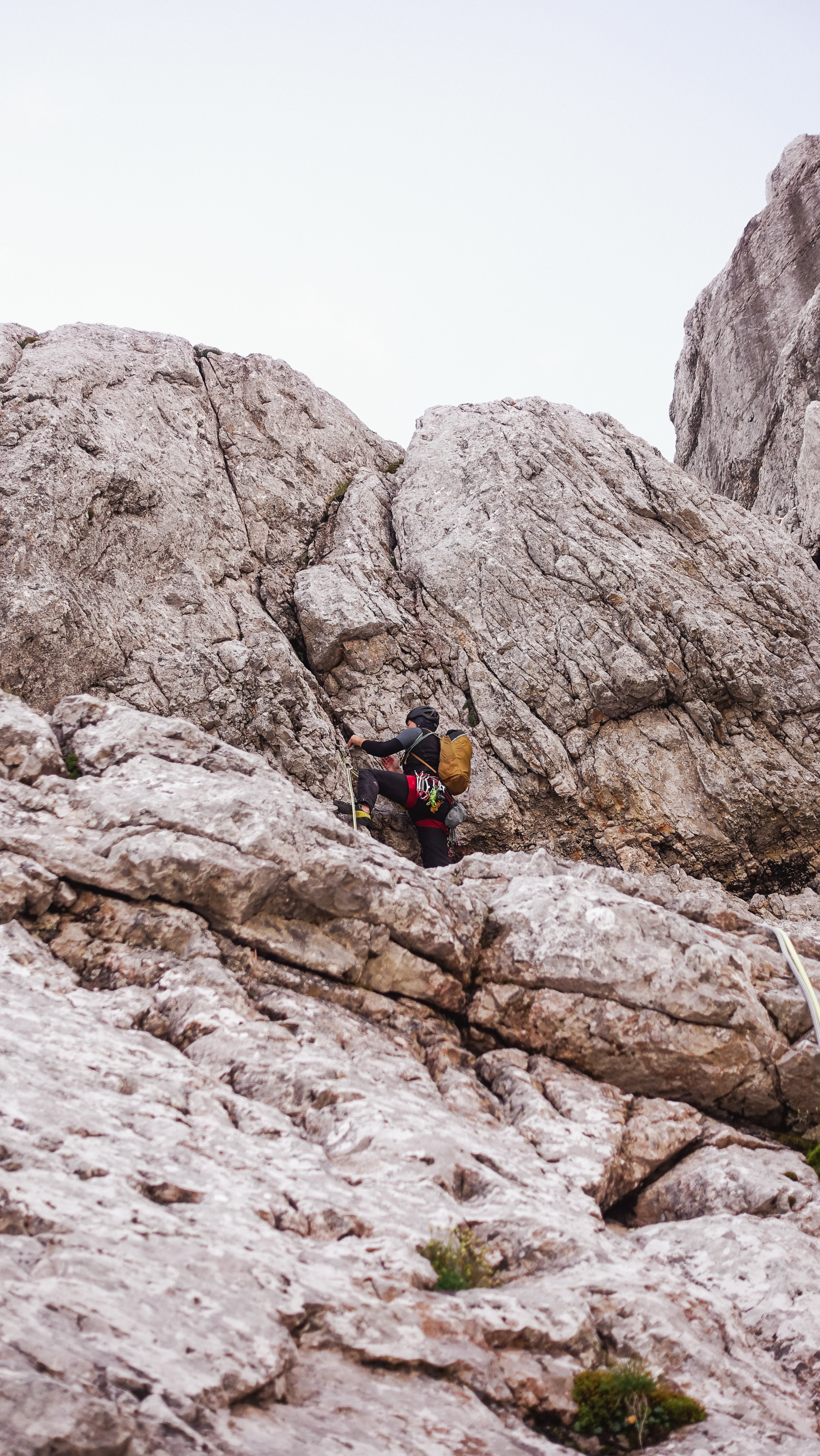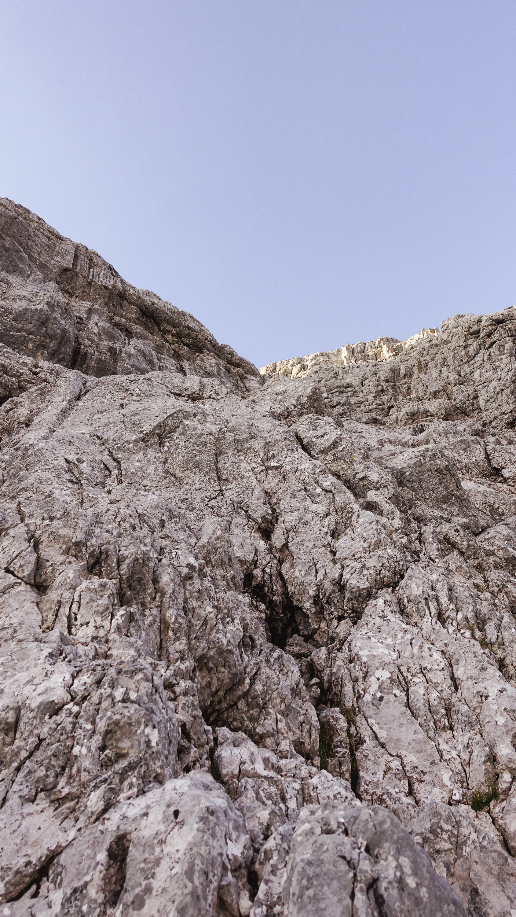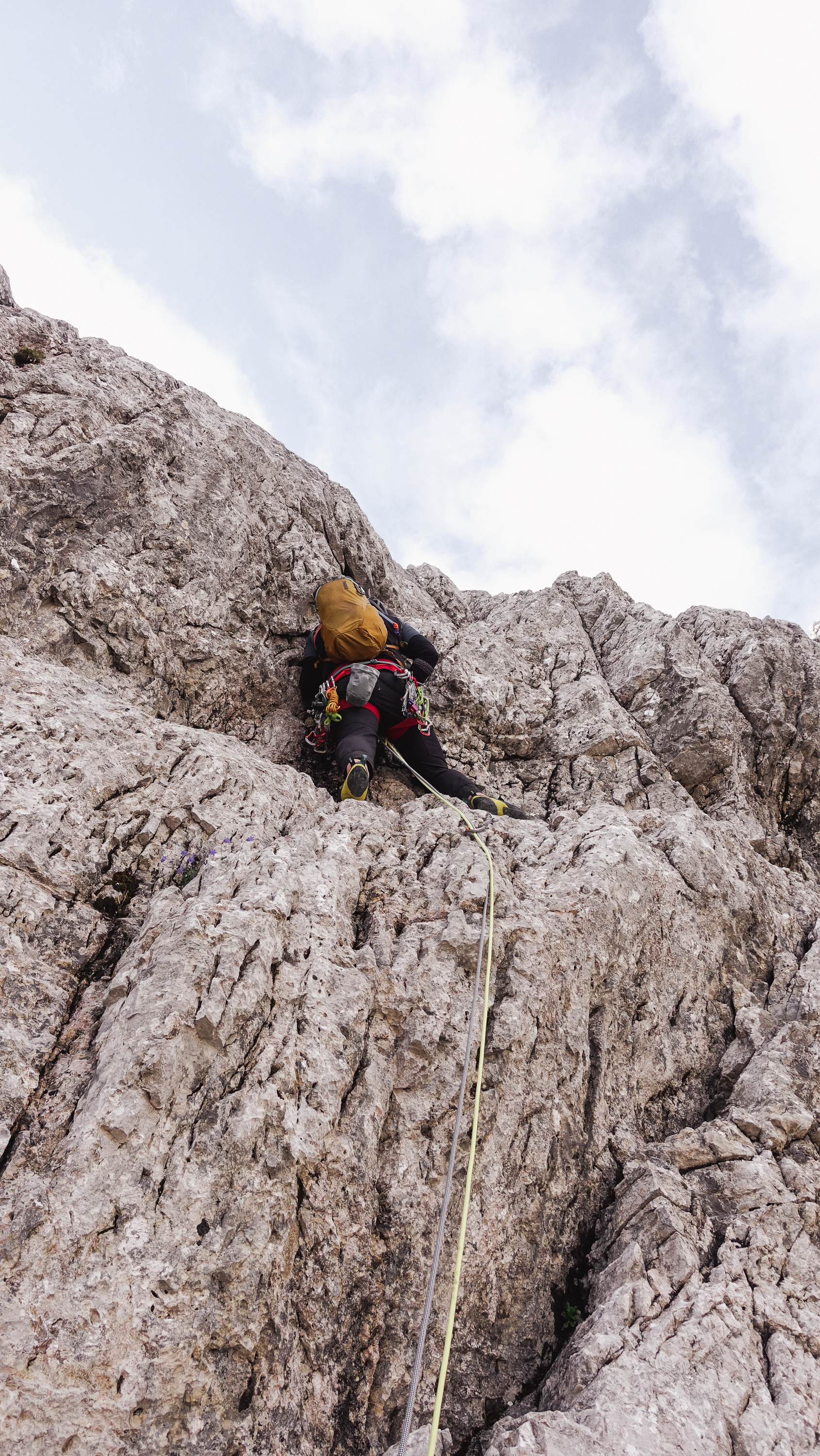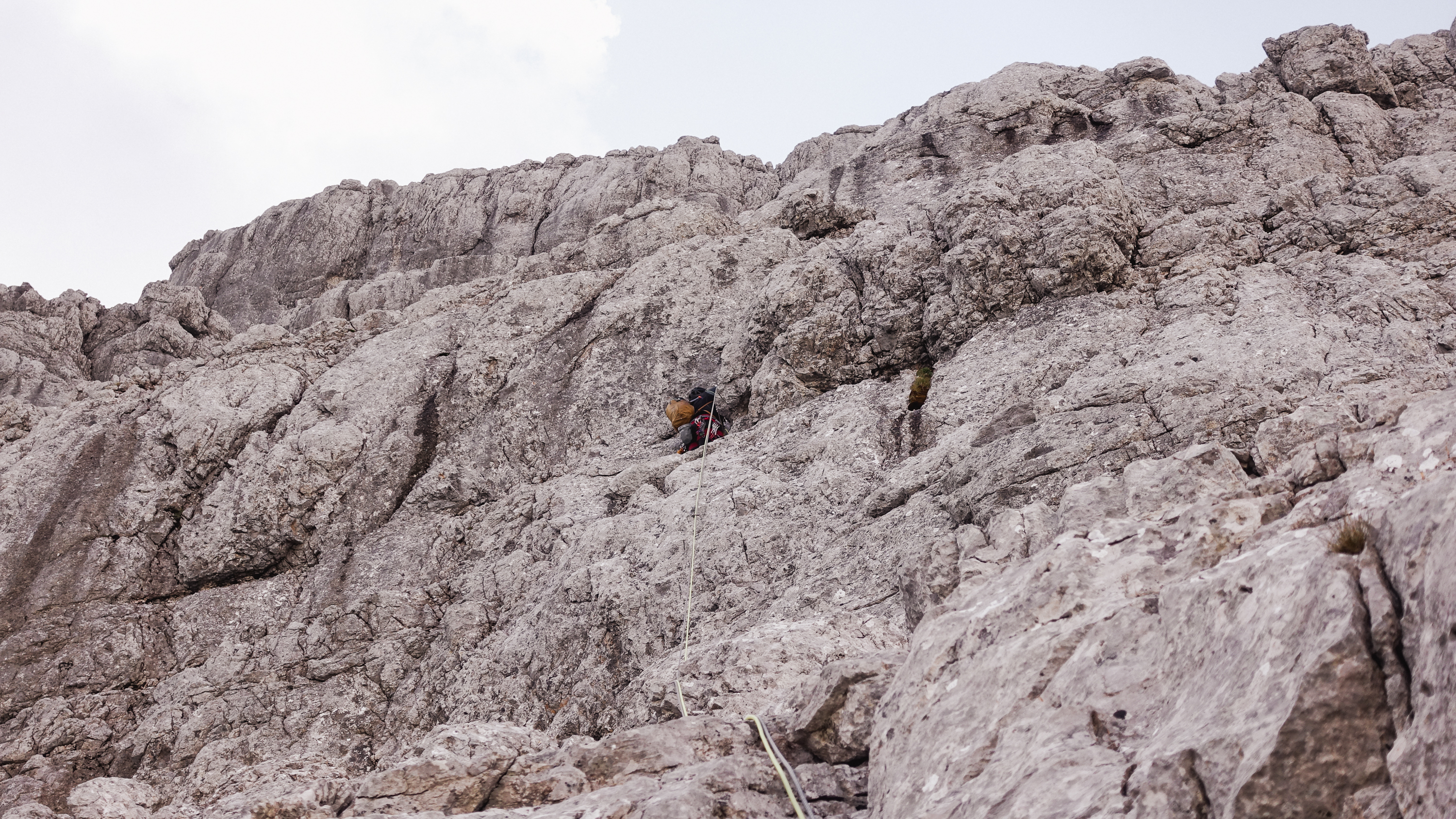 Diese Aktion hat nicht nur Zeit sondern auch ein paar Nerven gekostet, aber wir sind noch lange nicht fertig. Die nächste Seillänge klettert sich zu Beginn wieder sehr schön, ist aber nur ein weiterer, kurzer Aufschwung, danach folgen 30-40 Meter ungesichert im Geröll. Das nervt und ist gleichzeitig auch anstrengend. Schließlich bitte ich Stefan noch einmal um einen Vorsteigerwechsel, damit ich ein wenig Energie für die letzte Seillänge sparen kann.
