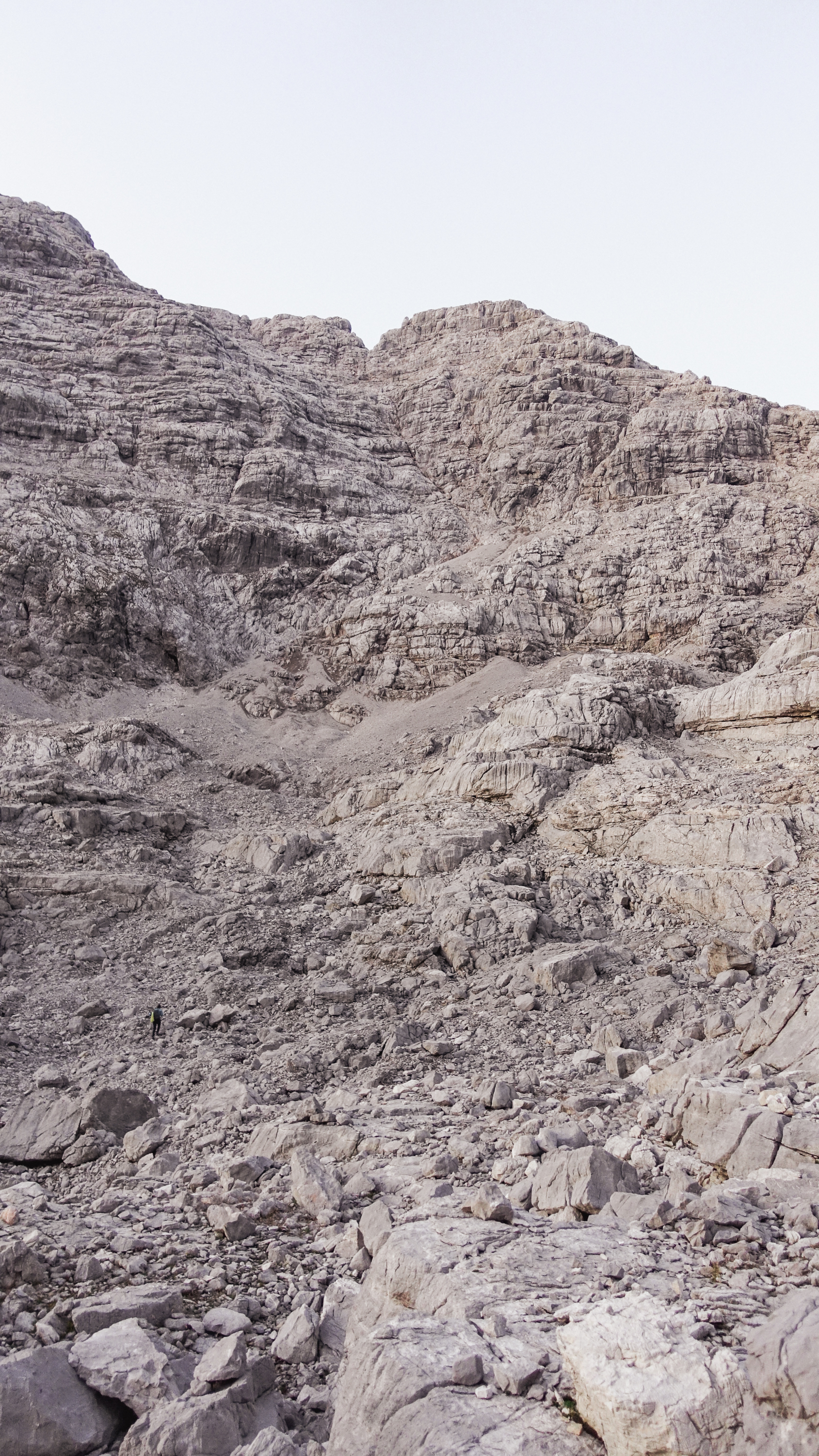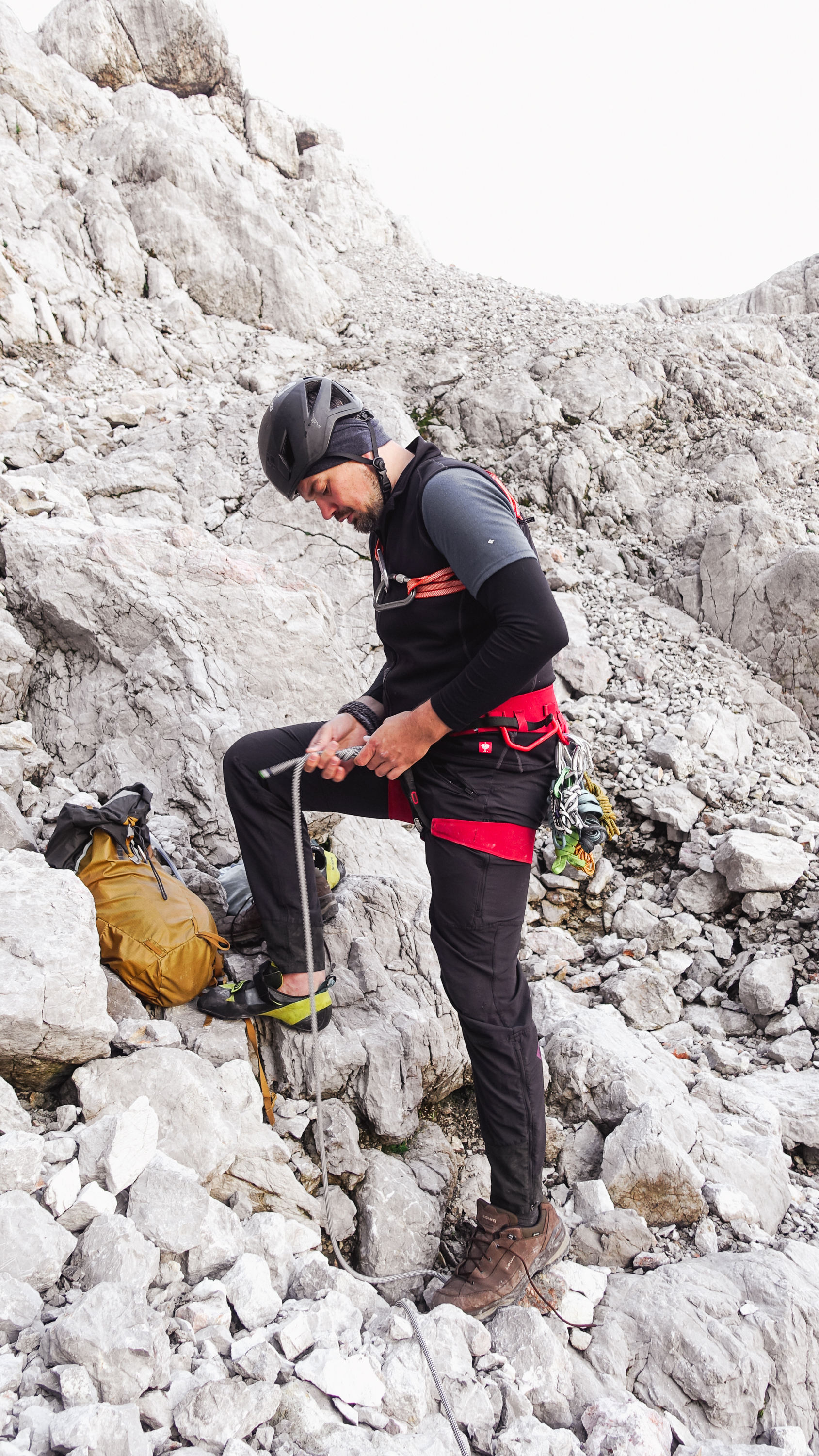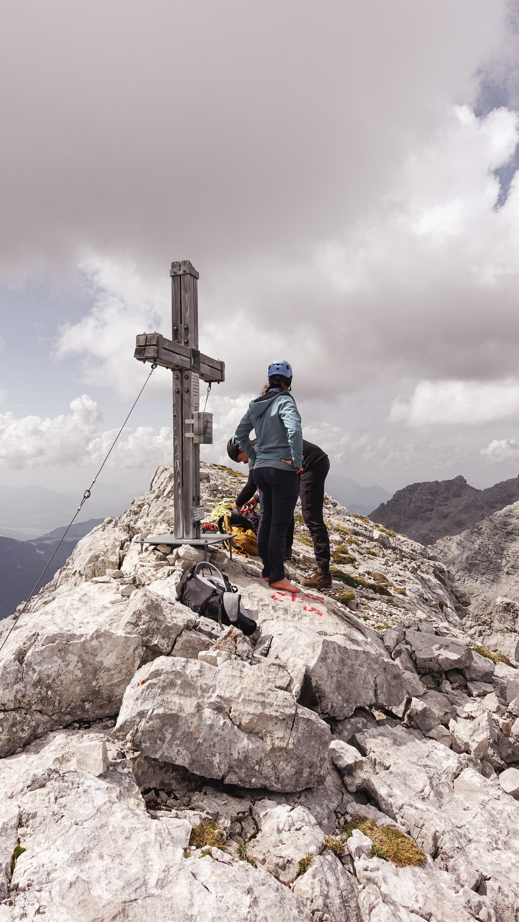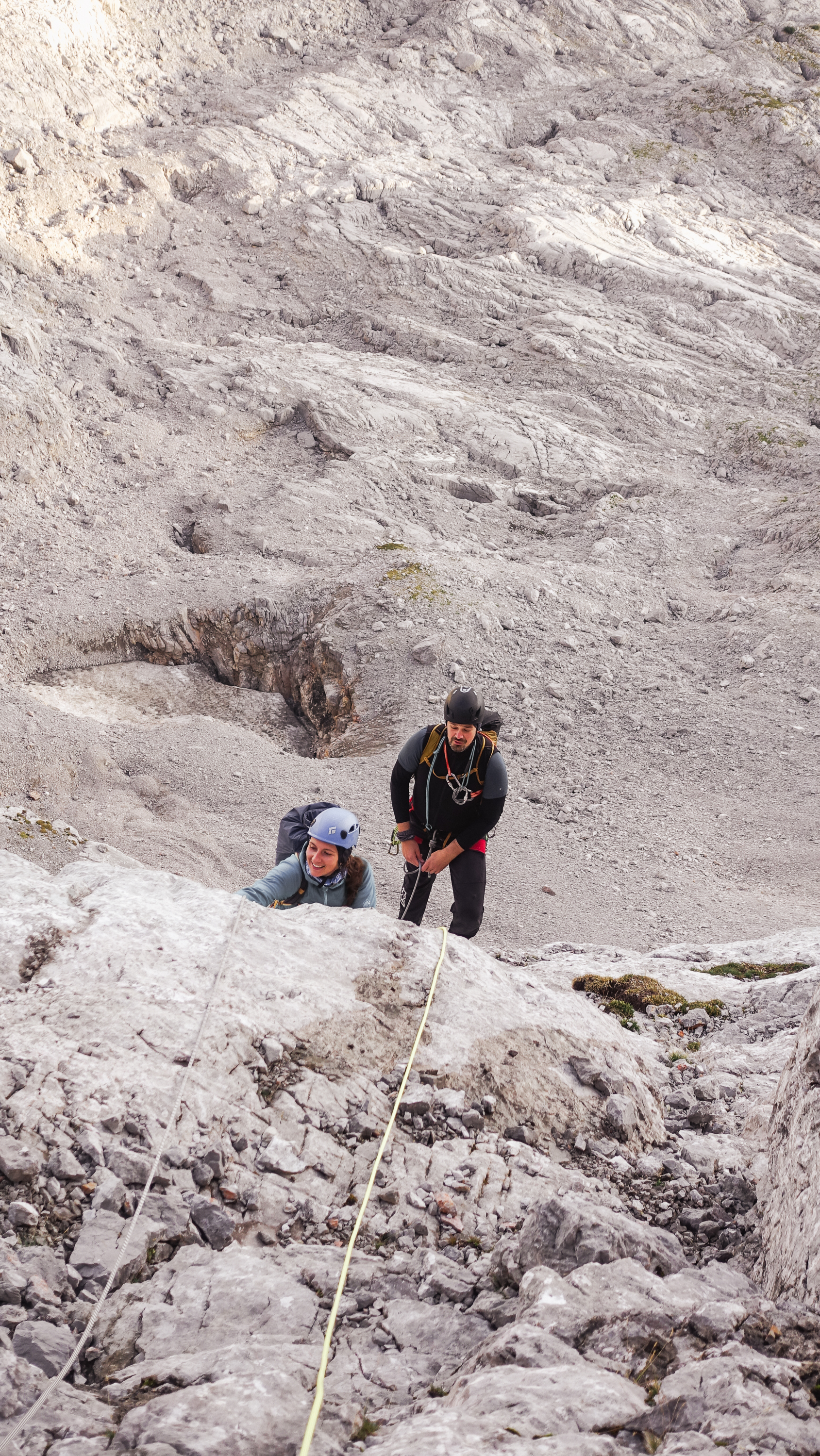 Was „gut abgesichert“ heißt in den Loferer Steinbergen wissen wir jetzt auch. Die Schlüsselstellen bzw. Kletterstellen sind wirklich gut gesichert, aber der Weg über Bruch und Schotter ist gänzlich ohne Zwischenhaken, mobile Sicherungen können dort kaum gelegt werden.
