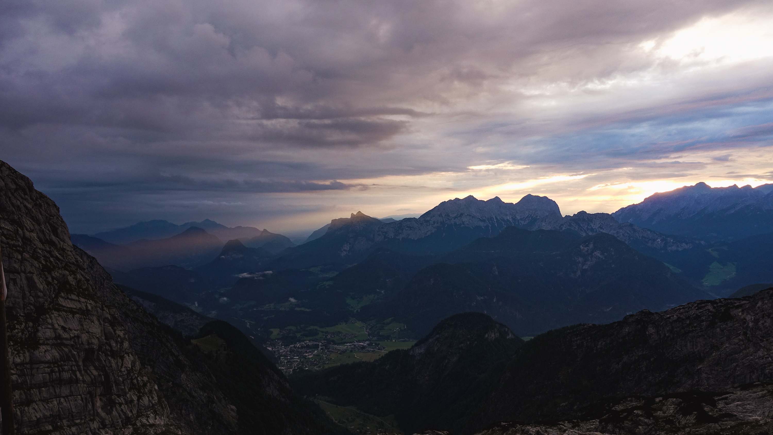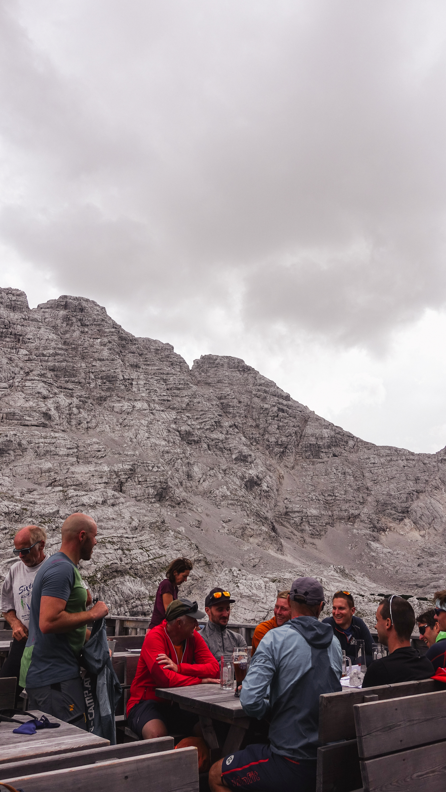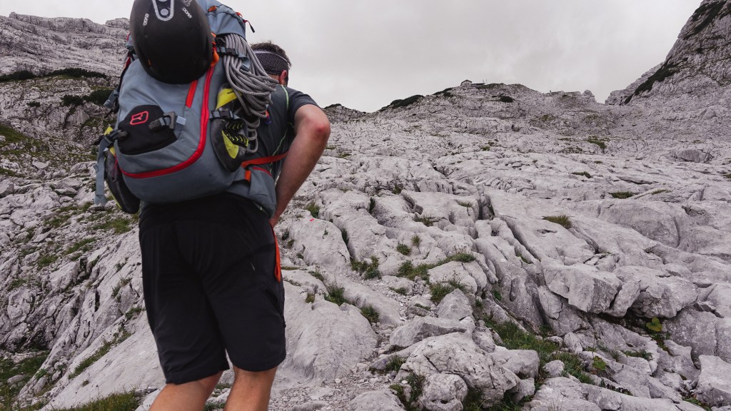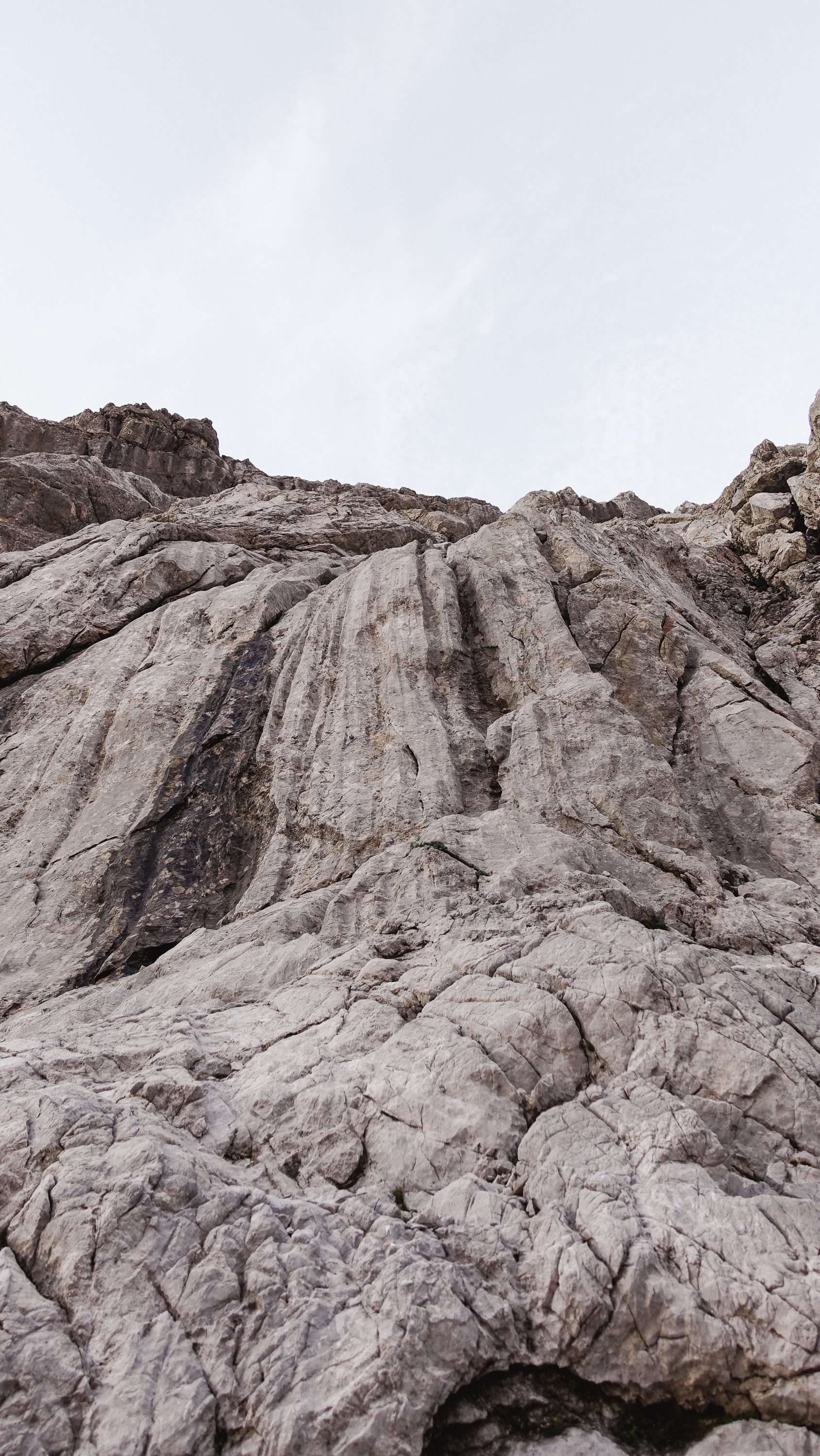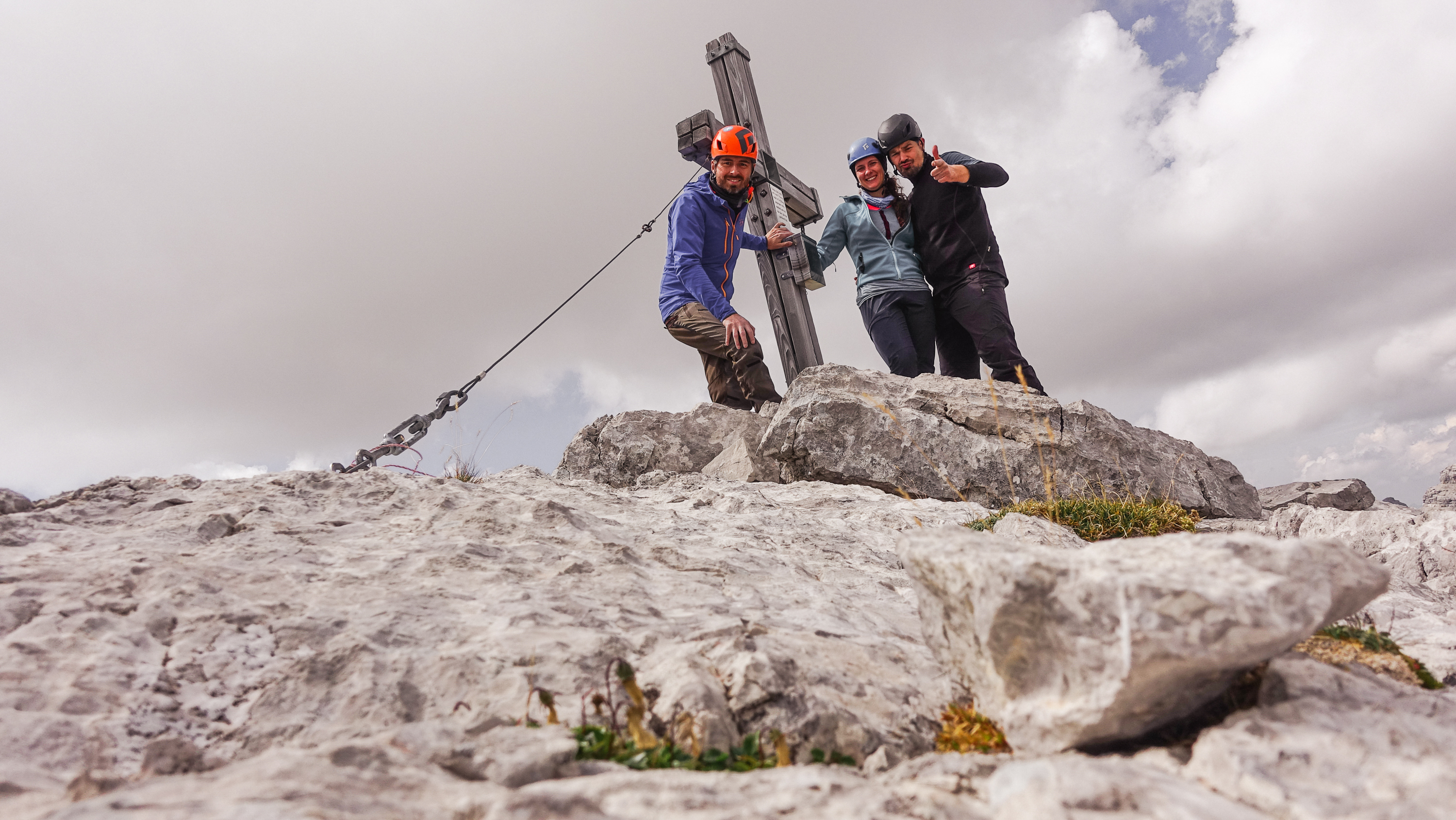 Was „gut abgesichert“ heißt in den Loferer Steinbergen wissen wir jetzt auch. Die Schlüsselstellen bzw. Kletterstellen sind wirklich gut gesichert, aber der Weg über Bruch und Schotter ist gänzlich ohne Zwischenhaken, mobile Sicherungen können dort kaum gelegt werden.