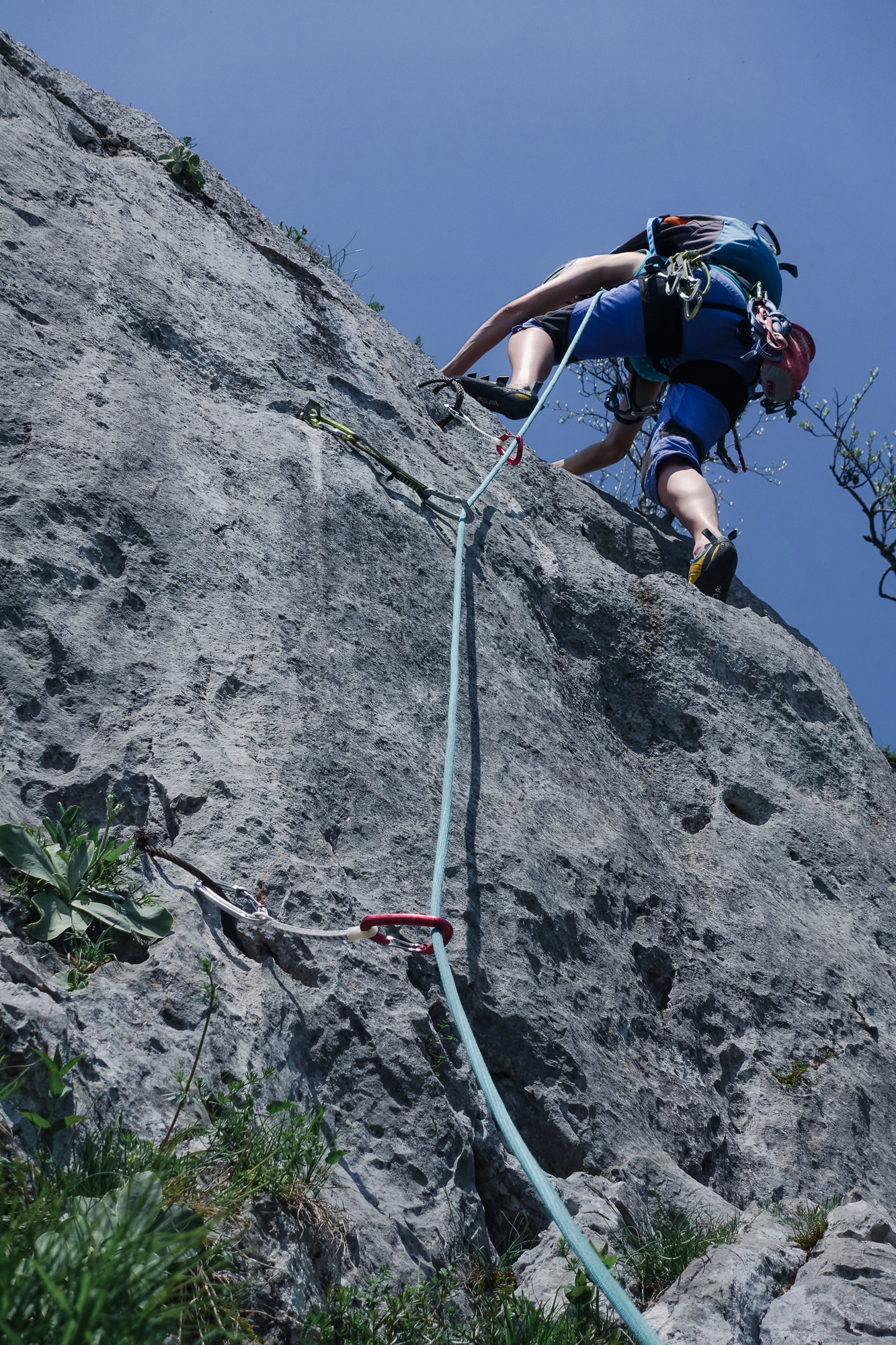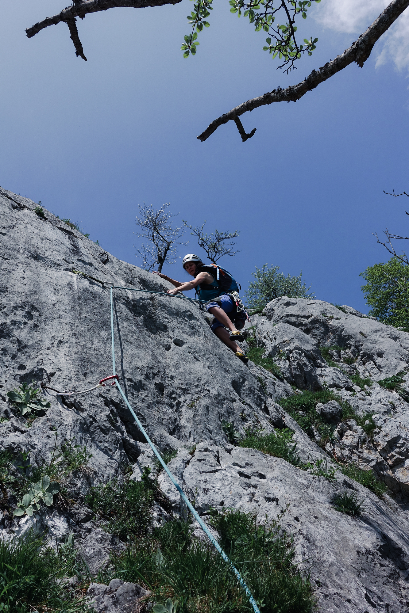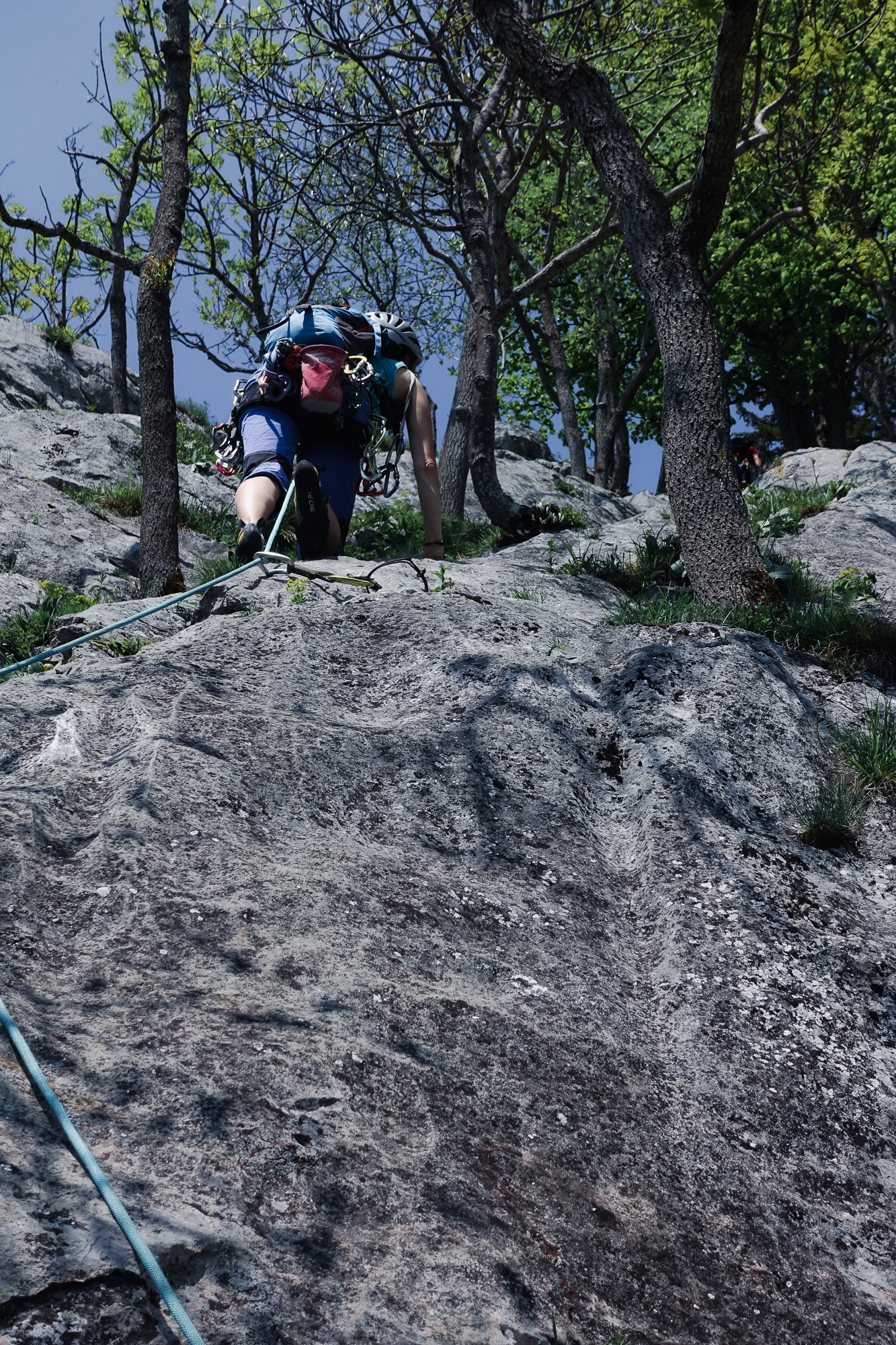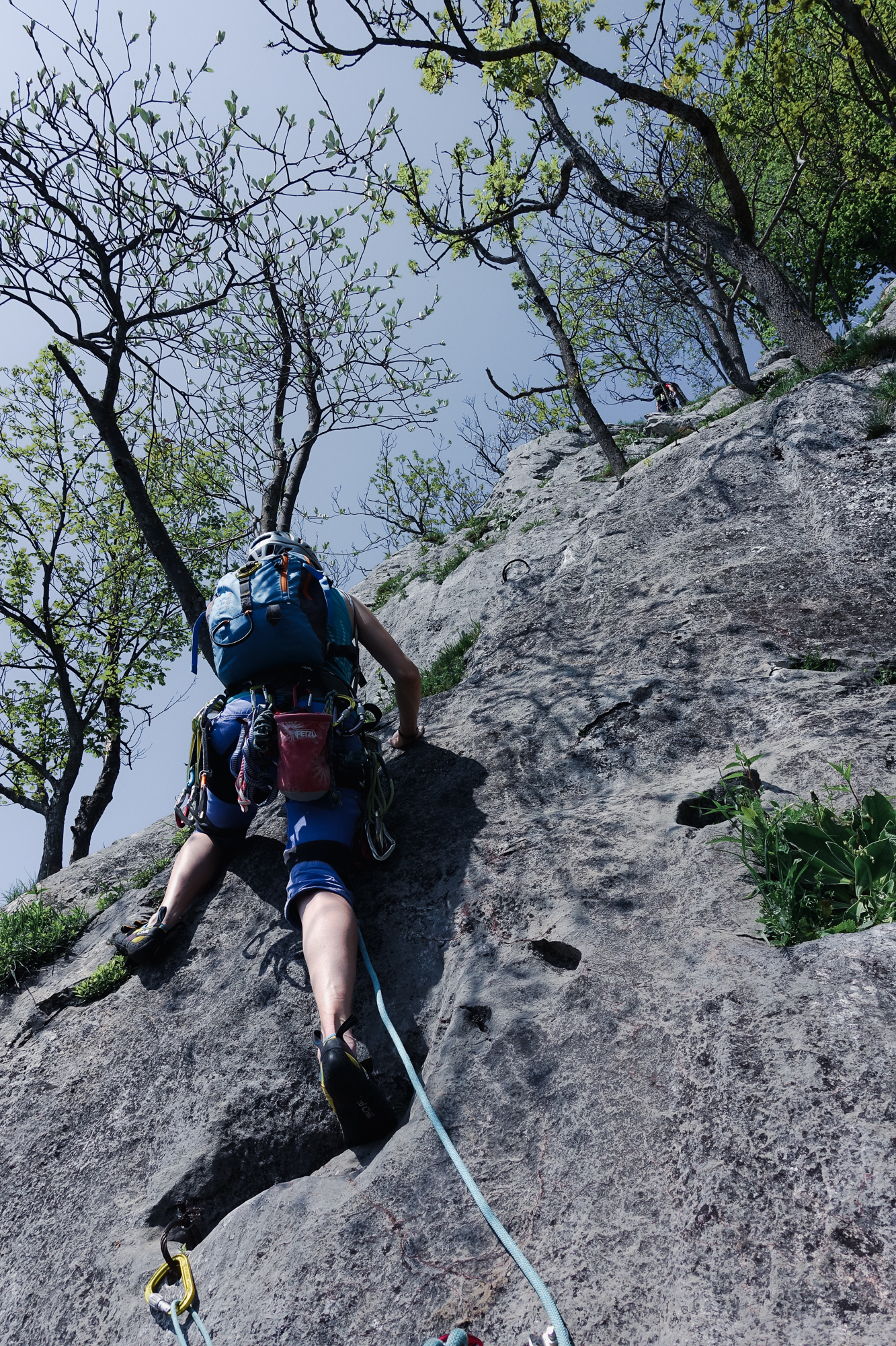 Doch die folgenden Seillängen können leider nicht daran anschließen. Es gibt aber kompakten Fels und kürzere Kletterstellen, die alle sehr eng abgesichert sind. Die 5- Stelle ist ein Aufsteher über einen Bauch, der ein wenig unübersichtlich ist aber mit großen Griffen wartet.