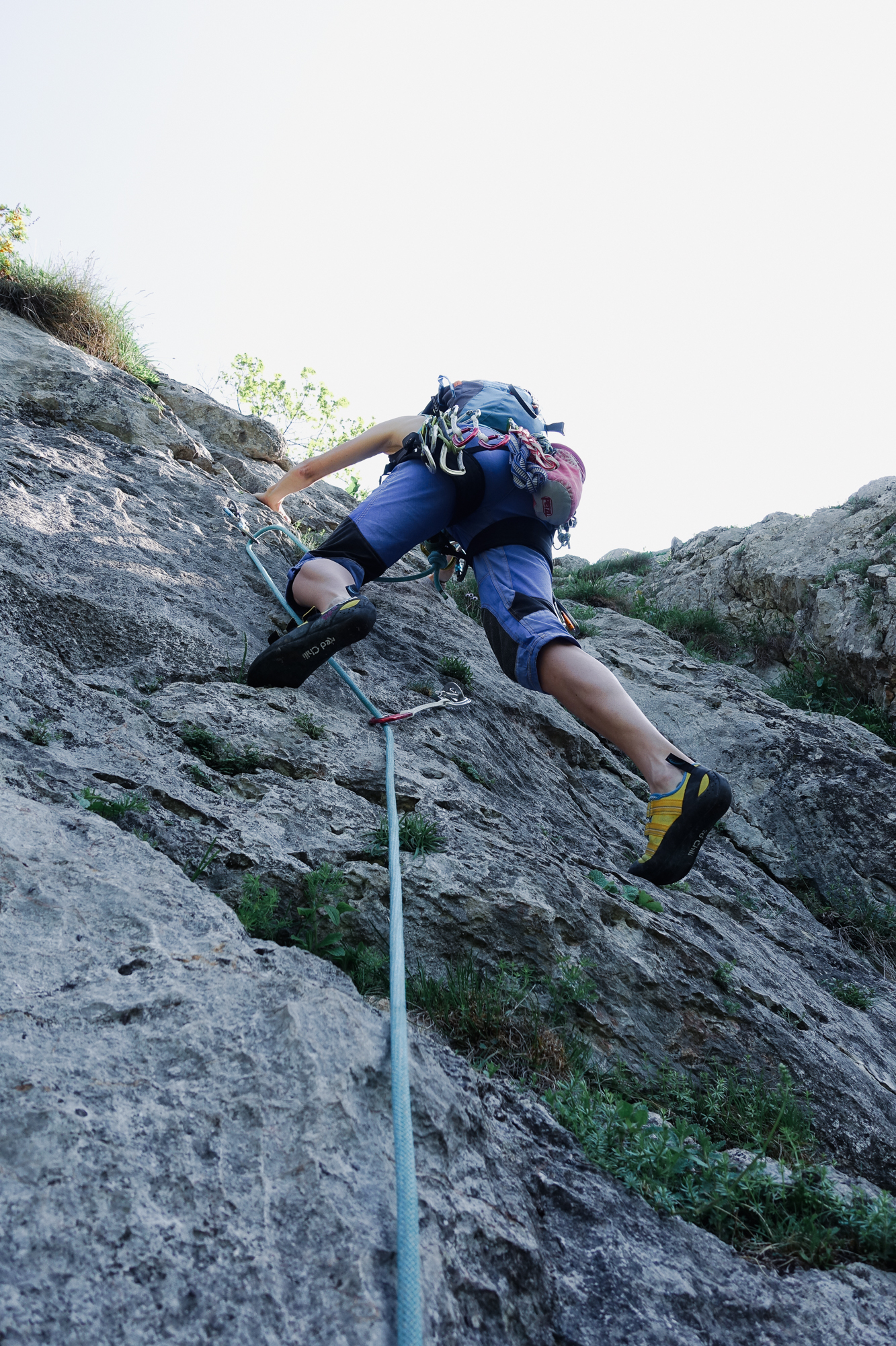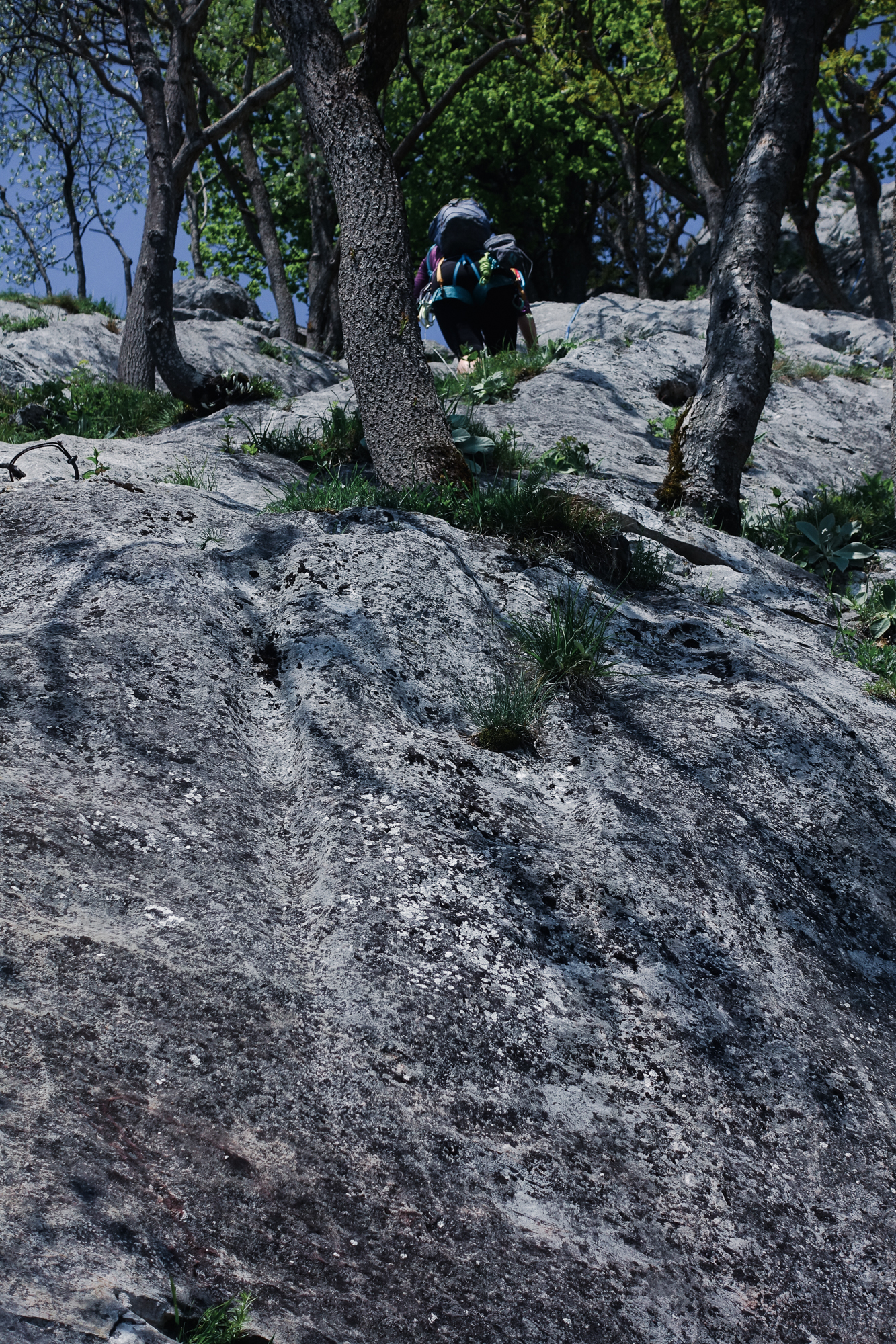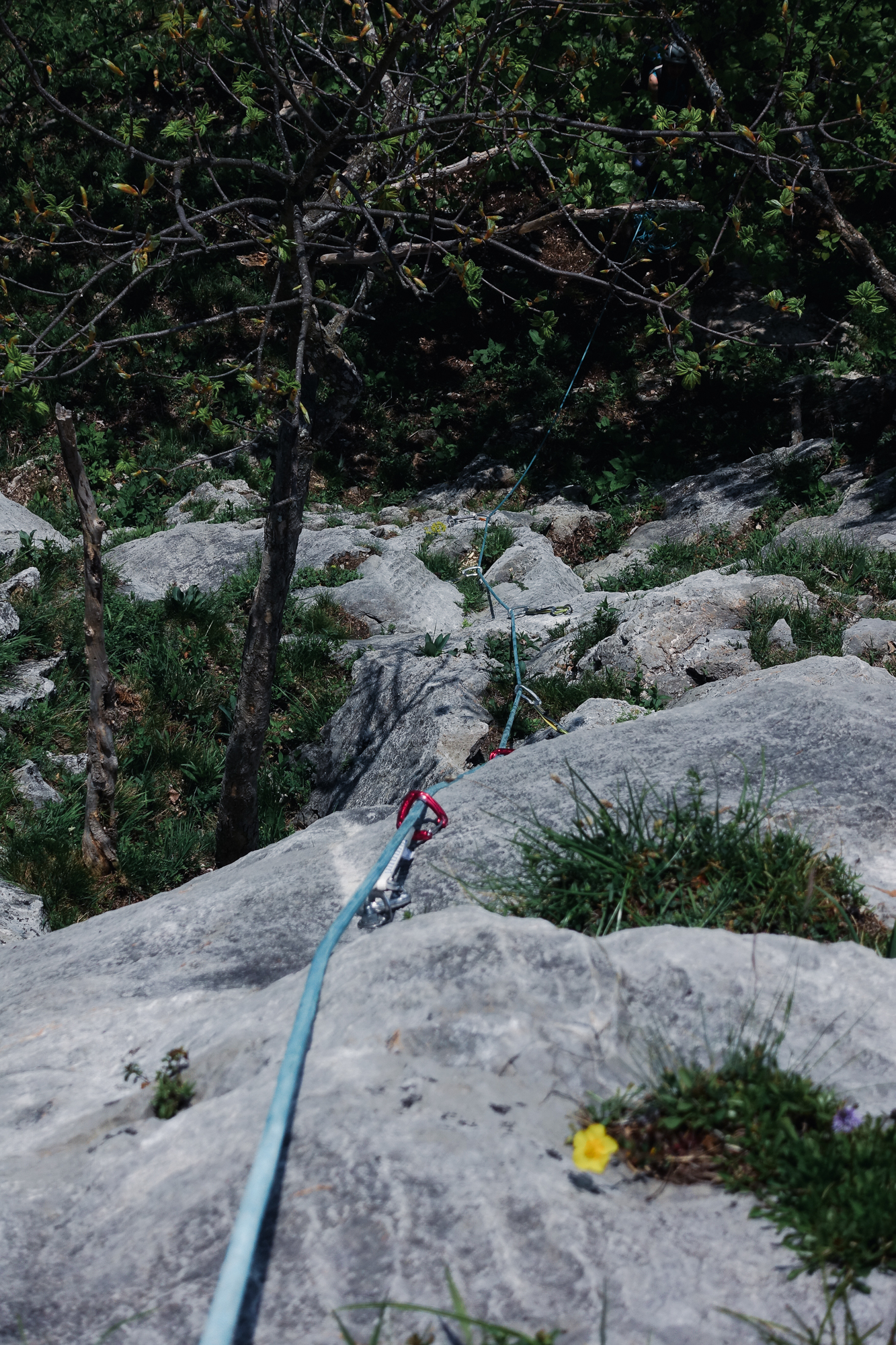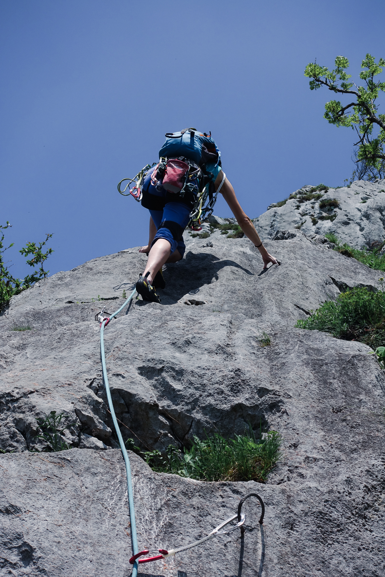Doch die folgenden Seillängen können leider nicht daran anschließen. Es gibt aber kompakten Fels und kürzere Kletterstellen, die alle sehr eng abgesichert sind. Die 5- Stelle ist ein Aufsteher über einen Bauch, der ein wenig unübersichtlich ist aber mit großen Griffen wartet.