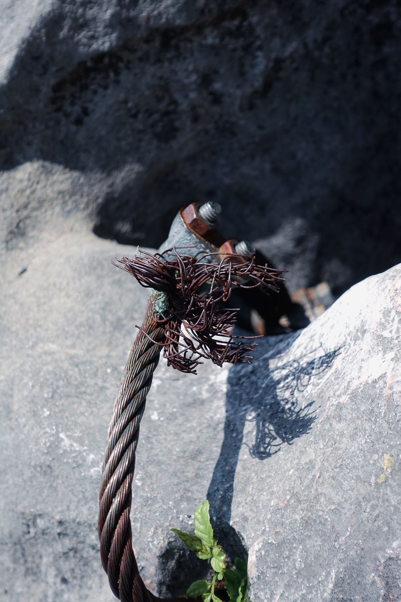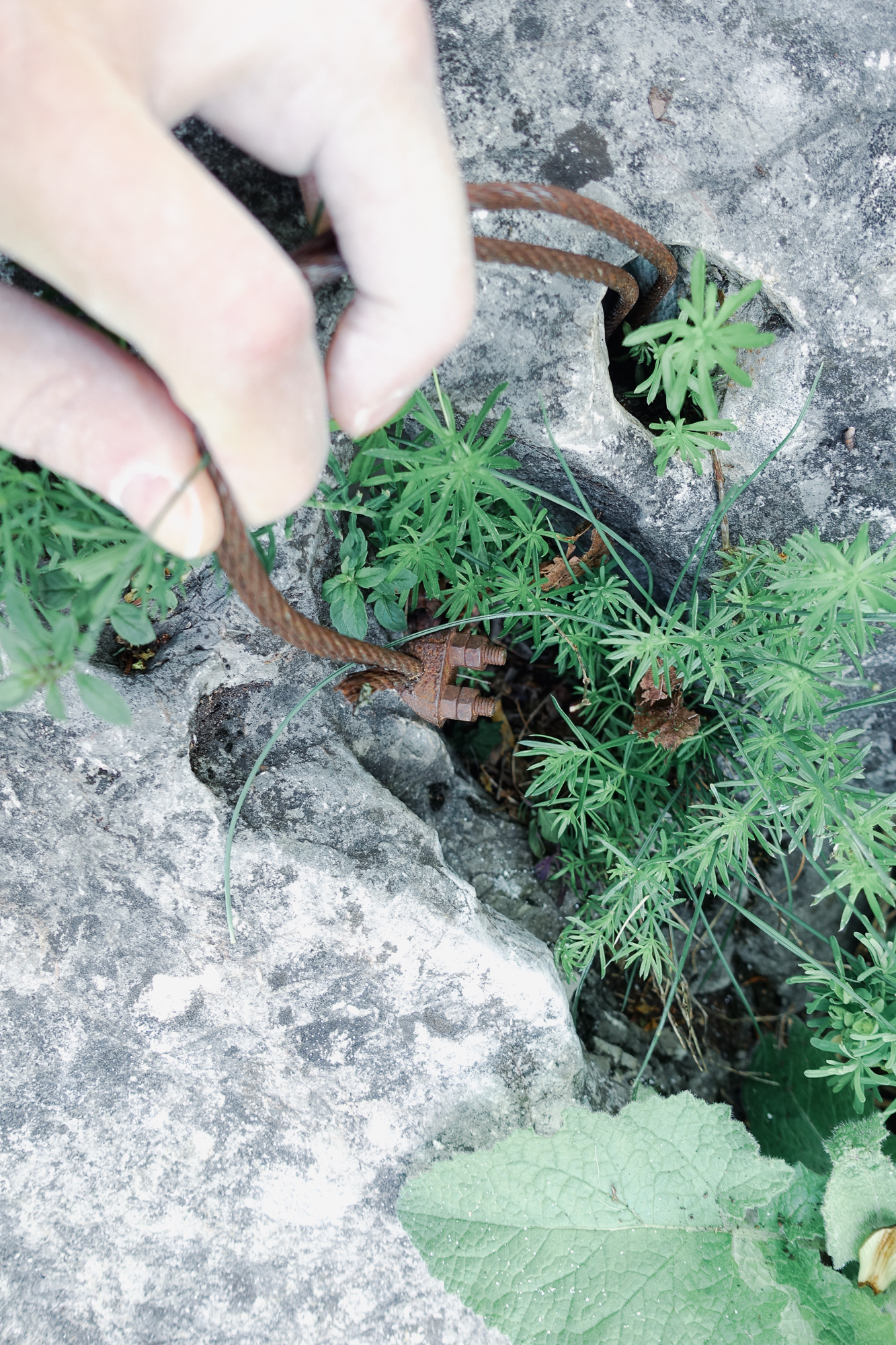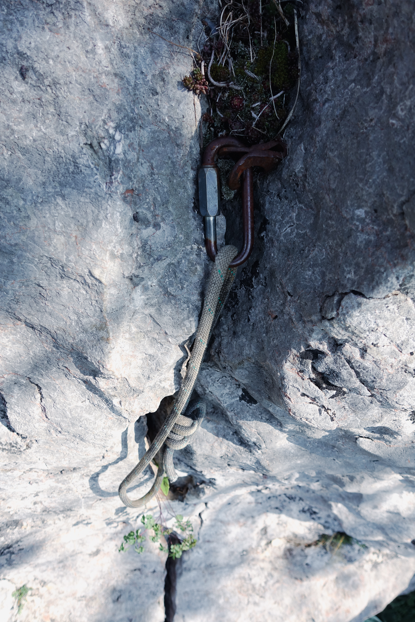 Was mir allerdings schon hier aufgefallen ist, und was sich bis oben nicht ändern wird, ist die wirklich enge Absicherung dieser Route. Ein Luxus, wären da nicht die selbst zusammengeschusterten, rostigen Drahtsanduhren die ausgefranst mit einfachen Klemmen ohne selbstsichernde Muttern in die Route gebohrt wurden. Für diese Art der Altmetallentsorgung würde ich mich genieren – aber wir haben an diesem Tag genommen was da ist, vor allem die Bohrhaken. 😉