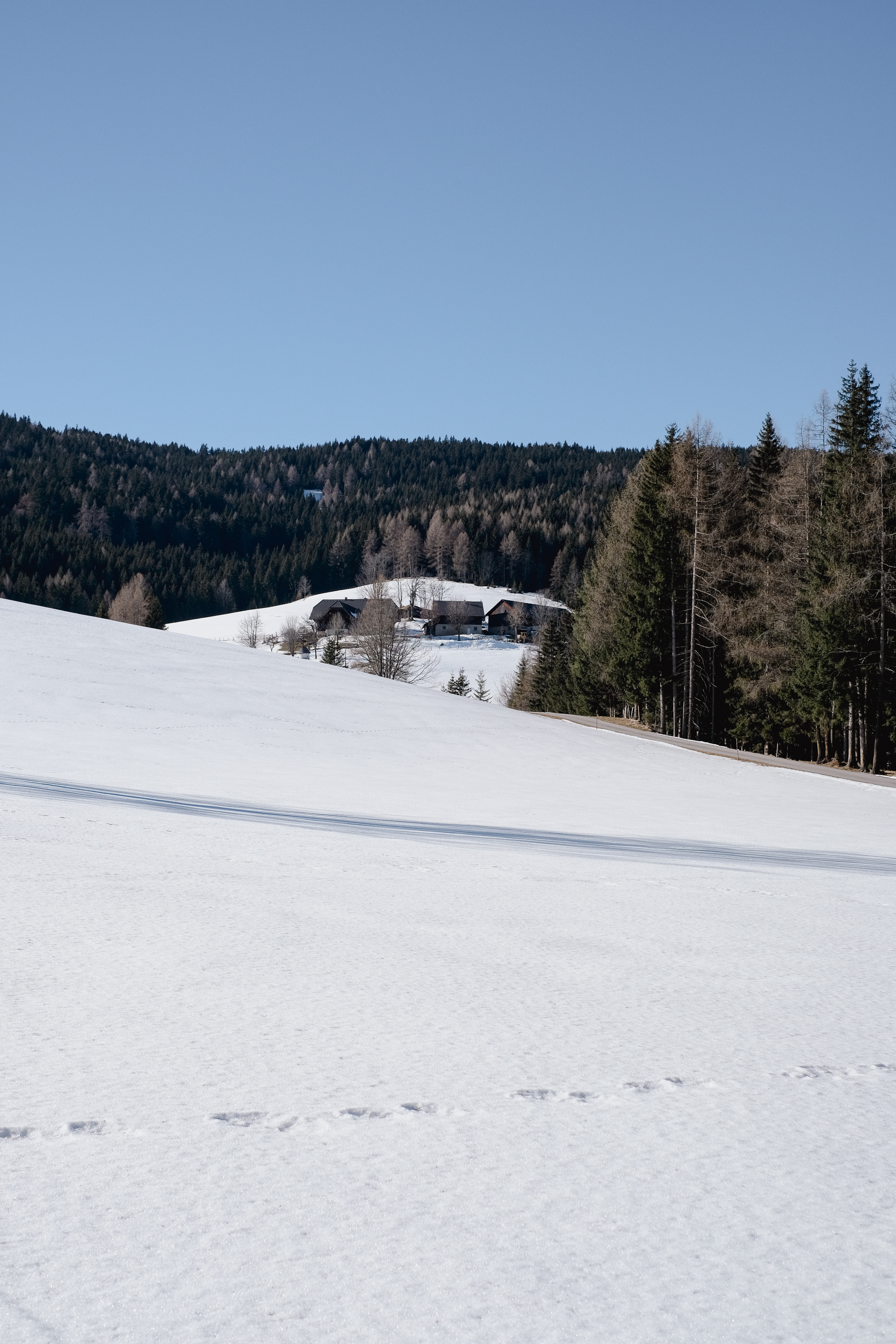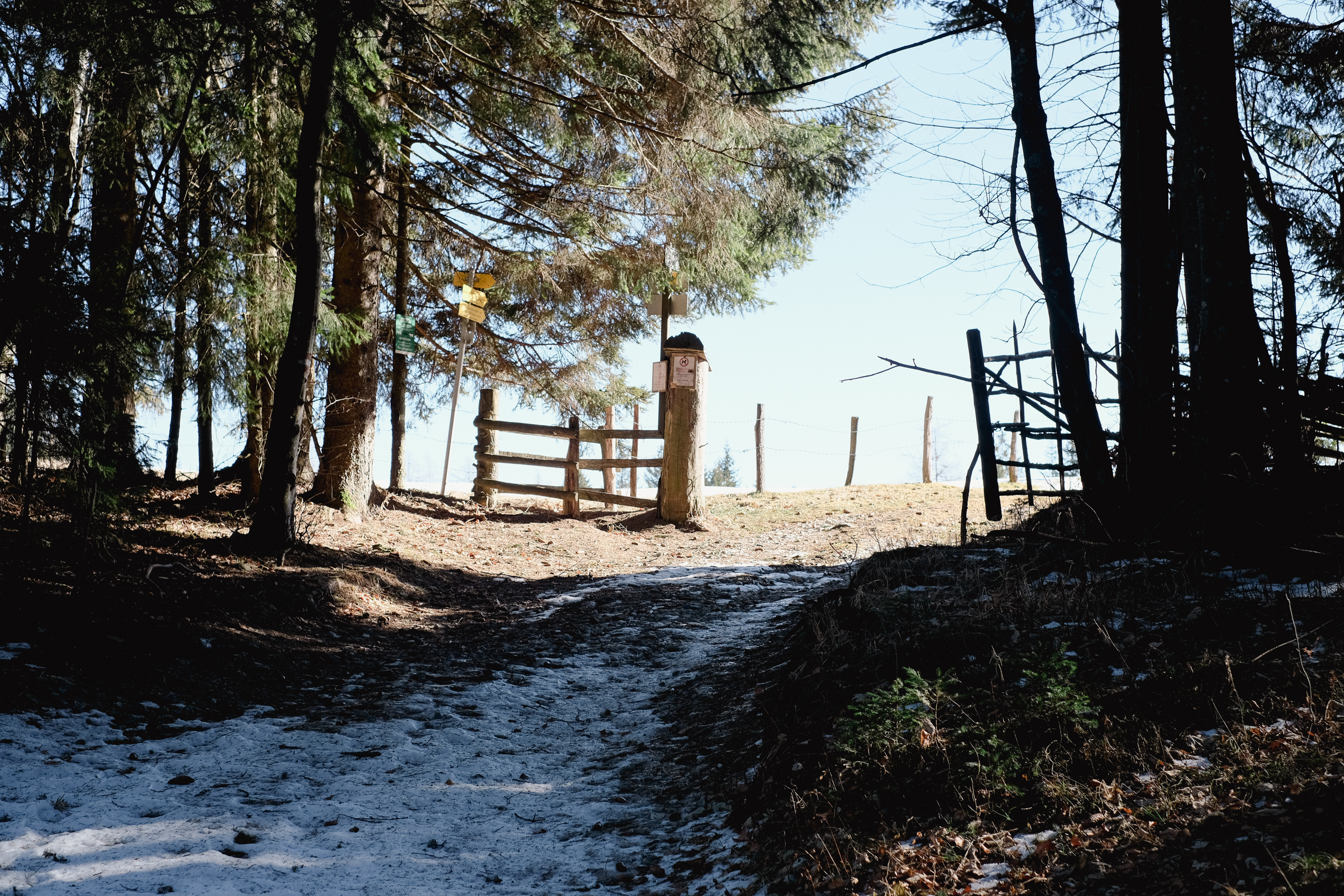 Jedenfalls navigierte uns mein Smartphone gemütlich über die Autobahn nach Modriach zu unserem Ausgangspunkt, dem ehemaligen Gasthaus Reinischwirt. Vorbei am Gasthaus Klug ging es einer Schotterstraße dem Modriachwinkel Bach entlang bis wir vor einem vereisten Weg standen, den wir hätten noch folgen sollen. Das ist das erste Mal, dass uns Google Maps irgendwo in die Pampa geschickt hat, wo es nicht mehr weiterging. Also das Auto an den Straßenrand geparkt und von wo auch immer wir waren, ging es zu Fuß weiter. Da Wanderwegmarkierungen sichtbar waren, folgten wir denen mit einer leichten Vermutung Richtung Schrogentor unterwegs zu sein.