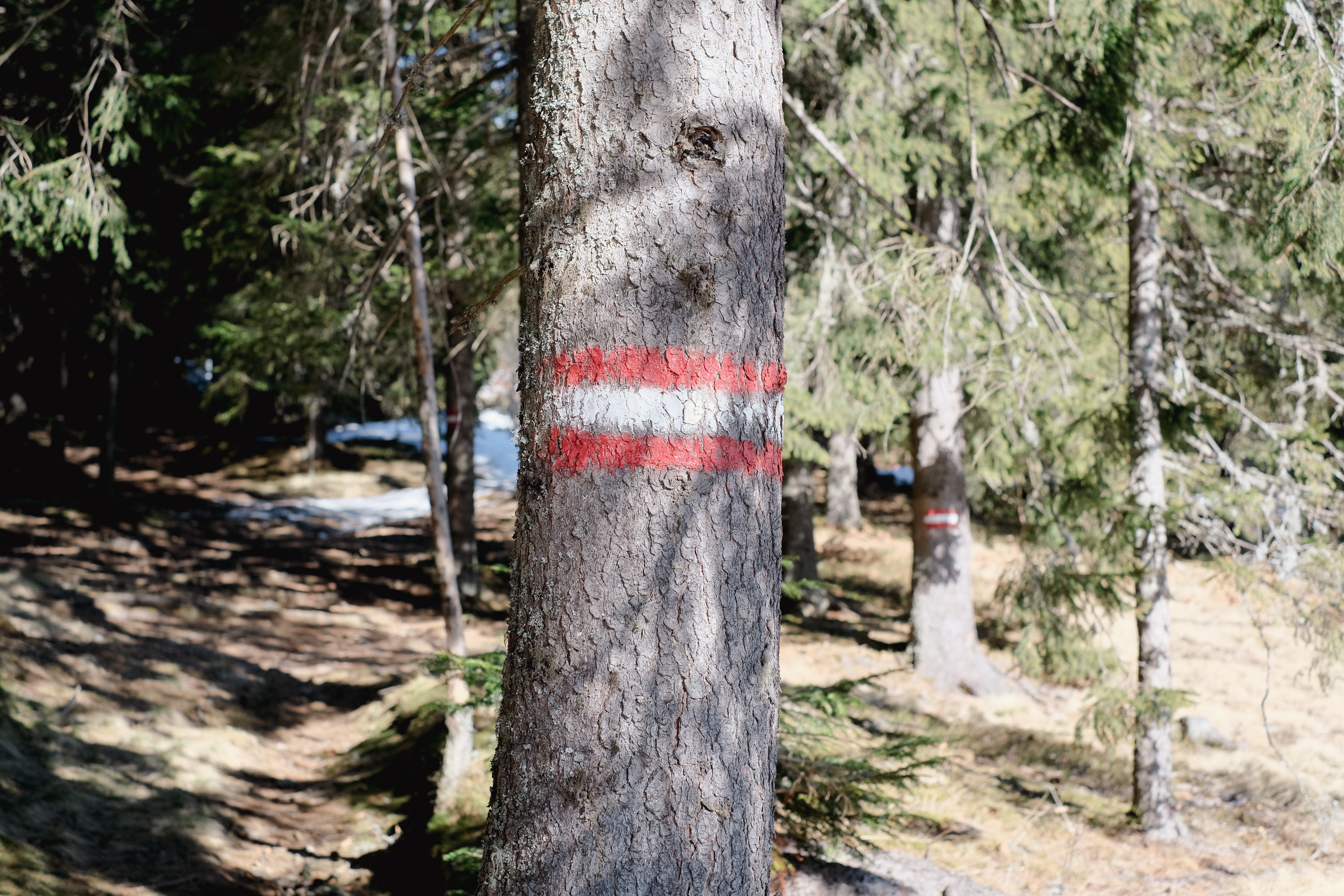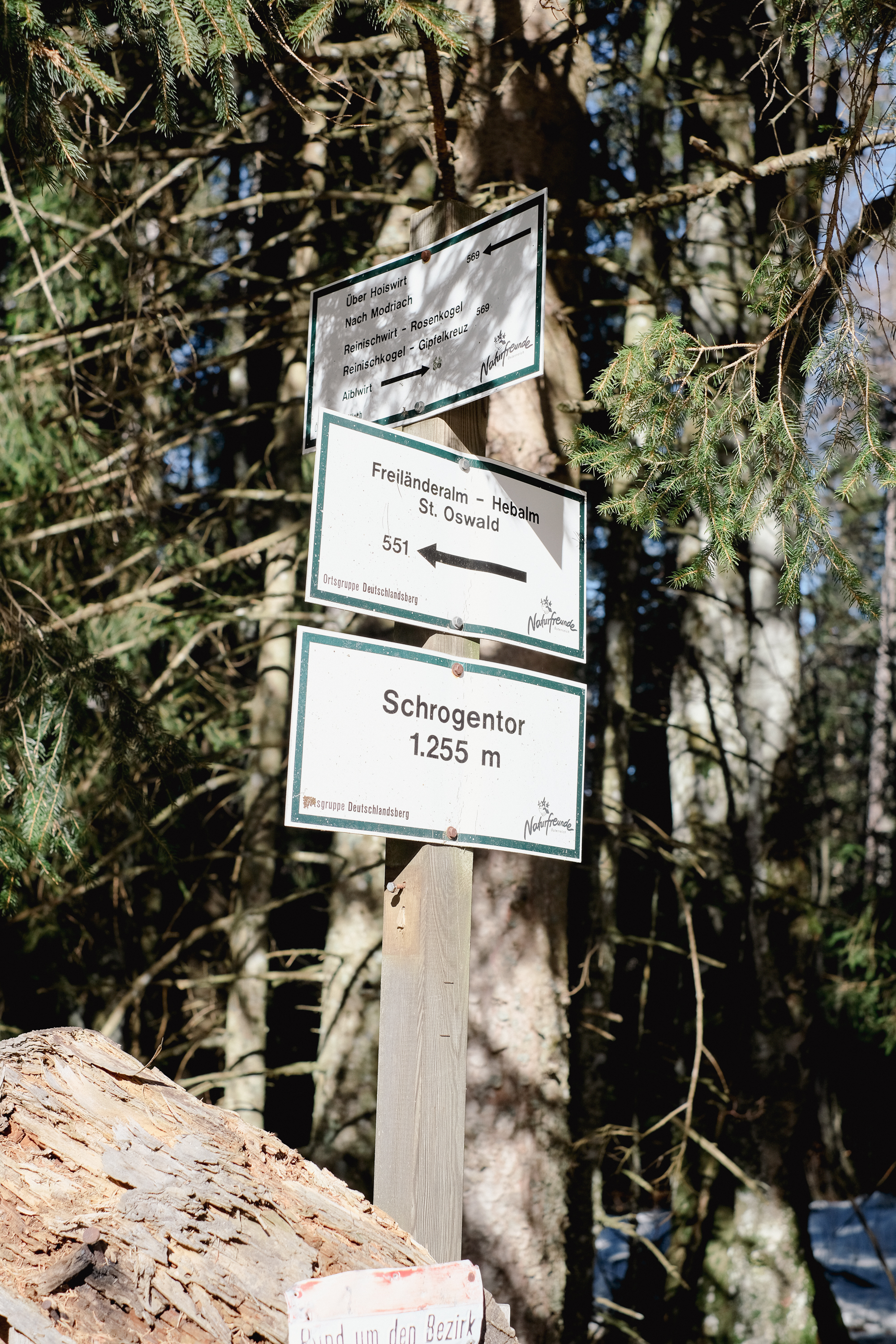 Spätestens ab dem Schrogentor (was aktuell eher ein unspektakuläre Gatter ist) wanderten wir wunderbar in der Sonne, unterbrochen von kleineren Waldabschnitten, immer wieder auf ein wildes Sammelsurium an Wandertaferln, vonhandgeschriebenen Holztafeln über die gelben Taferln vom Tourismusverband, Naturfreundetaferl und grüne Taferl mit den Wanderwegnummern. Hier wurde definitiv nicht mit Informationen gegeizt.