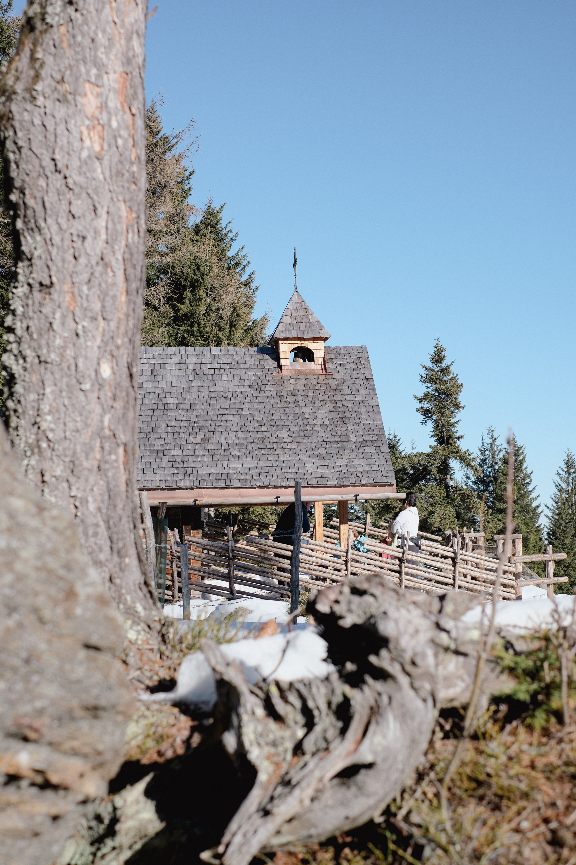 An einem Baum mit Tränke konnten wir eine kurze Pause einlegen und den Ausblick genießen auf die Windräder der Handalm und dahinter leuchtete auch die Koralm hervor. Vorbei an der Albrechtkapelle, die etwas abseits vom Weg liegt, aber mitgenommen haben wir sie trotzdem, ging es nun etwas bergauf, schließlich mussten noch ein paar Höhenmeter gemacht werden, bis wir auch am Gipfelkreuz und der kleinen Kapelle mit Friedensglocke angekommen sind.