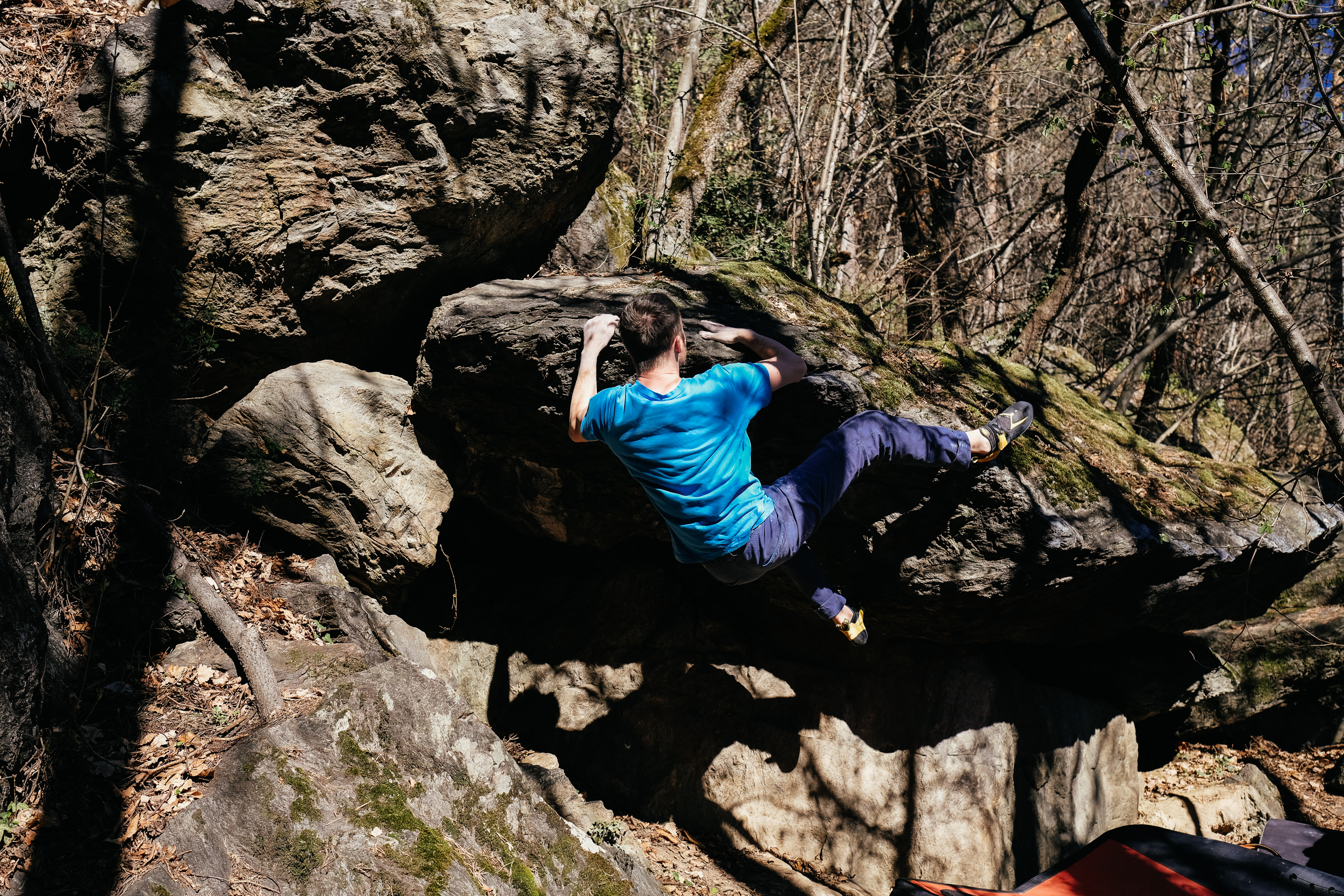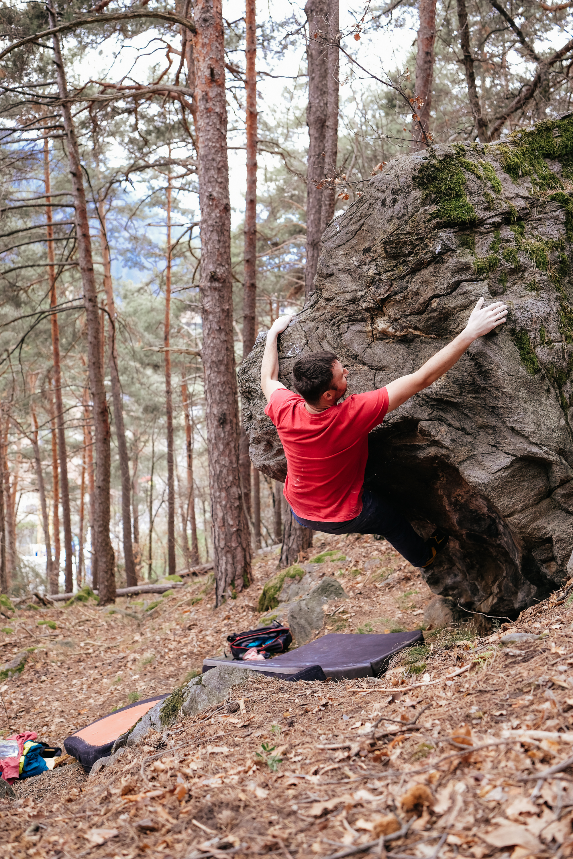 Die anderen Blöcke sahen ganz ok aus und wir machten ein paar Boulder am Block 2, einfach aber richtig nett und rauer Fels. Da es schon relativ spät war, gingen wir zurück zum Sektor Konrad, wo die Blöcke nun frei waren und ich versuchte ob mir die „Last minute“, ein 7A Boulder, vielleicht gut reinlaufen würde. Die Schlüsselstelle aus den guten Untergriffen auf eine etwas garstige Leiste konnte ich zwar machen, danach war aber Schluss, auch weil der Spotterin schon kalt war.