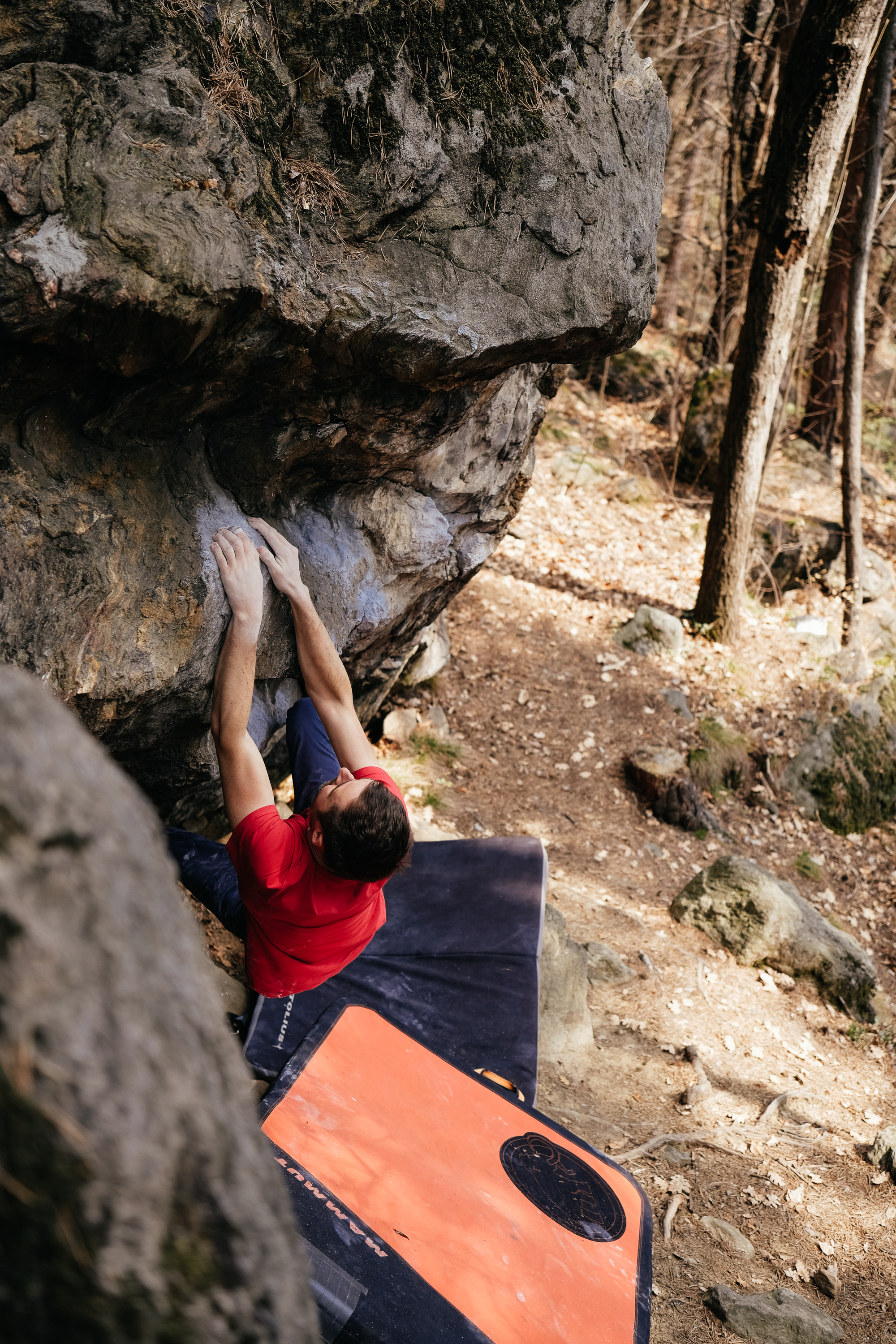 Auf dem Weg nach unten blieben wir beim Block 6 stehen, der eine leider unbenamste 6C+ mit Stehstart und sehr schlechten Tritten bot. Nachdem der 1. Zug auf eine bessere Delle so halbwegs gut lief, musste ich nur noch den linken Fuß auf einen sehr seichten Reibungstritt setzen und über den auf den Henkel springen. Der Ausstieg war zwar etwas hoch aber mit guten Griffen kam ich locker drüber – richtig feiner Boulder und hat mir sehr getaugt!