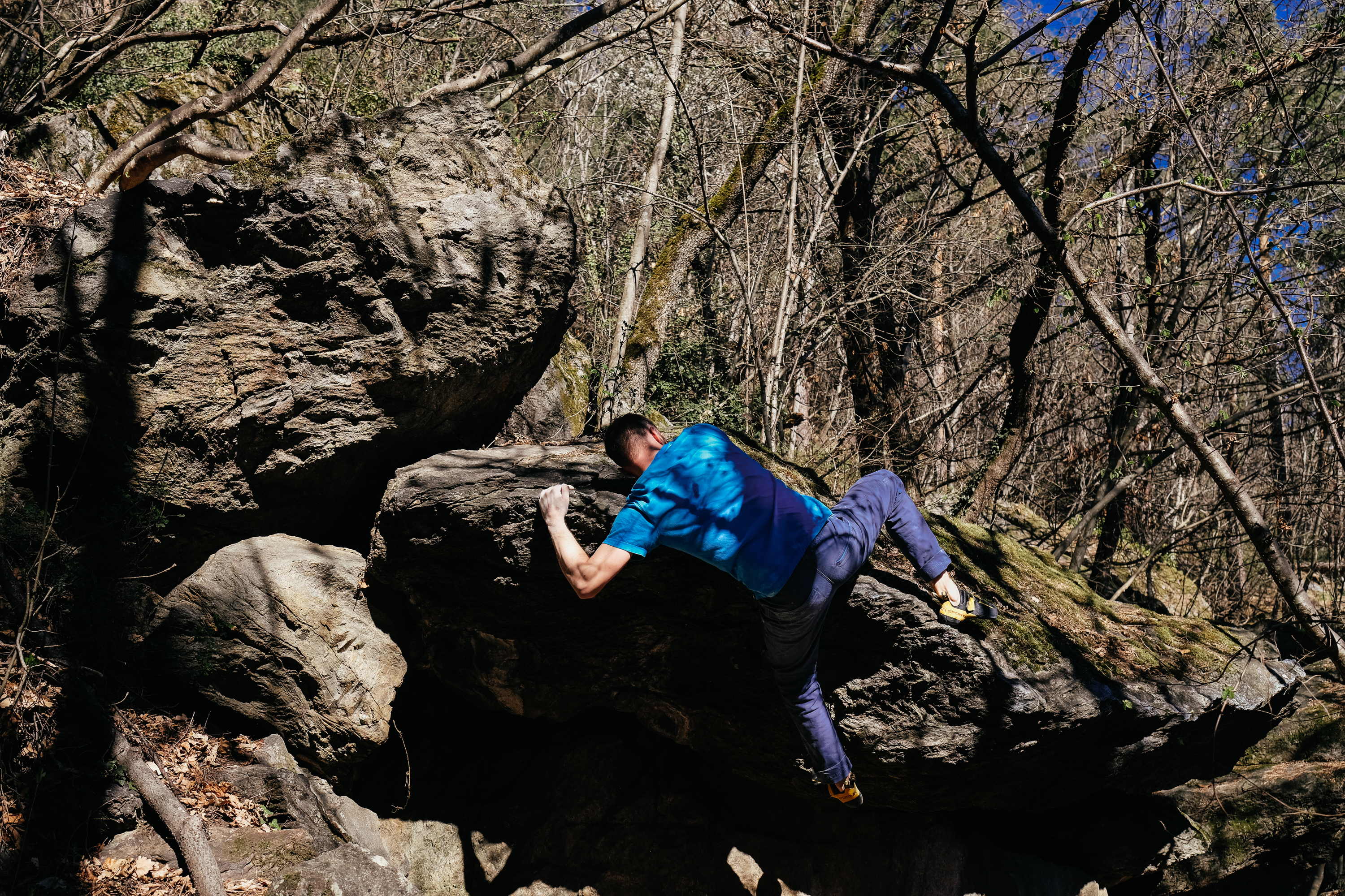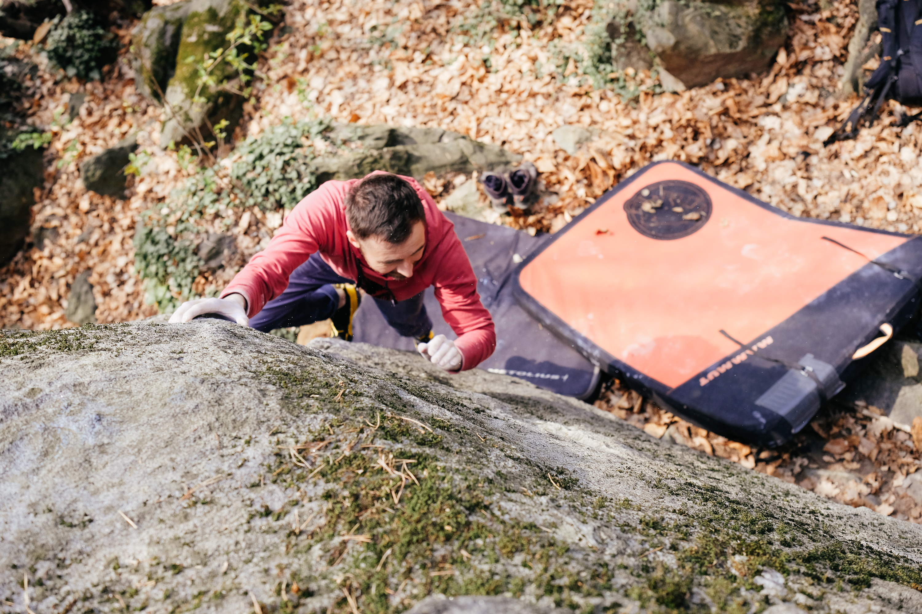 Die Blöcke liegen relativ knapp nebeneinander, man geht innerhalb eines Sektors nie länger als 1 – 2 Minuten bis man beim nächsten Block ist und sofern man bis 7A bouldern kann, hat man auch etwas zu tun. Begonnen haben wir mit Aufwärmen und bouldern am Block 29, relativ niedrig und sehr undankbare Linien aber die Finger waren danach gut aufgewärmt. Weiter ging es am „Gripmaster“-Block wo eine technische Platte wartete und die Starts für uns ungewohnt hart waren. So rau der Gneiss auch ist, so gerne rutschen auch die Schuhe von den Tritten gerade dann, wenn man sie am notwendigsten hat. So flashte ich hier einmal nichts sondern konzentrierte mich darauf, den Druck auf den Schuhen zu lassen, dann „pickten“ sie am Fels.