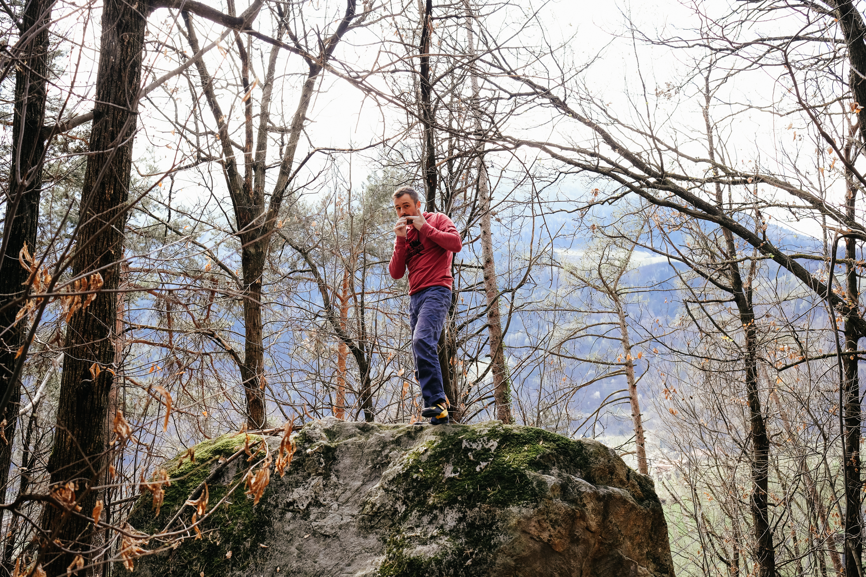 Die ersten Blöcke befinden sich gleich neben dem Wanderweg (kurz nach dem Waldrand) und wurden heute von einigen Personen belagert, auch die oberen Blöcke waren gut frequentiert und wir beschlossen zum Sektor Schludenstein weiterzugehen, wo wir zwar alleine waren, uns aber keine der Linien gleich ansprach. Also nochmal weiter zum Sektor Eden, wo der Block Frauennussbaum gleich neben dem Wanderweg liegt. Leider haben sehr viele Boulder keinen Namen (zumindest laut Topo), also sind wir einfach die ansprechenderen Linien hier geklettert – viele waren es eh nicht, ich habe es mehr als Ruhetag genützt um die Haut auf den Fingern zu schonen. Der 6A Dyno war schon ganz lässig und die 6B an der Kante („Frauennussbaum“) verlangte etwas mehr Einsatz und versorgte mich auch gleich mit einem Abrutscher und einem aufgeschlagenen Schienbein. Definitiv zu viel Schmerzen für so einen Boulder bei dem die größte Schwierigkeit bestand, sich irgendwie raufzuwurschteln.
