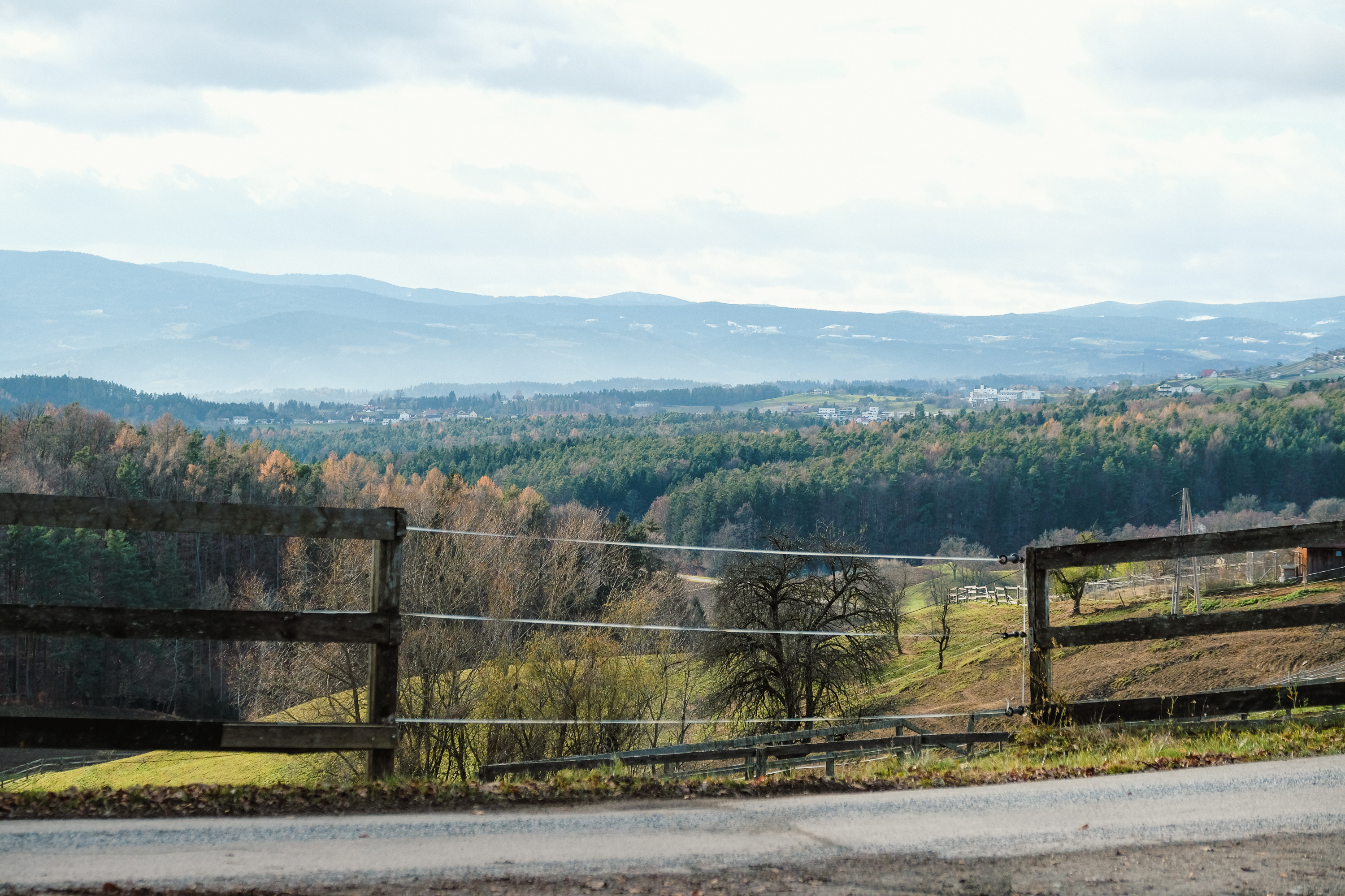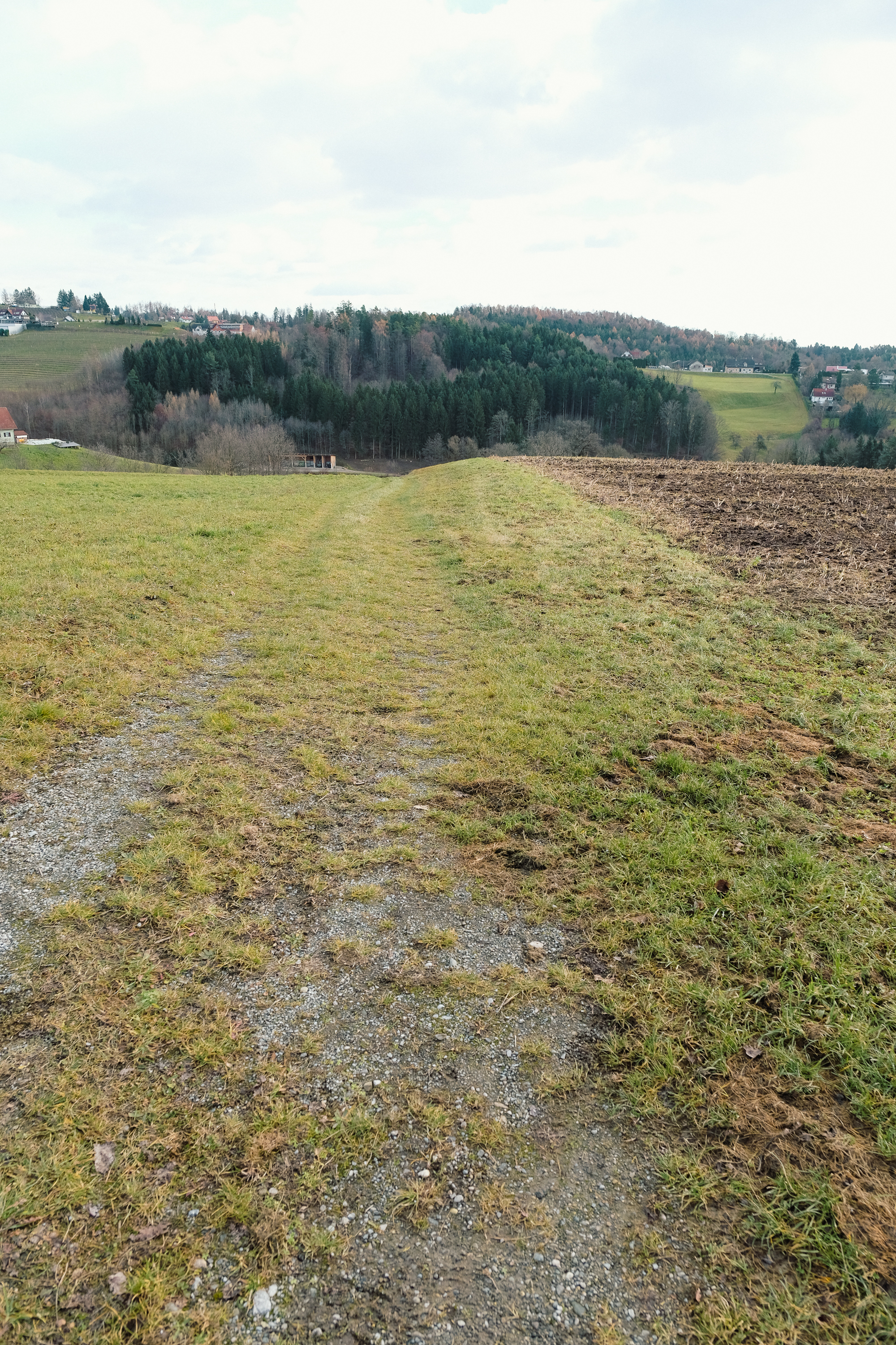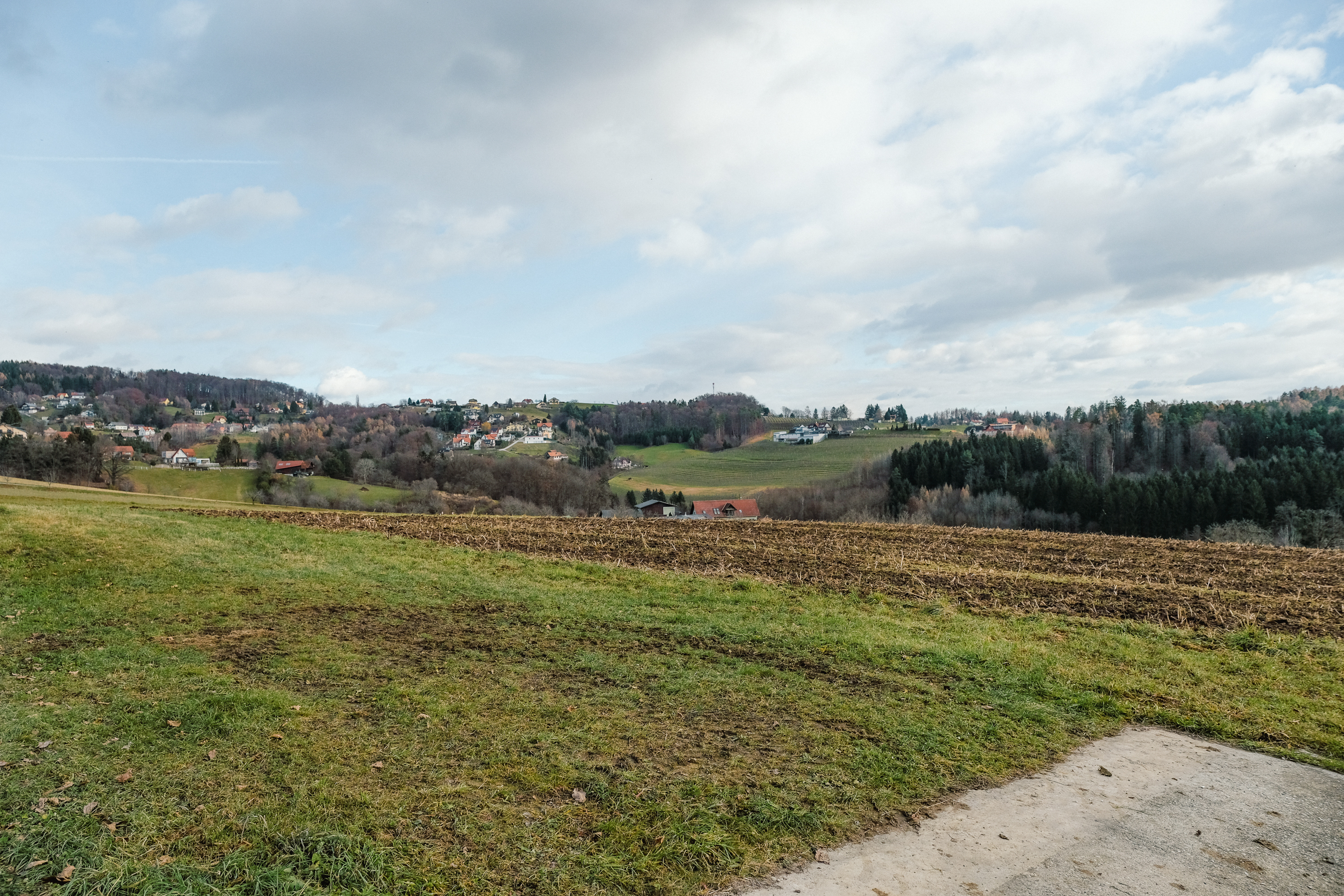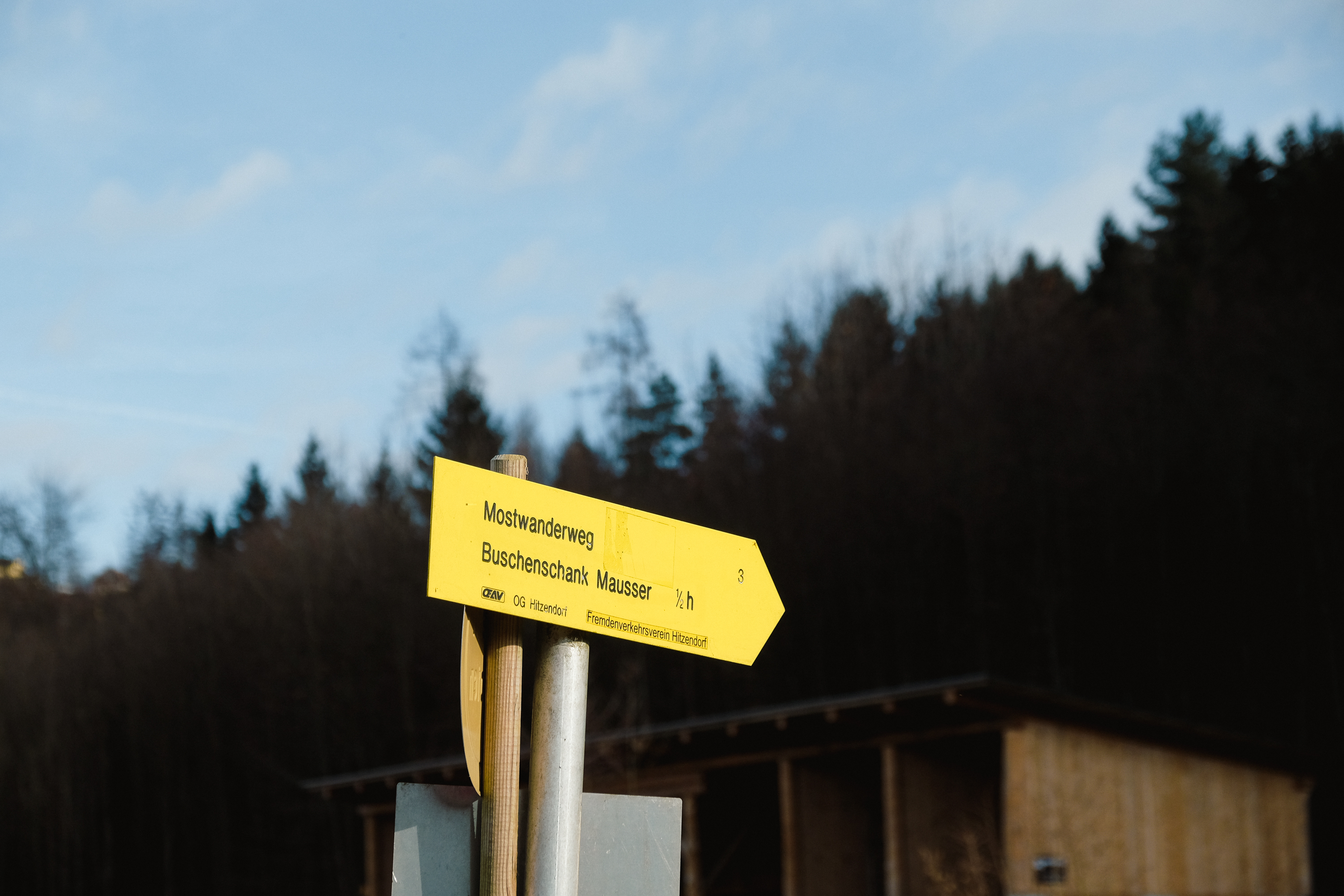 Bald ging es wieder aus dem Wald heraus und wir folgten teilweise Asphaltstraßen, Schotterstraßen und ein paar Abkürzungswegerl über oder neben Äcker waren auch dabei. Dabei mussten wir allerdings fast die ganze Zeit das Handy im Auge behalten, da bei diesem Weg relativ viel Abzweigungen genommen werden müssen um auch richtig unterwegs zu sein. Kurze Aussichten auf die umliegenden Hügel und Mausser Most sind eher unspannend aber viel mehr darf man sich auf dieser Wanderung nicht erwarten. Hier folgten wir auch dem Mostwanderweg bis zur Steinbergschleife und mussten wieder einmal neben der Straße gehen da wir die Landesstraße nicht zwei Mal queren wollten.